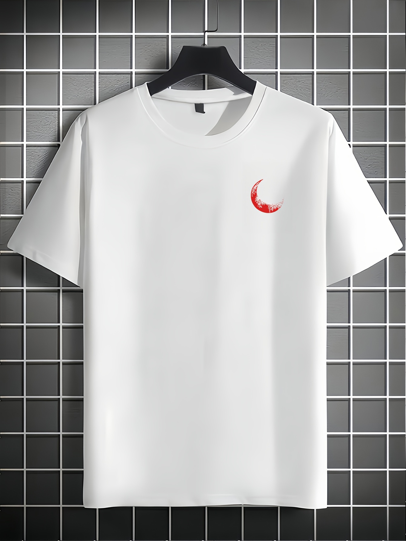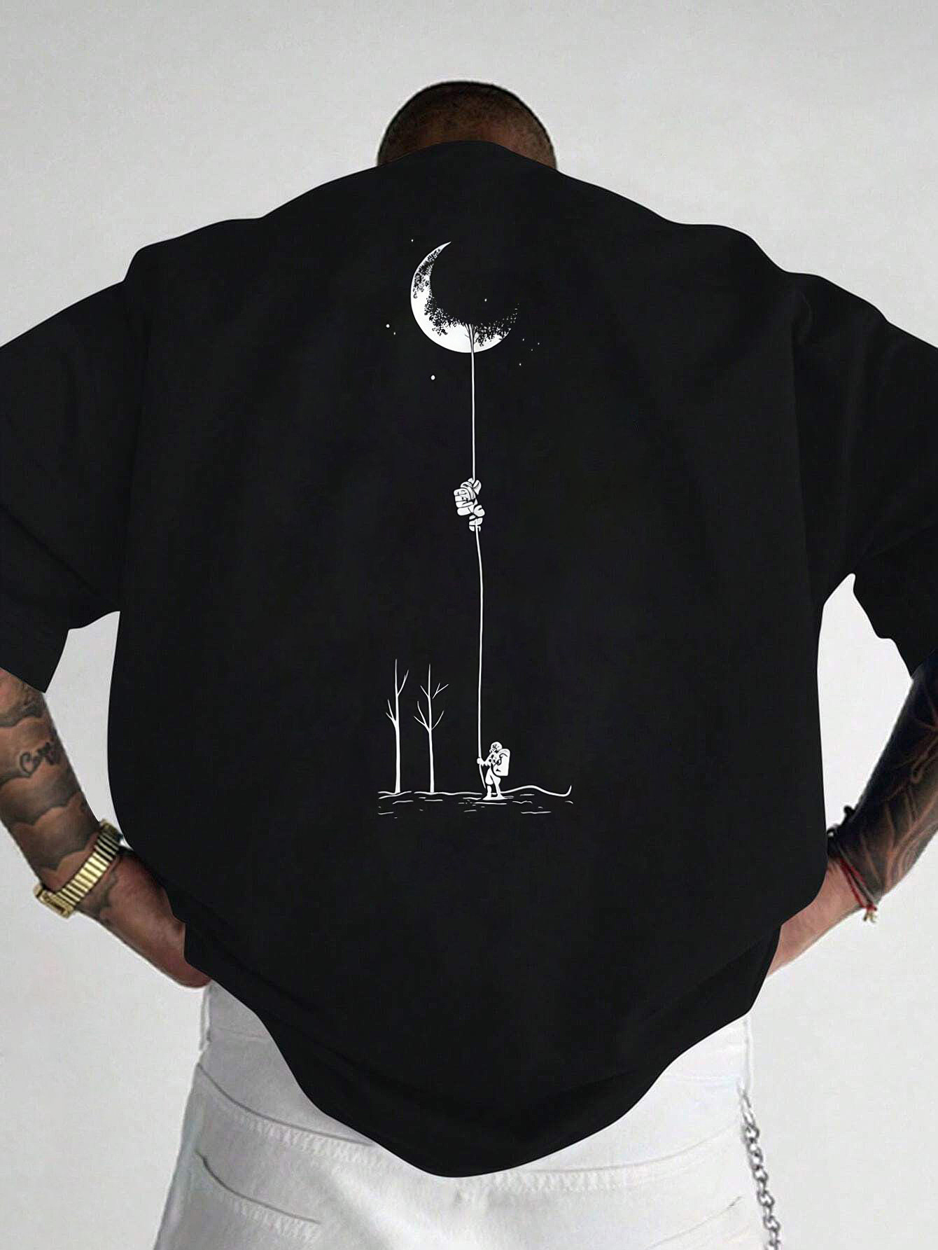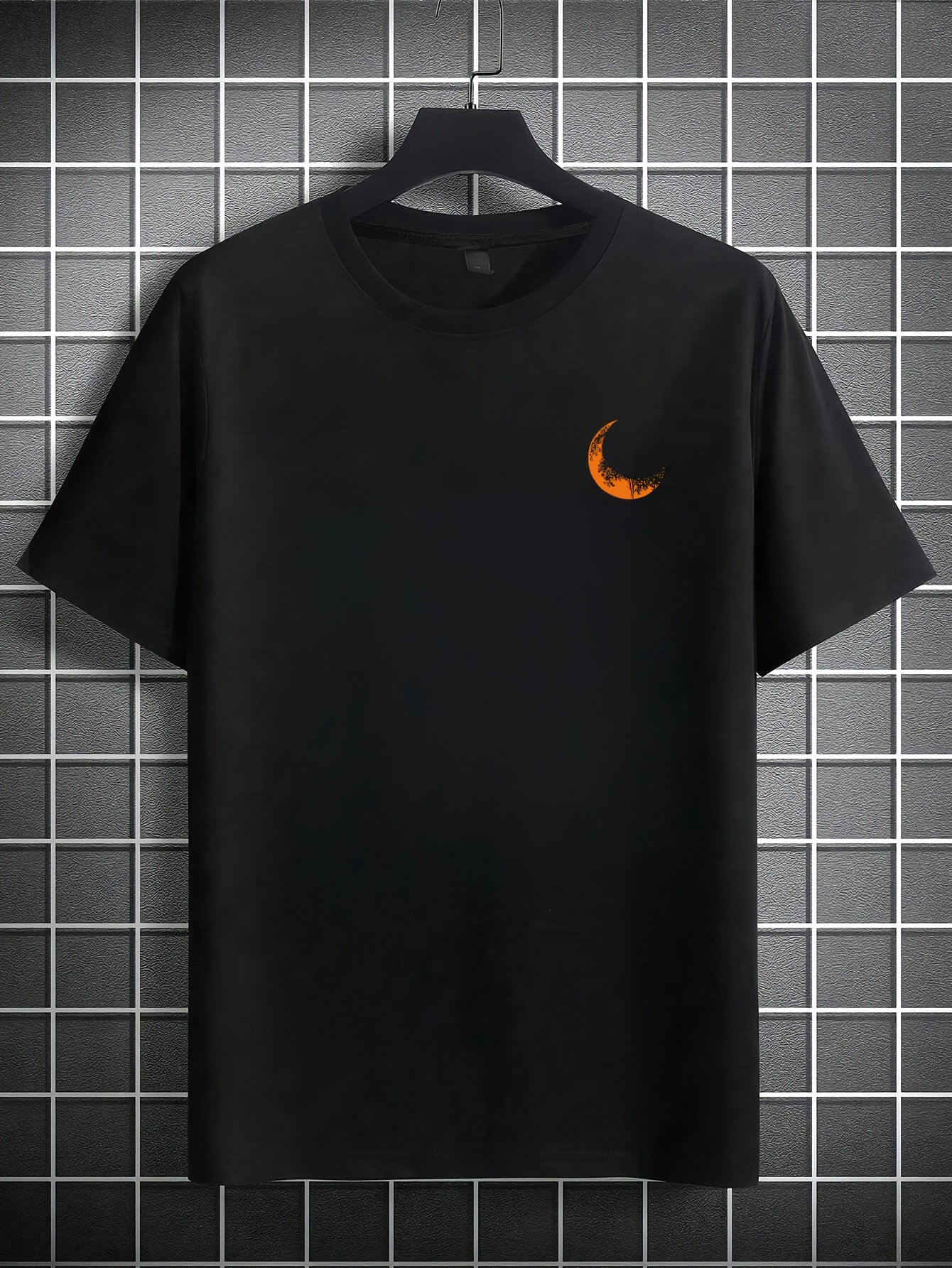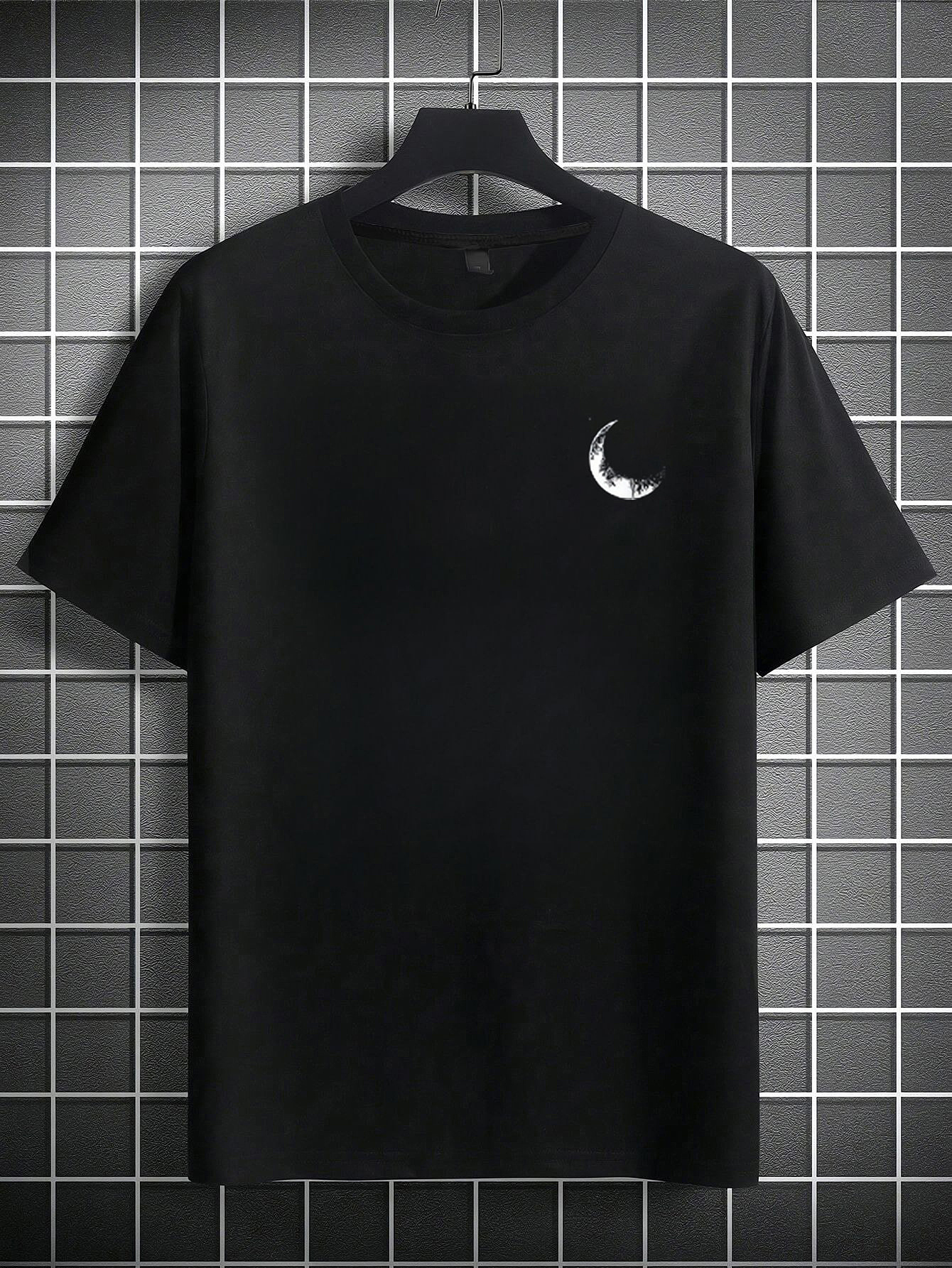 Moon and Trees Design Front & Back Graphic Crew Neck Cotton Summer Fashion Short Sleeve Casual Daily Style Top with Unique Geometric Pattern, Suitable for Spring/Summer Outdoor Activities
