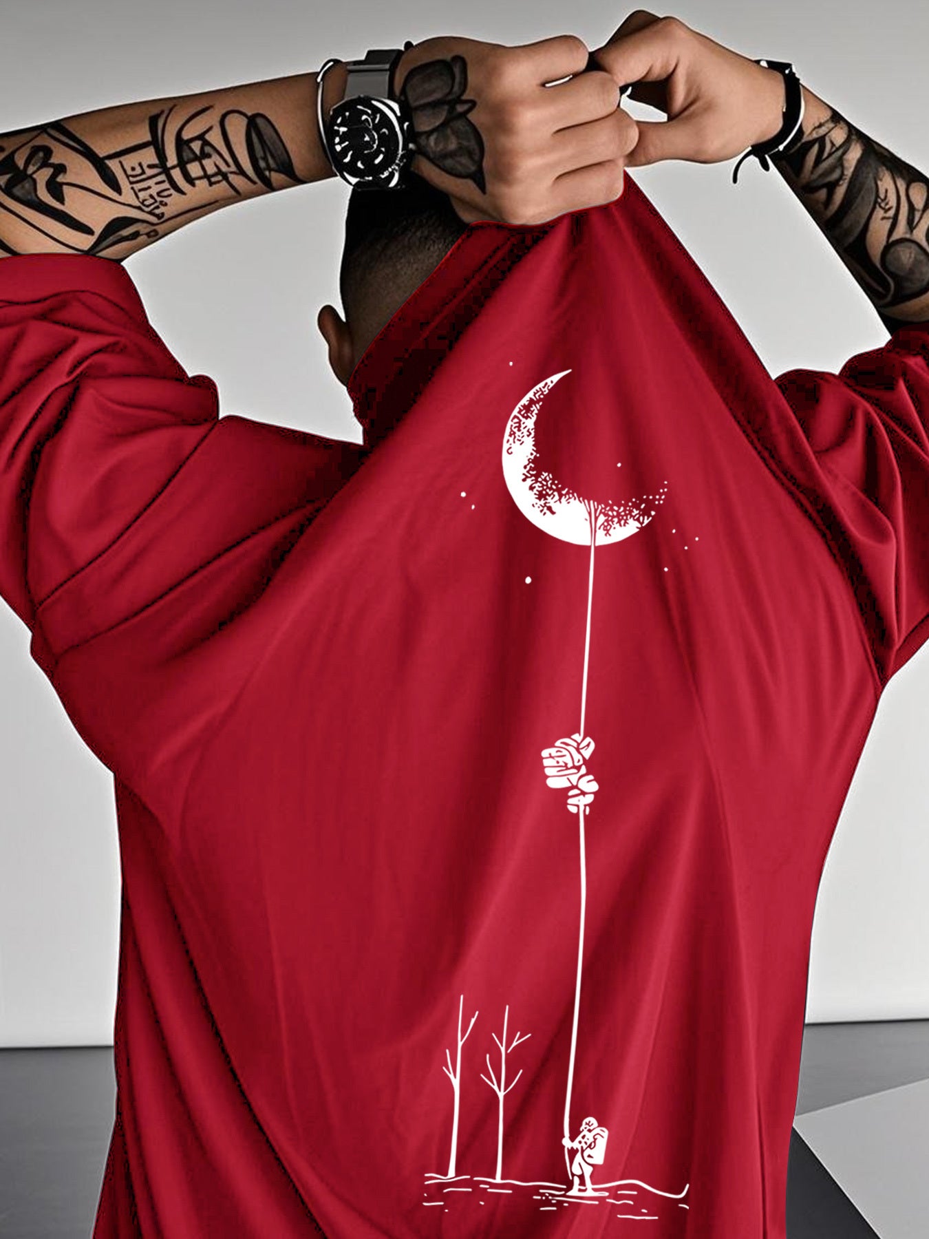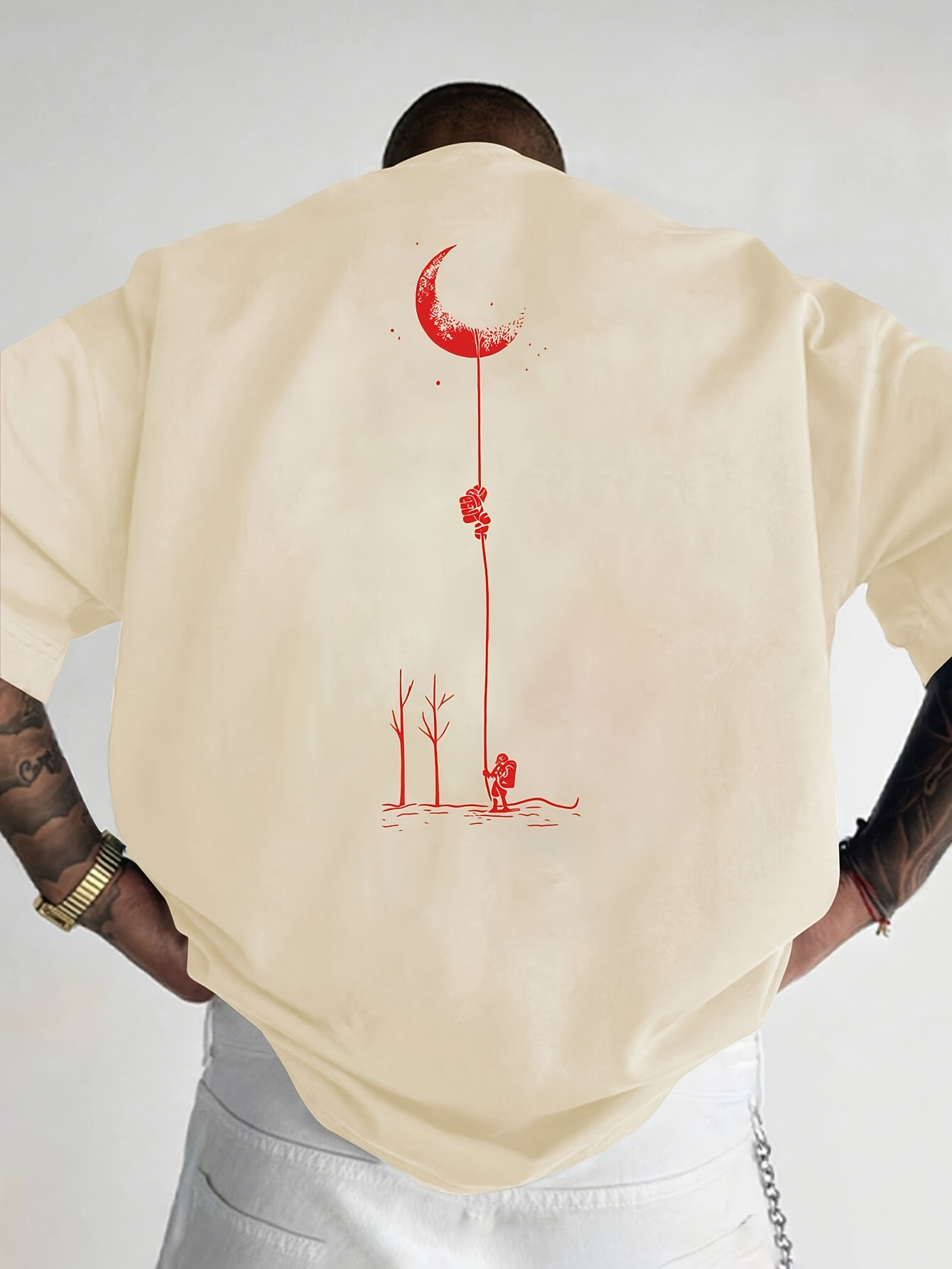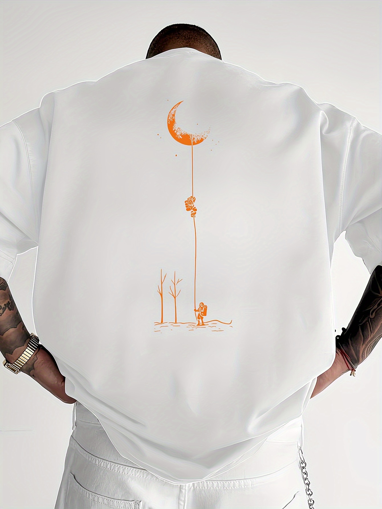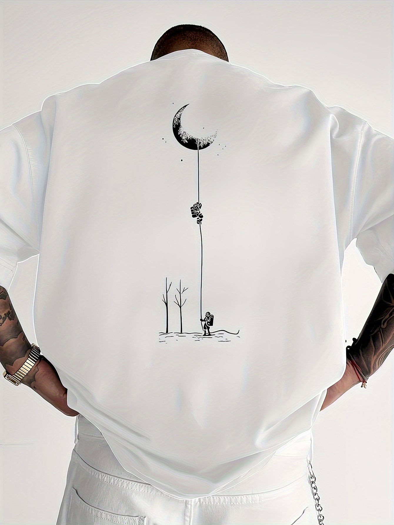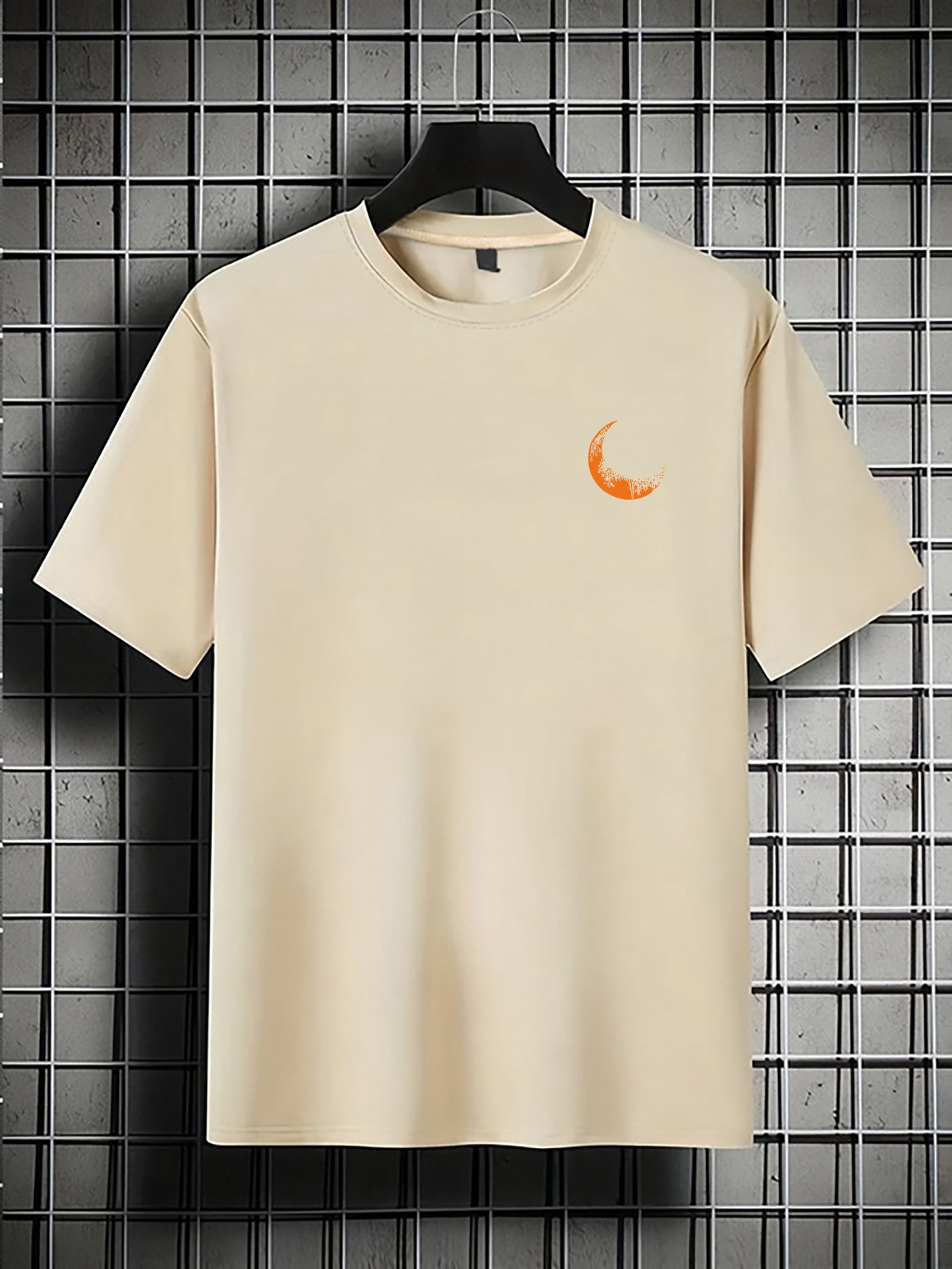 Moon and Trees Design Front & Back Graphic Crew Neck Cotton Summer Fashion Short Sleeve Casual Daily Style Top with Unique Geometric Pattern, Suitable for Spring/Summer Outdoor Activities