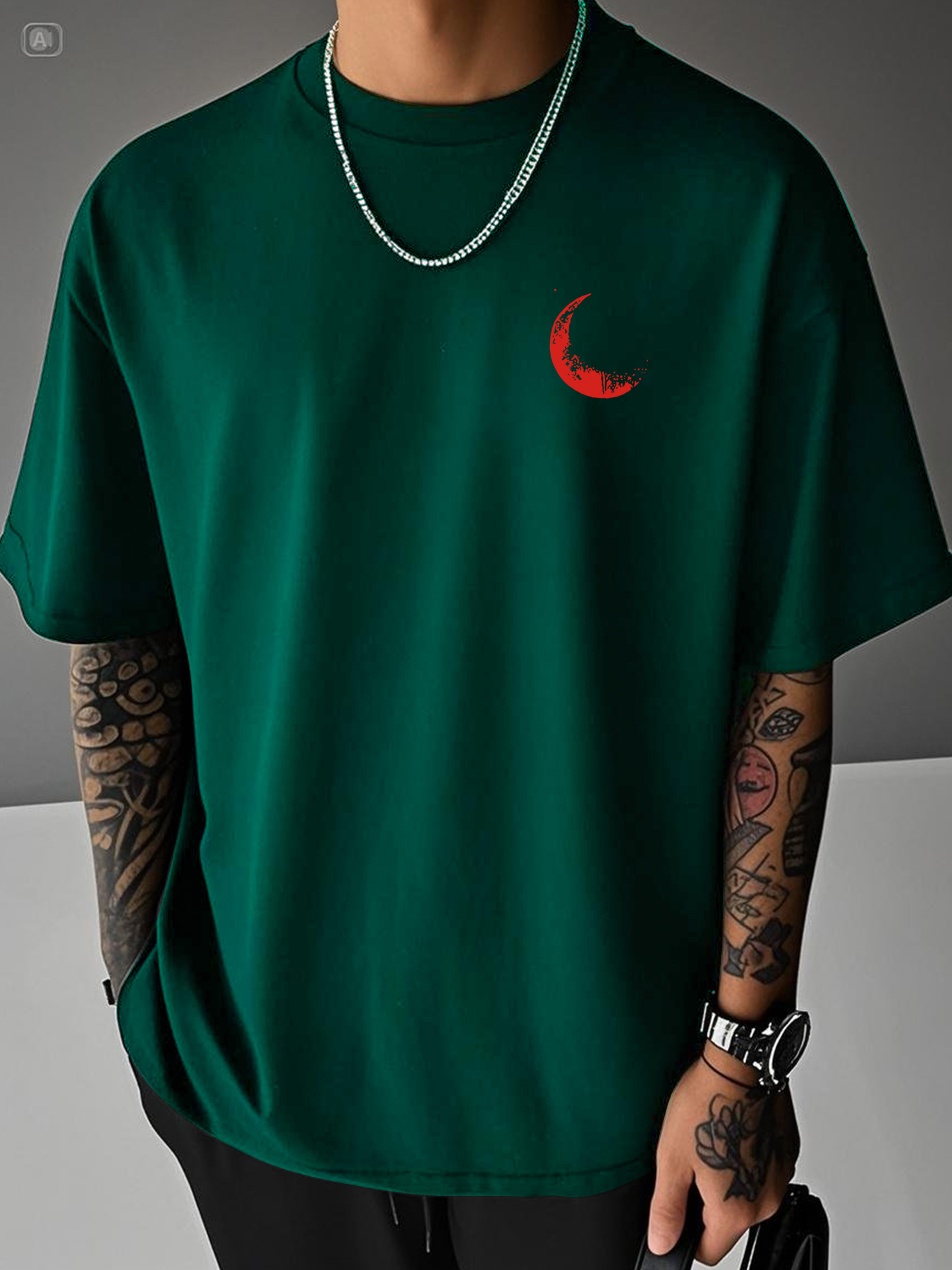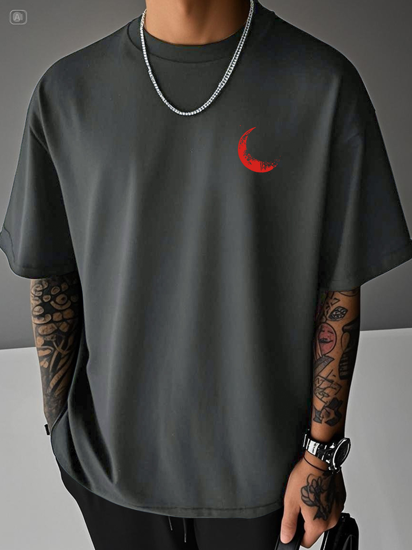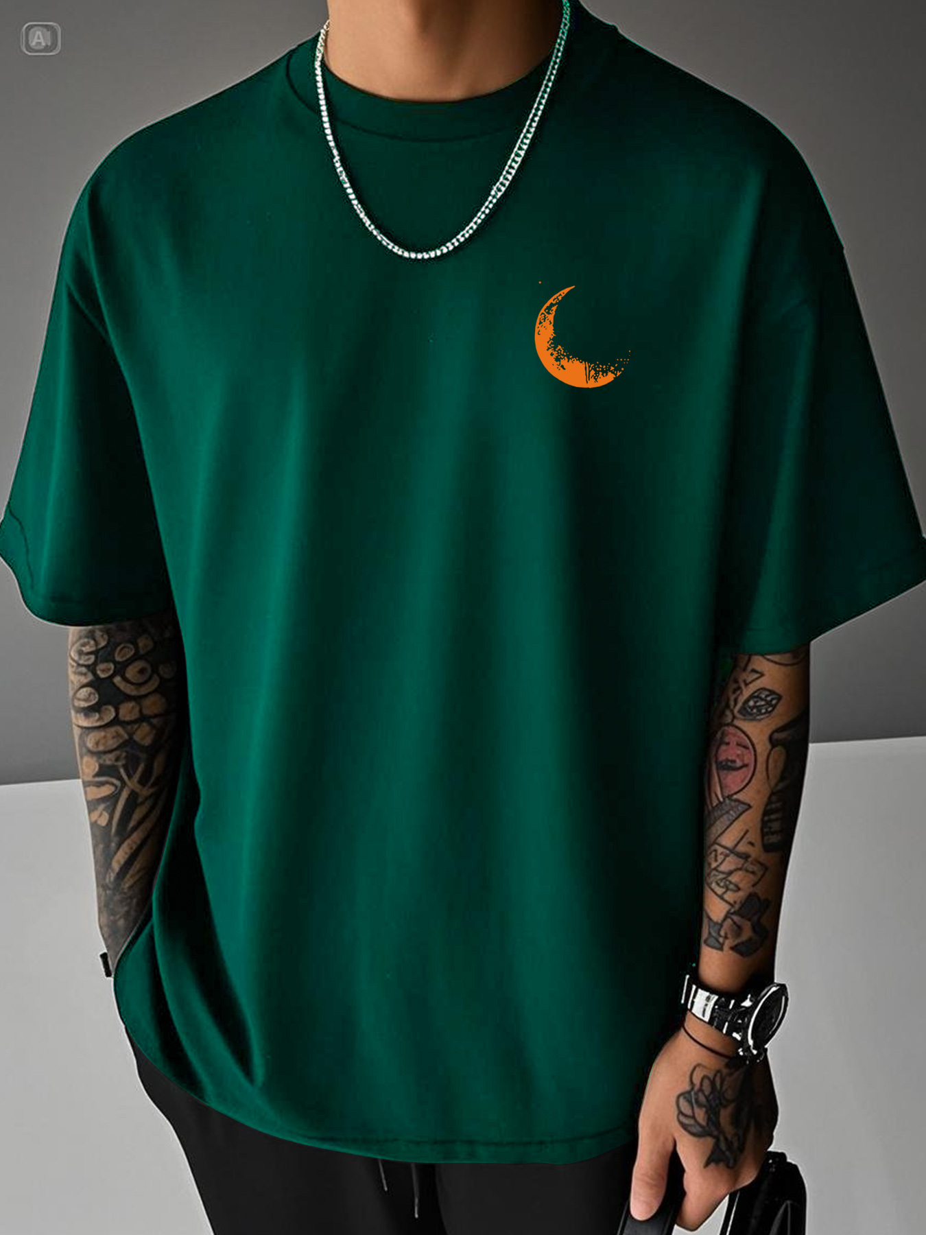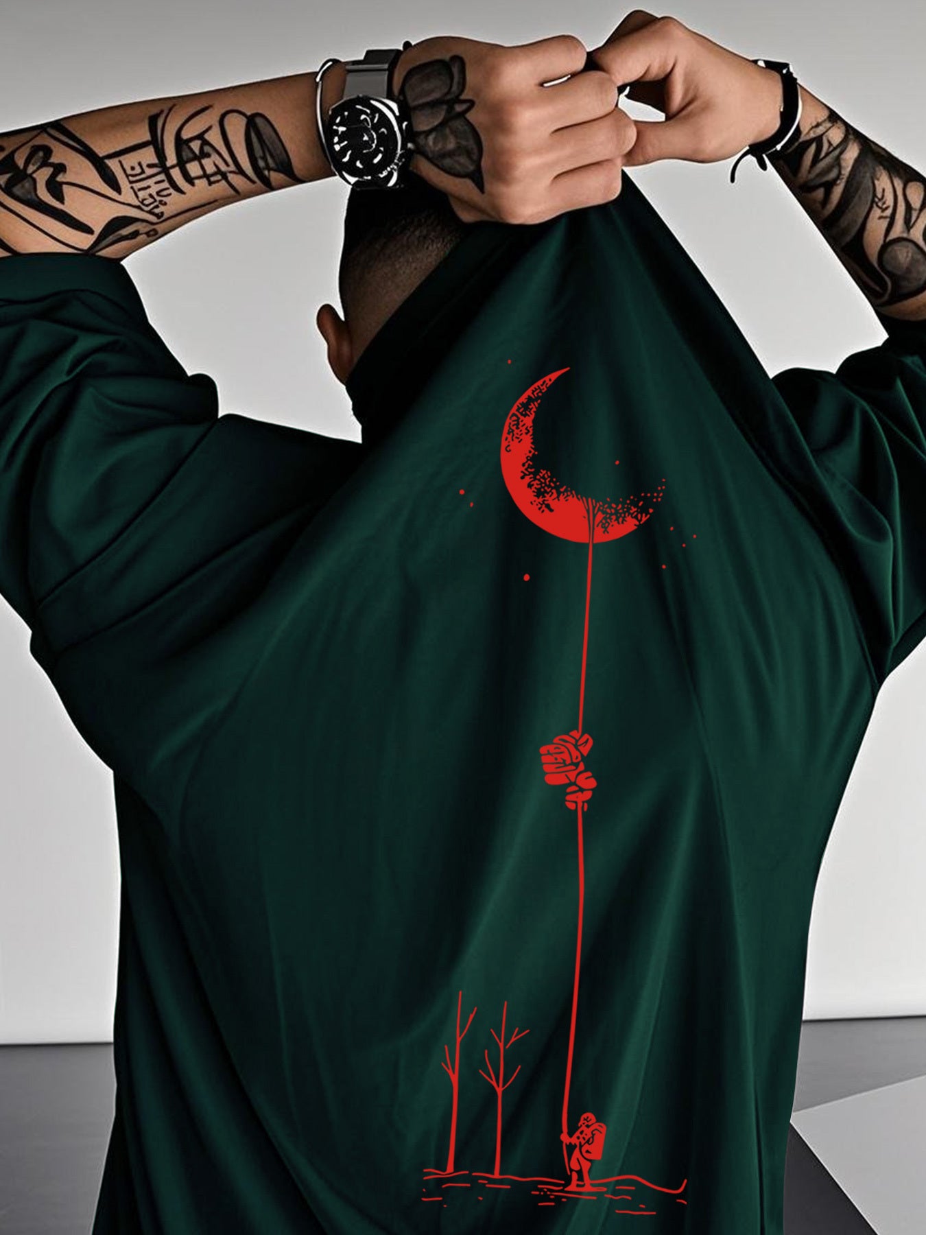 Moon and Trees Design Front & Back Graphic Crew Neck Cotton Summer Fashion Short Sleeve Casual Daily Style Top with Unique Geometric Pattern, Suitable for Spring/Summer Outdoor Activities