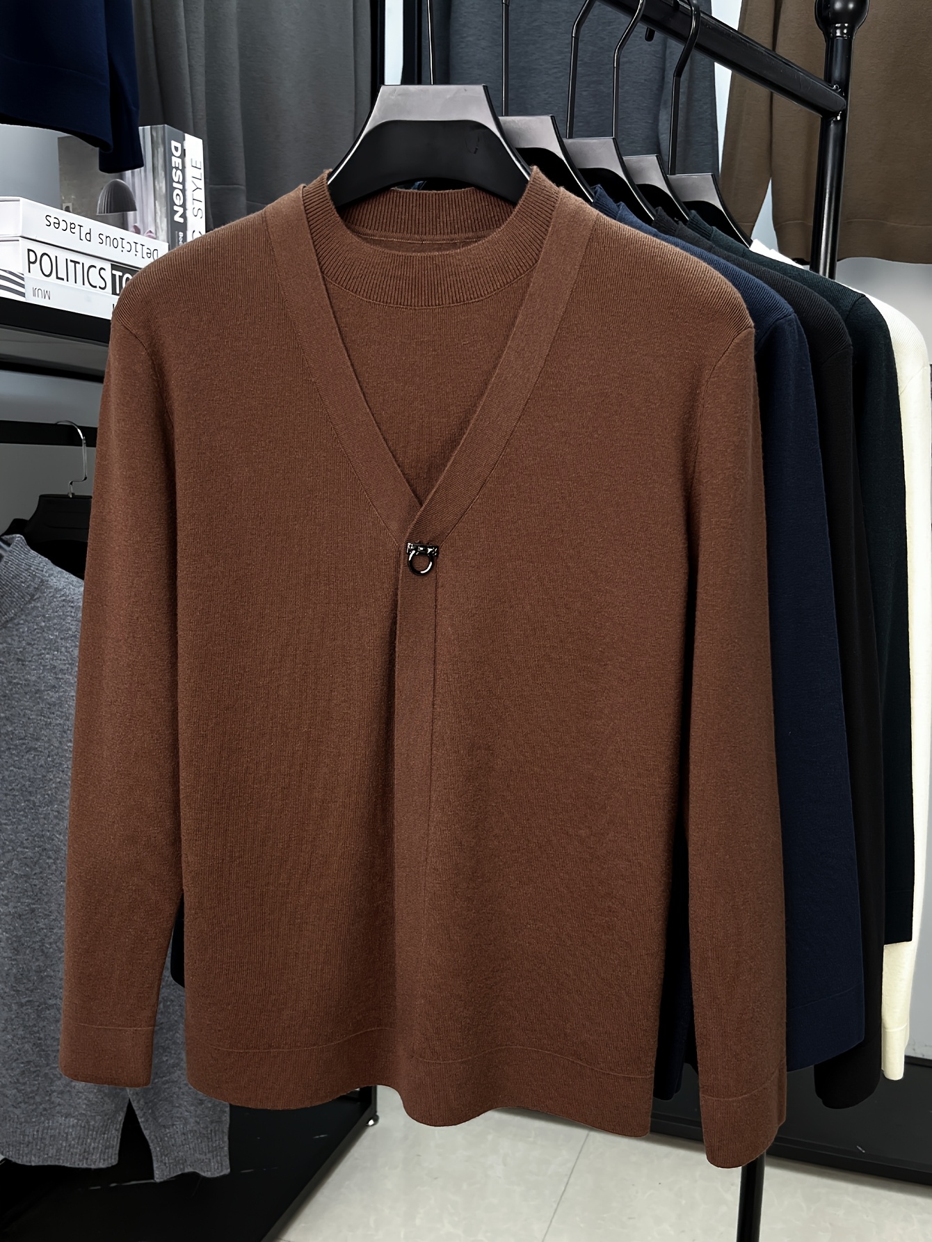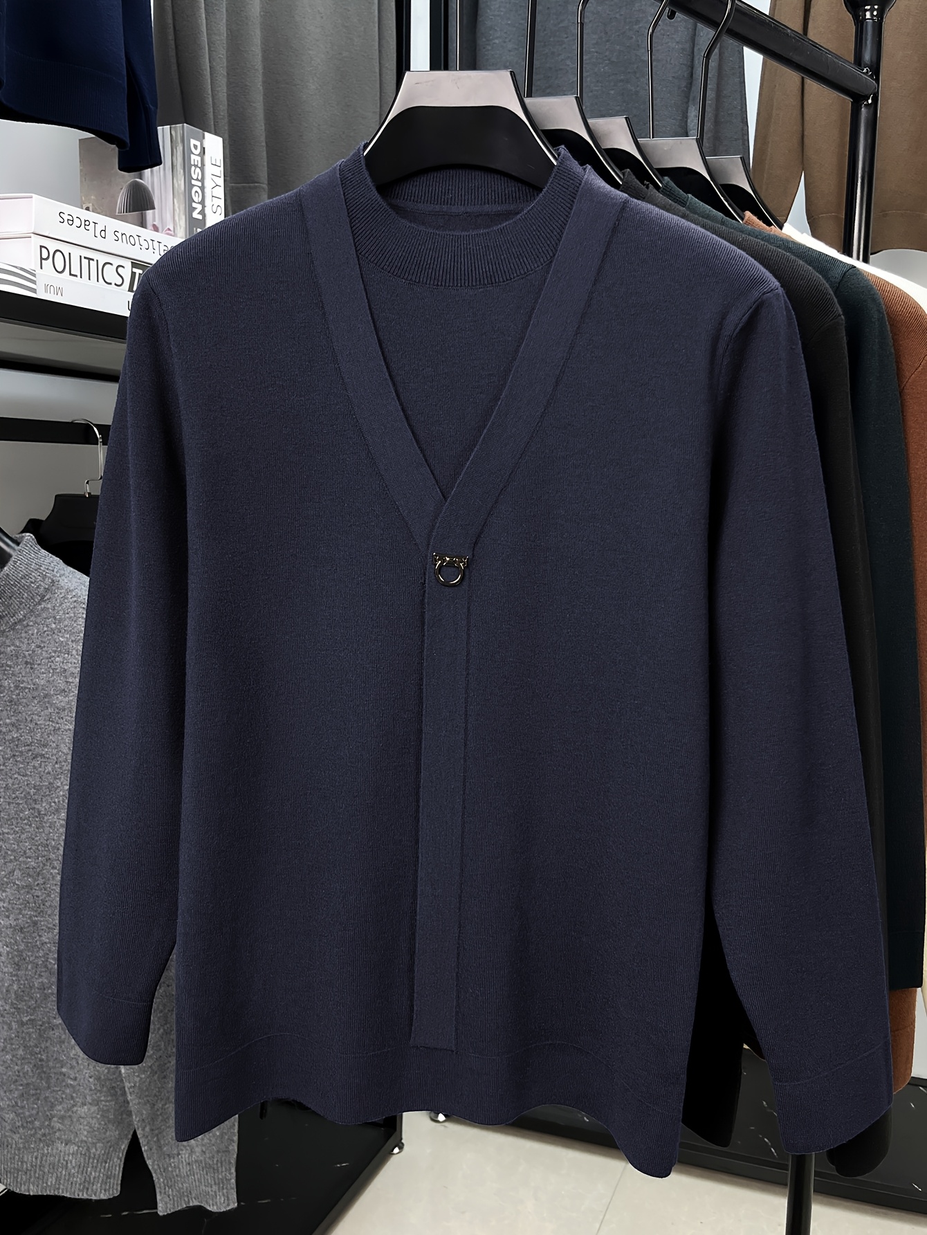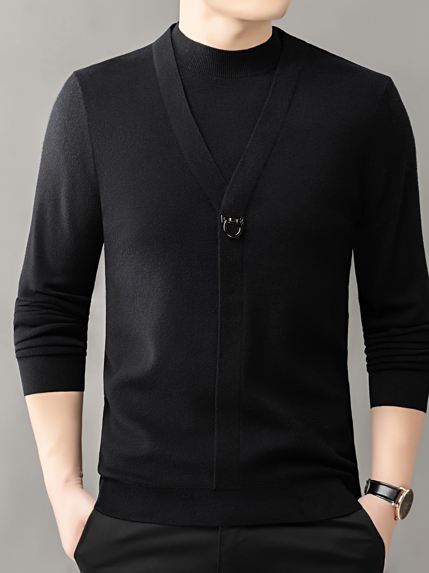 New Autumn And Winter Men'S Fashion: a Round-Neck Long-Sleeve Sweater That Looks Like a Two-Piece, Suitable for Business Casual Wear, Featuring a Faux Placket Design, Knit