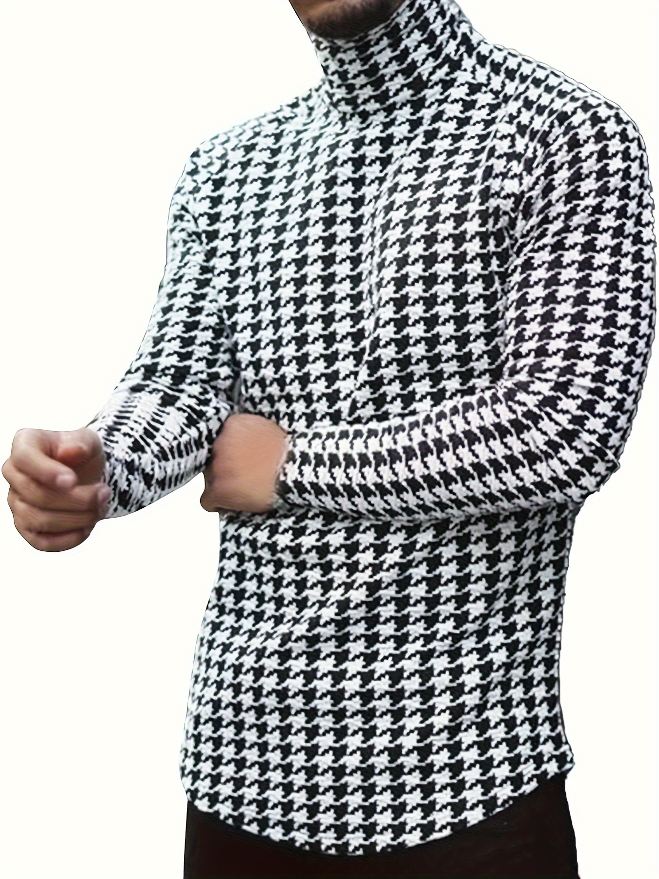 New Autumn-Winter Men's Slim-Fit High-Neck Pullover Long Sleeve Houndstooth Sweater Base Layer, PLUS SIZE