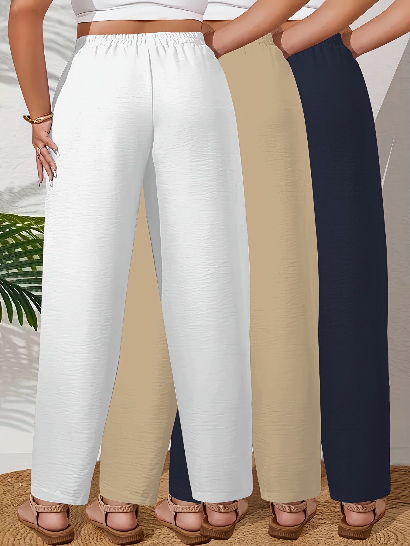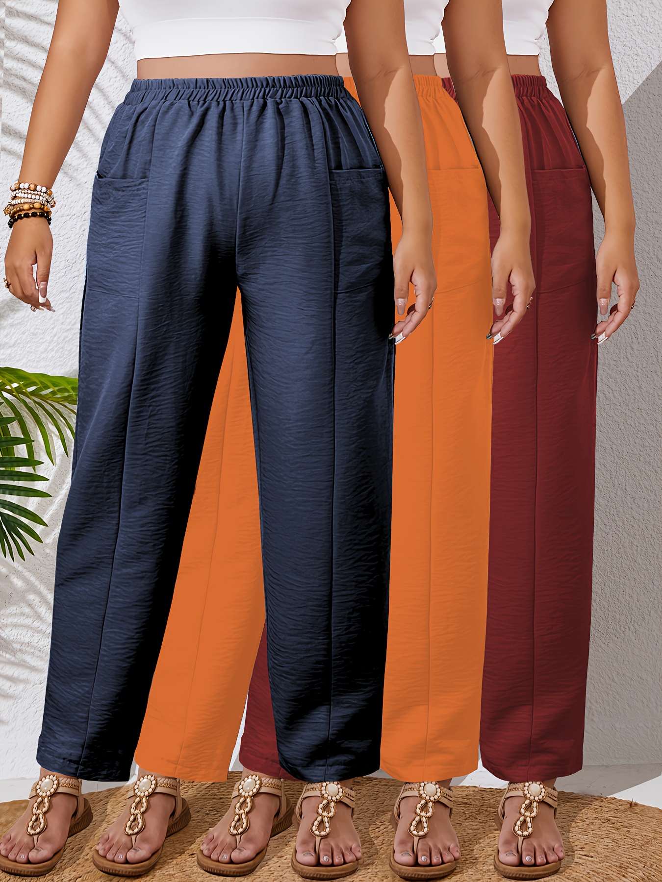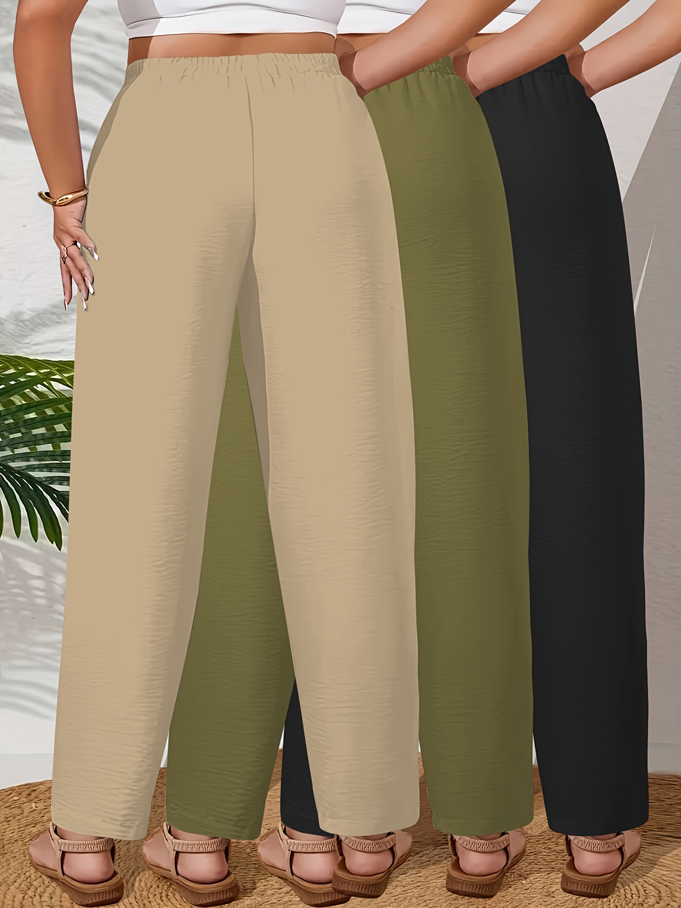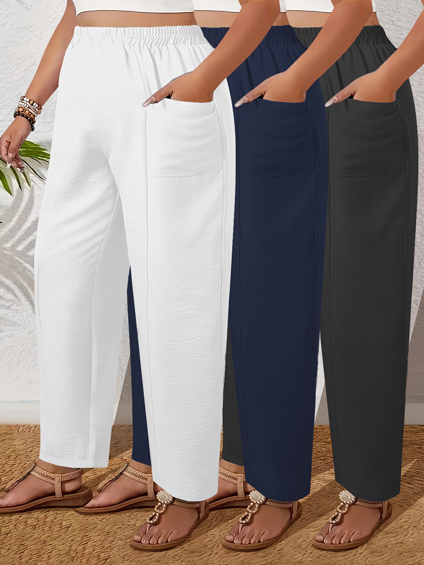 Lot de 3 Pantalons Femme Grande Taille – Taille Haute, Droits, Élastiques avec Poches, Couleur Unie, Tous Saisons