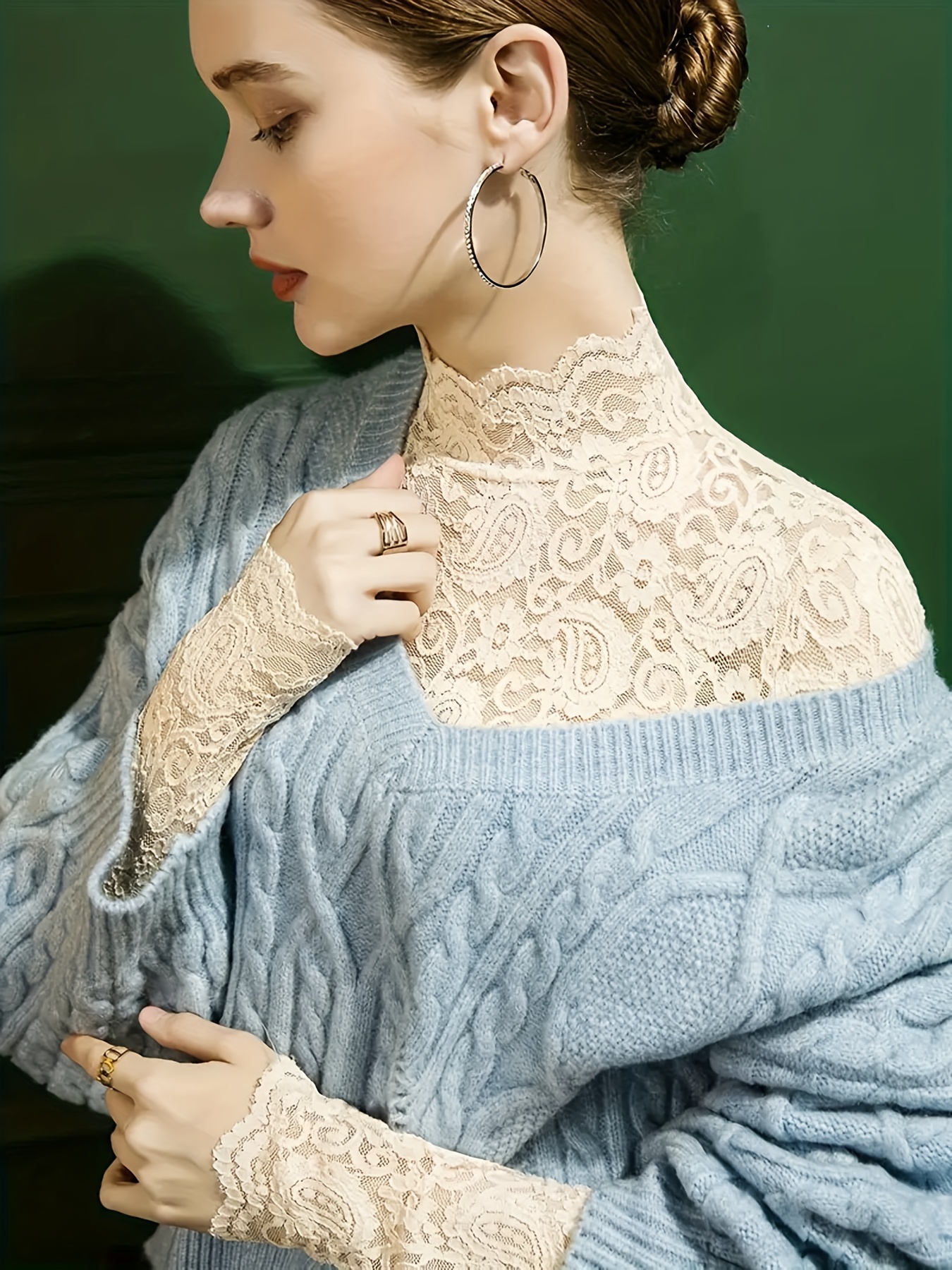 Lot de 2 Hauts Femme en Dentelle Unie - Col Semi-Montant Élégant, Manches Longues, Idéal comme Sous-Couche pour le Printemps et l’Automne, T-Shirt Féminin