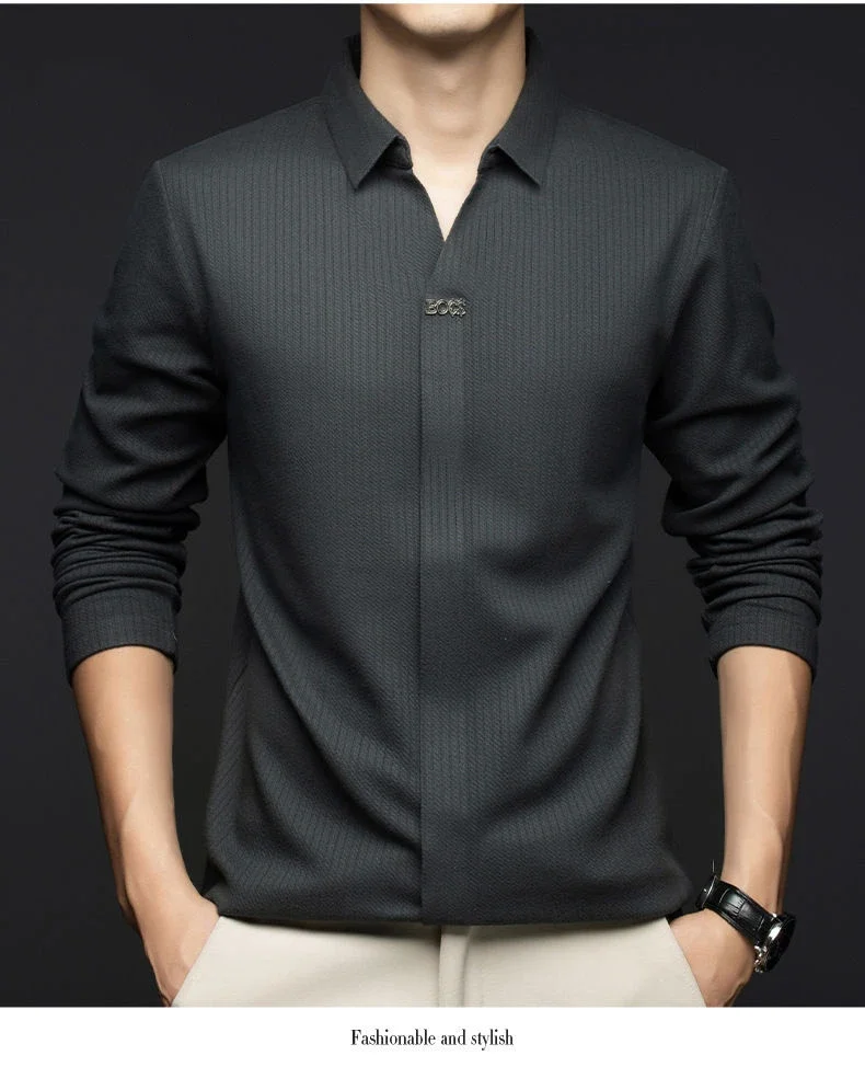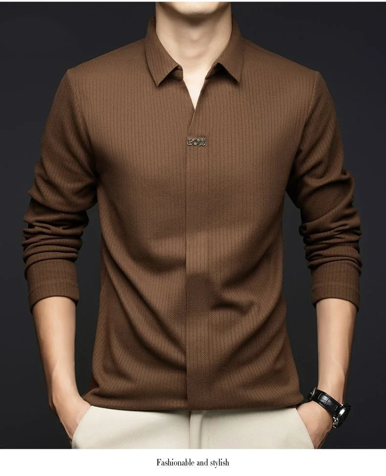 T-shirt à manches longues pour hommes, col à ciseaux, mode d'âge moyen, décontracté, tendance, chemise de Base, haut de couleur unie