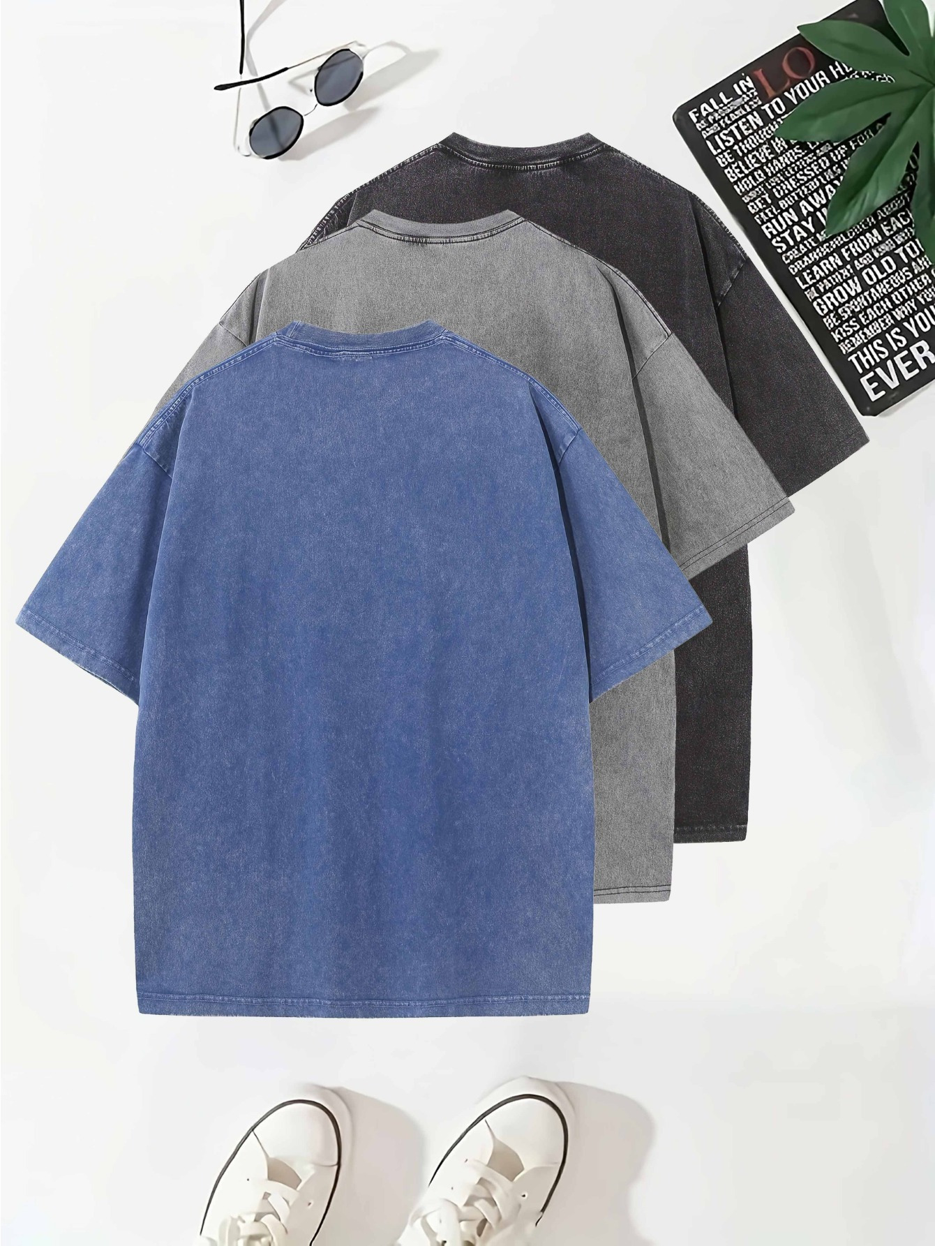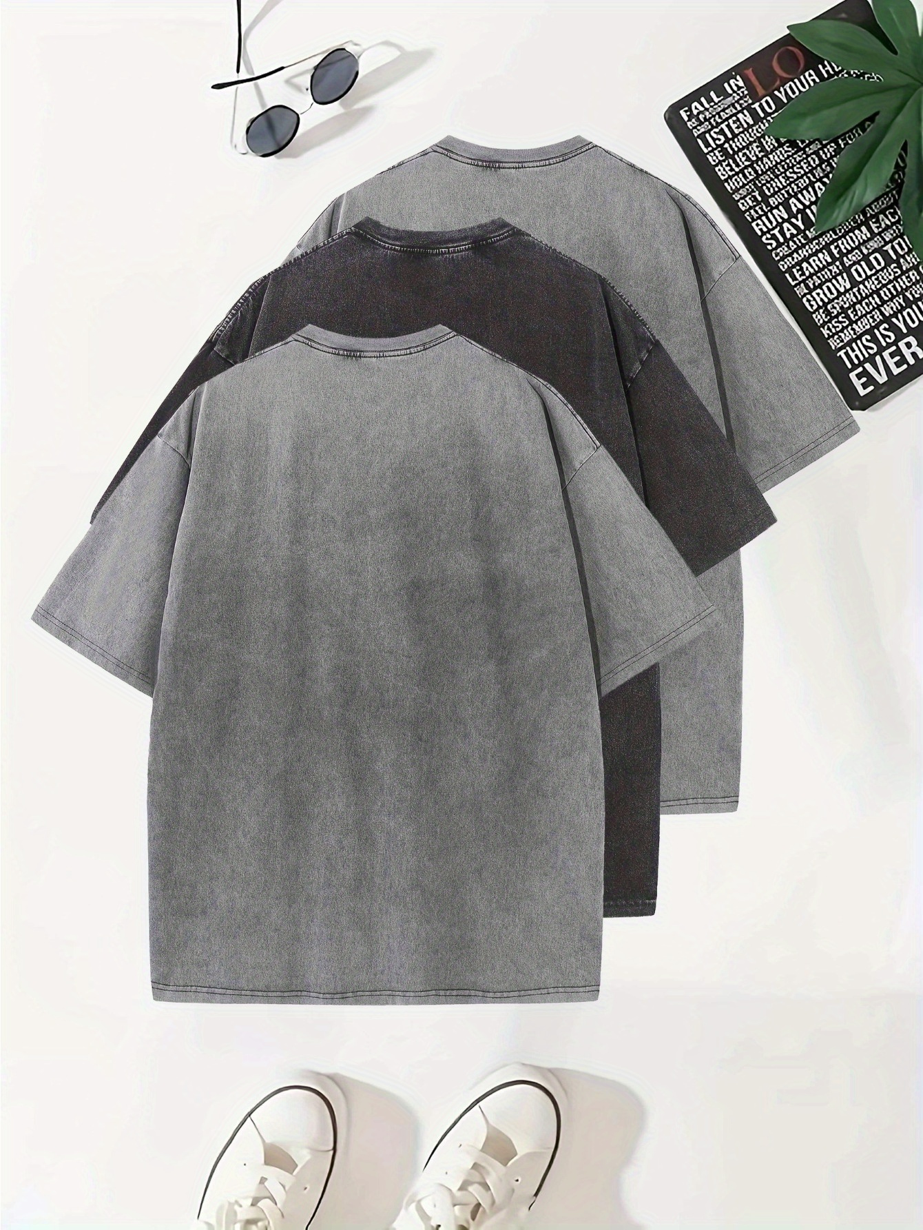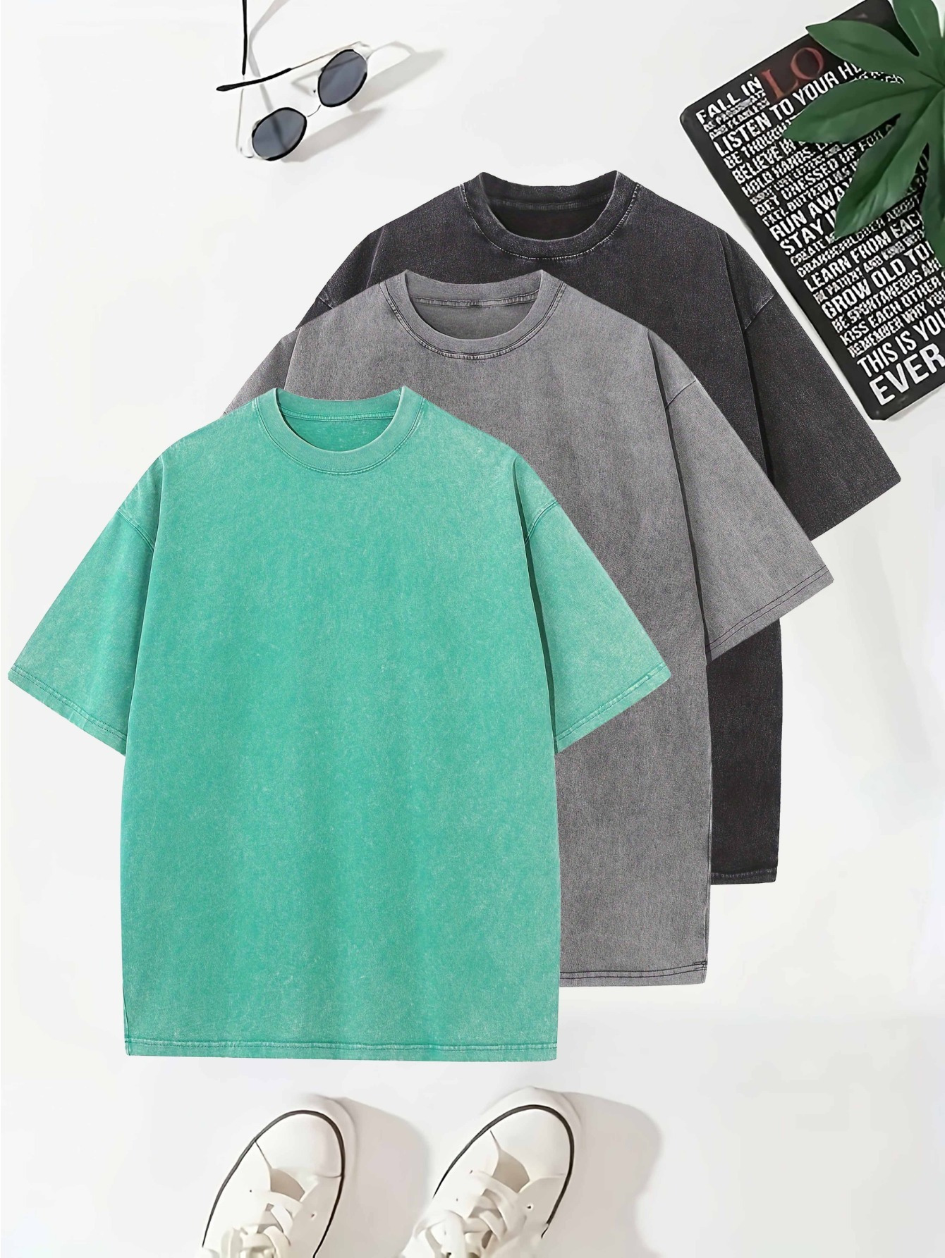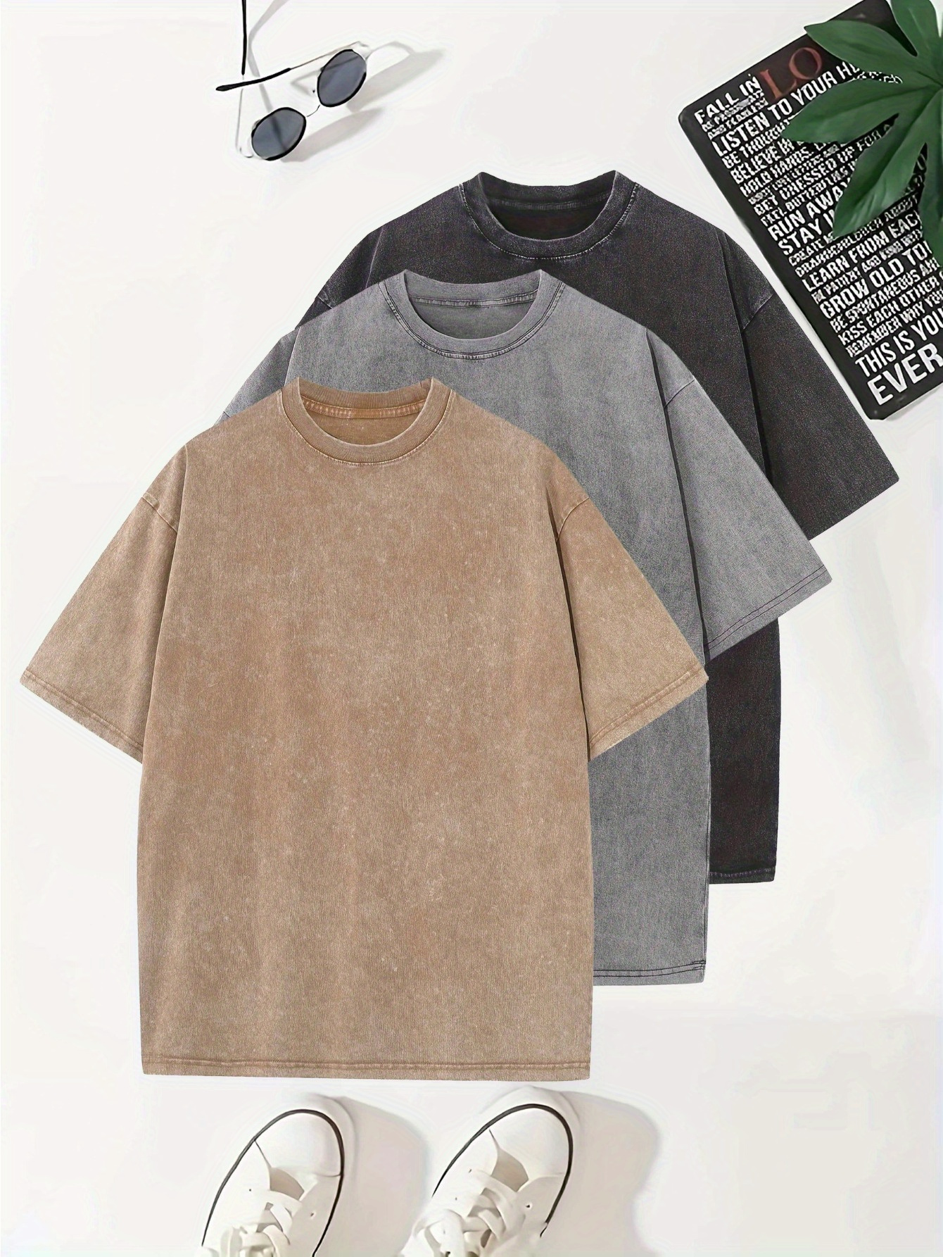 Temujin Starry 3pcs Washed Cotton Distressed 100% Pure 240g Crew Neck T Shirt, Simple and Fashionable