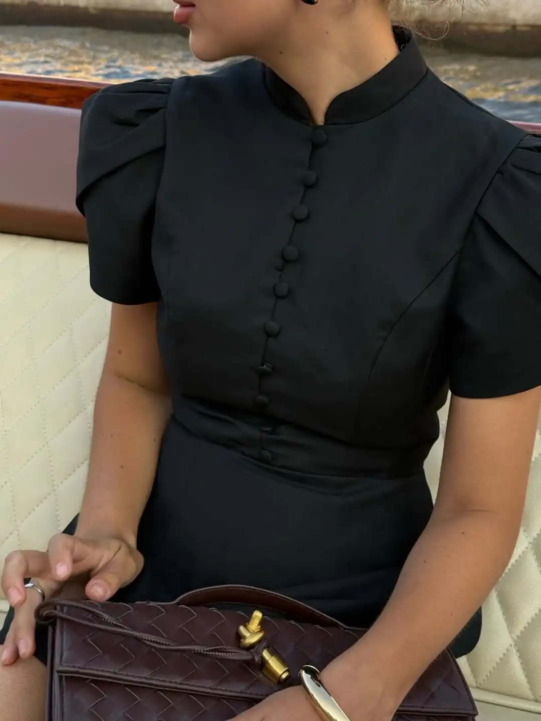 Détails : Boutons décoratifs, manches bouffantes courtes