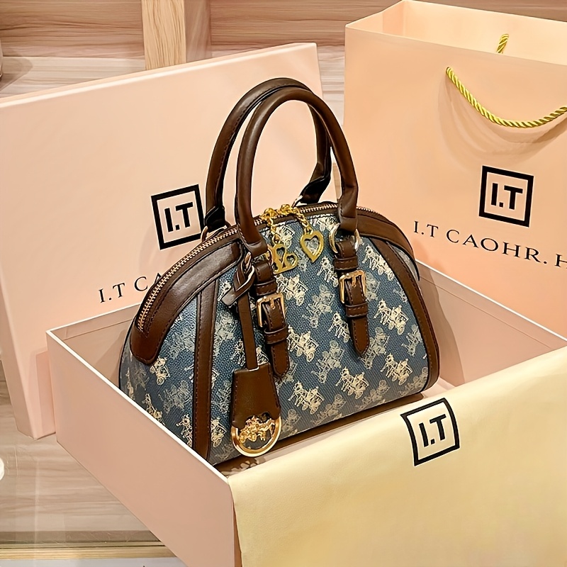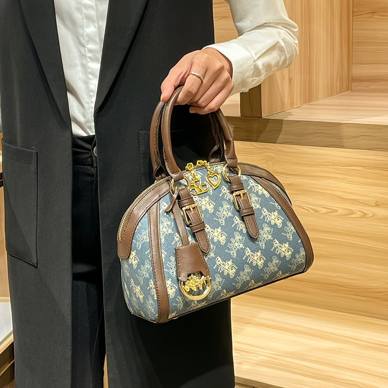 Sac à main vintage à imprimé carrosse pour femme – forme coquillage, bandoulière amovible, motif animal bleu en PVC, doublure polyester, fermeture zippée, élégant cadeau pour maman.