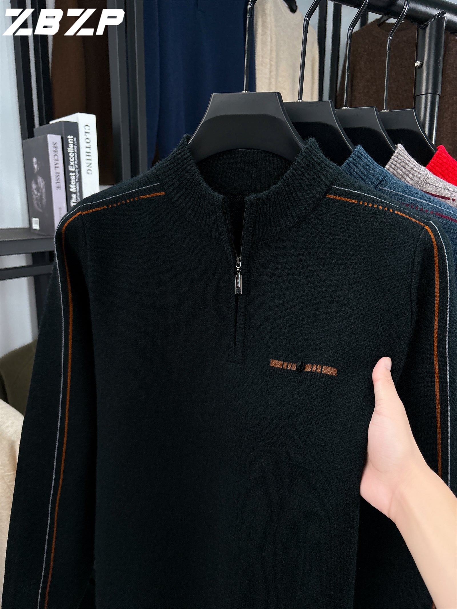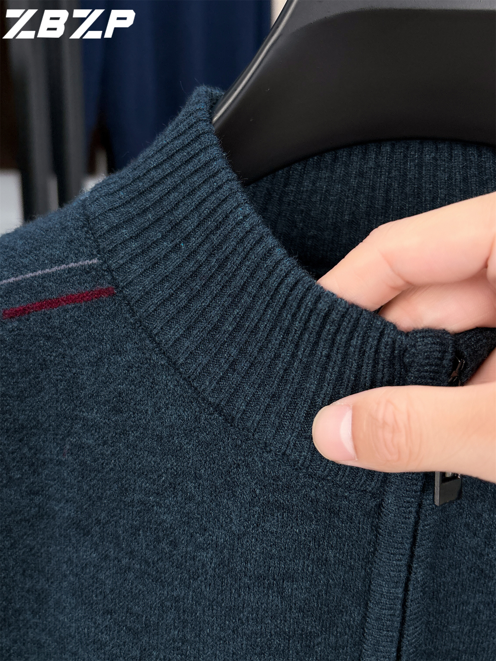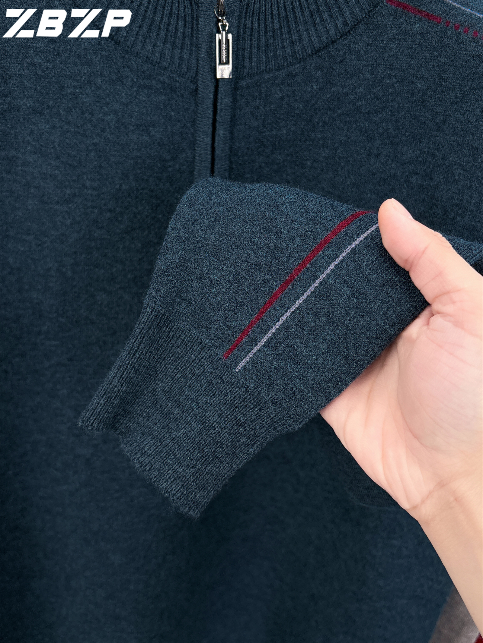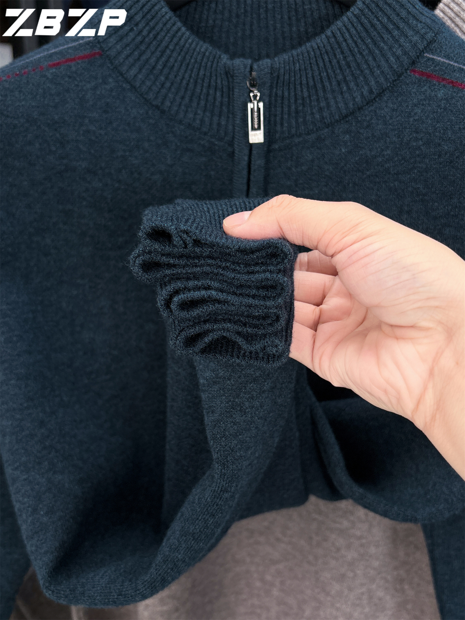 Men's Heavyweight Half-Zip Sweater - Stand Collar Zippered Winter Knit Sweater with Striped Collar & Back Logo, Dark Blue Casual Warm Pullover for Fall/Winter, Versatile Layering for Office & Casual Attire