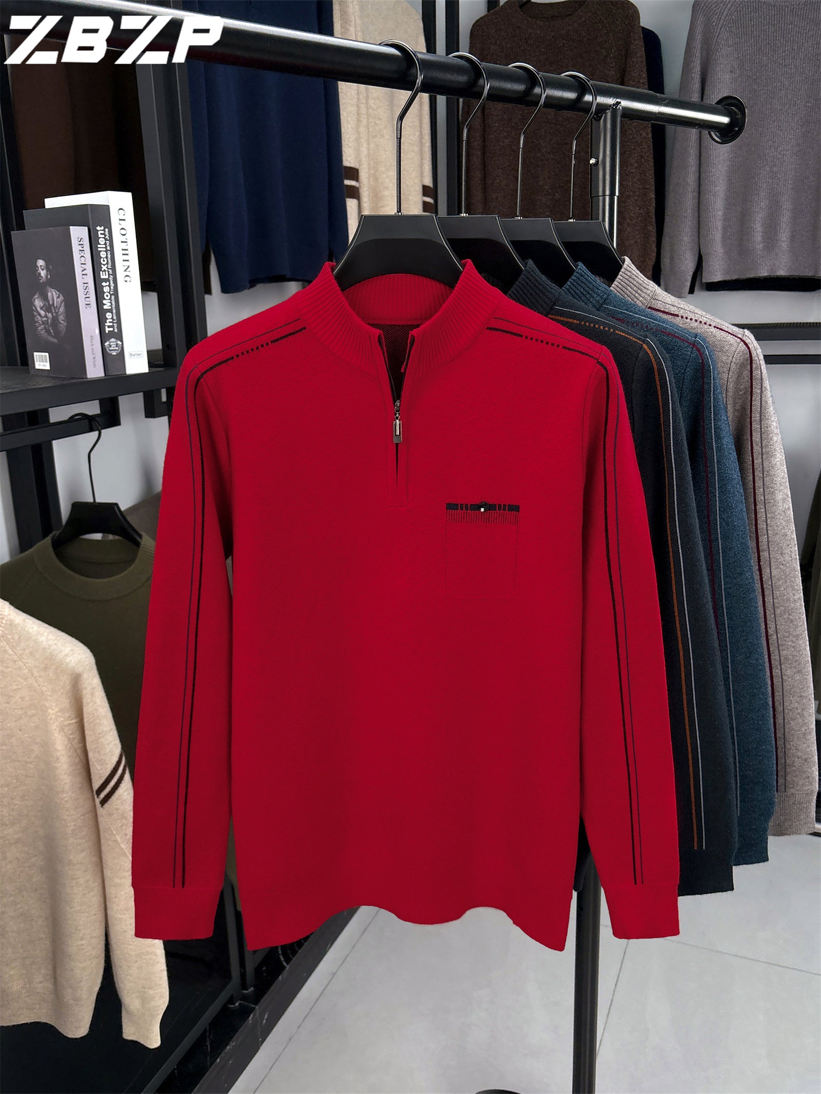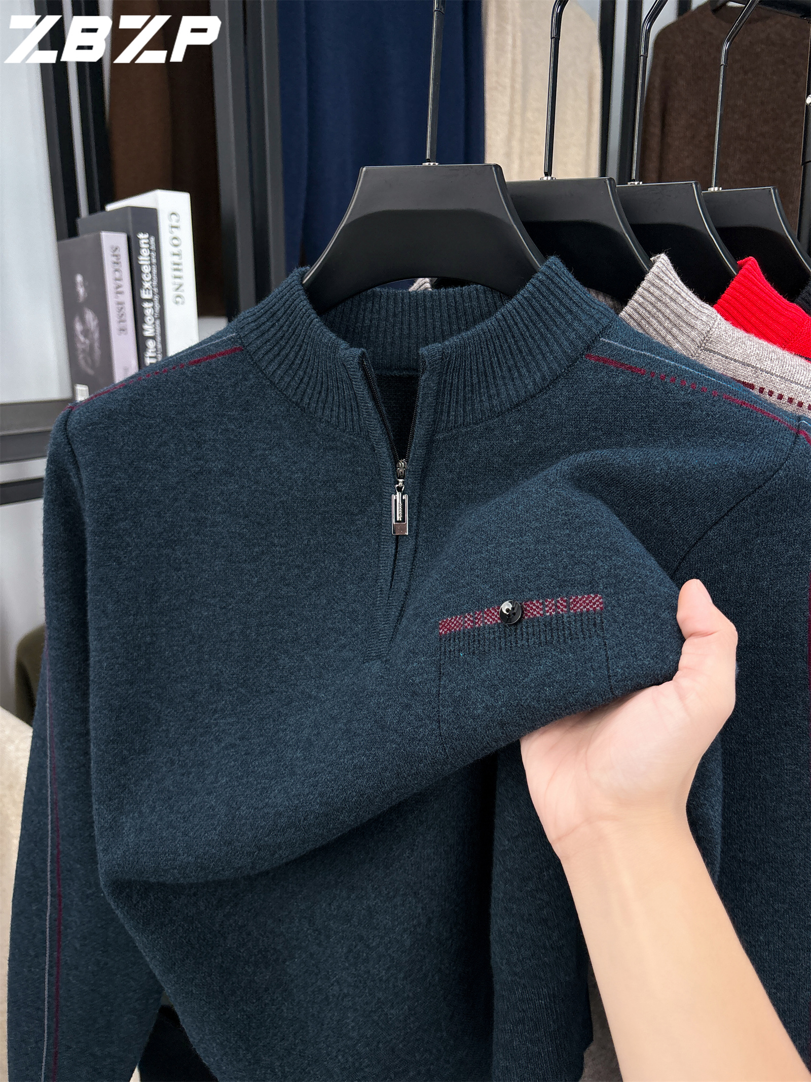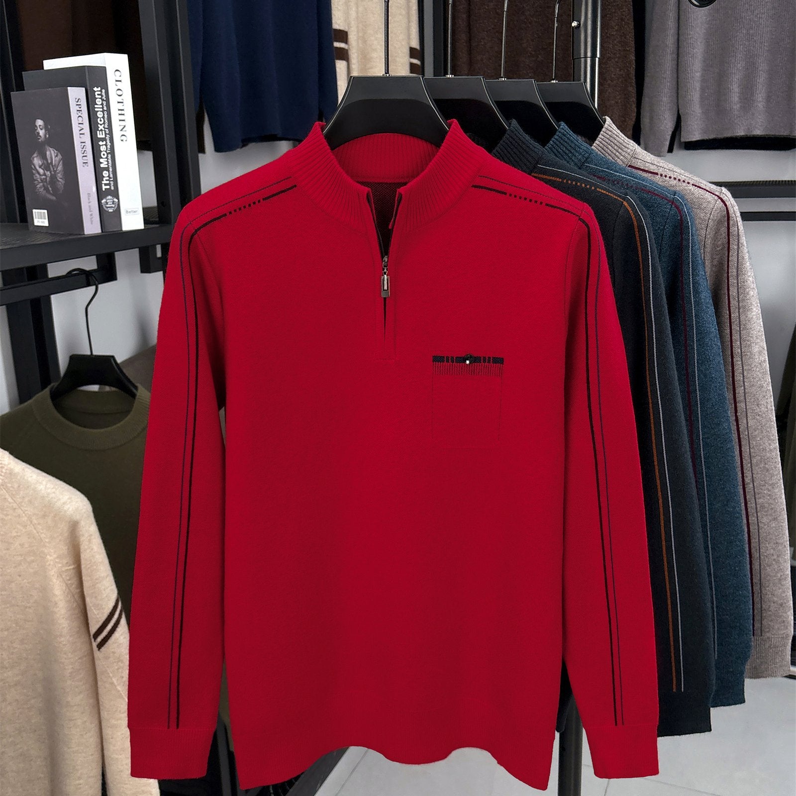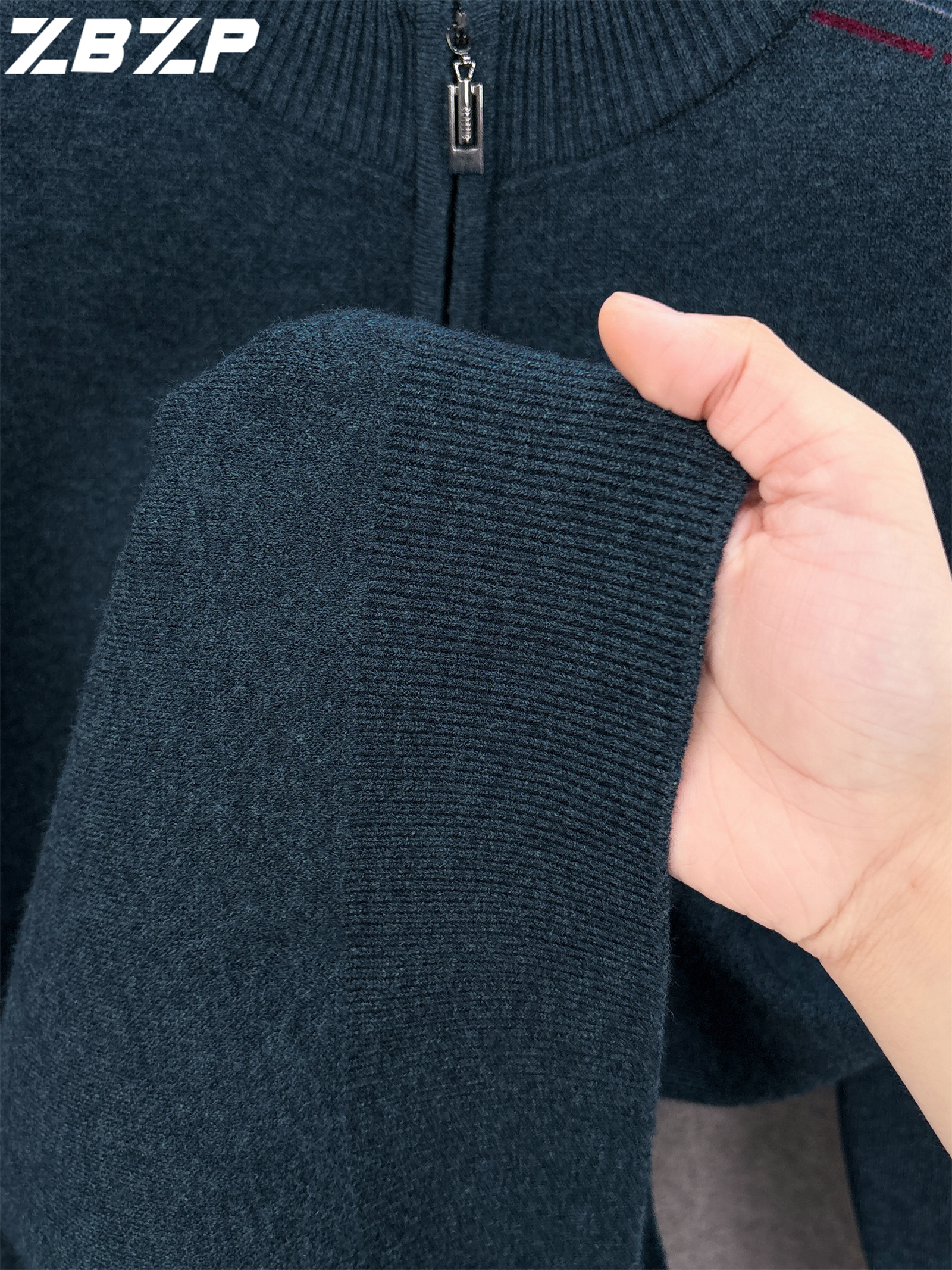 Men's Heavyweight Half-Zip Sweater - Stand Collar Zippered Winter Knit Sweater with Striped Collar & Back Logo, Dark Blue Casual Warm Pullover for Fall/Winter, Versatile Layering for Office & Casual Attire