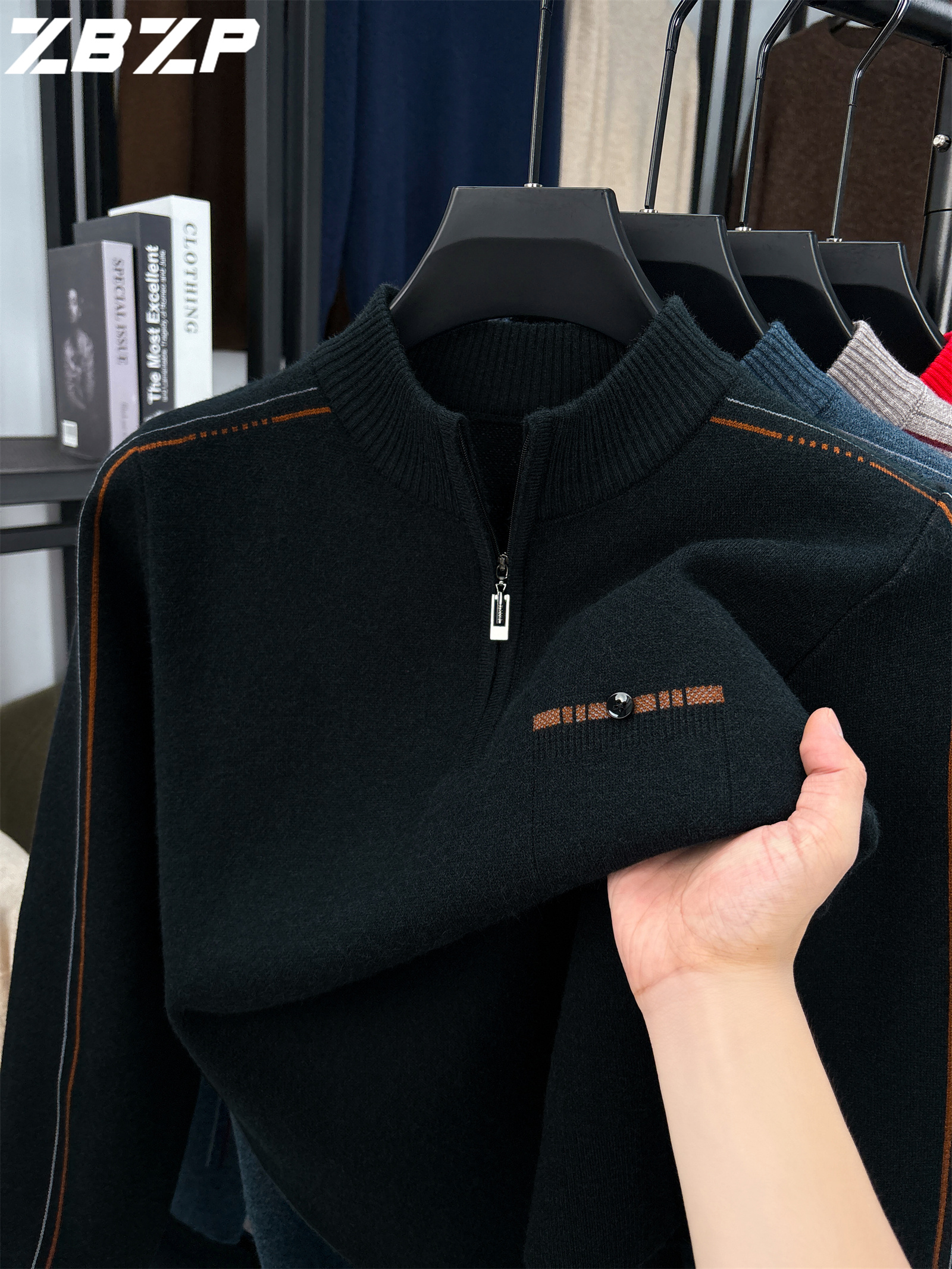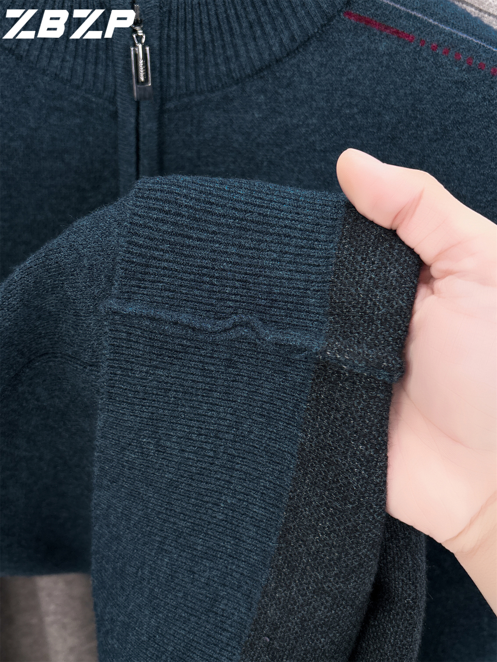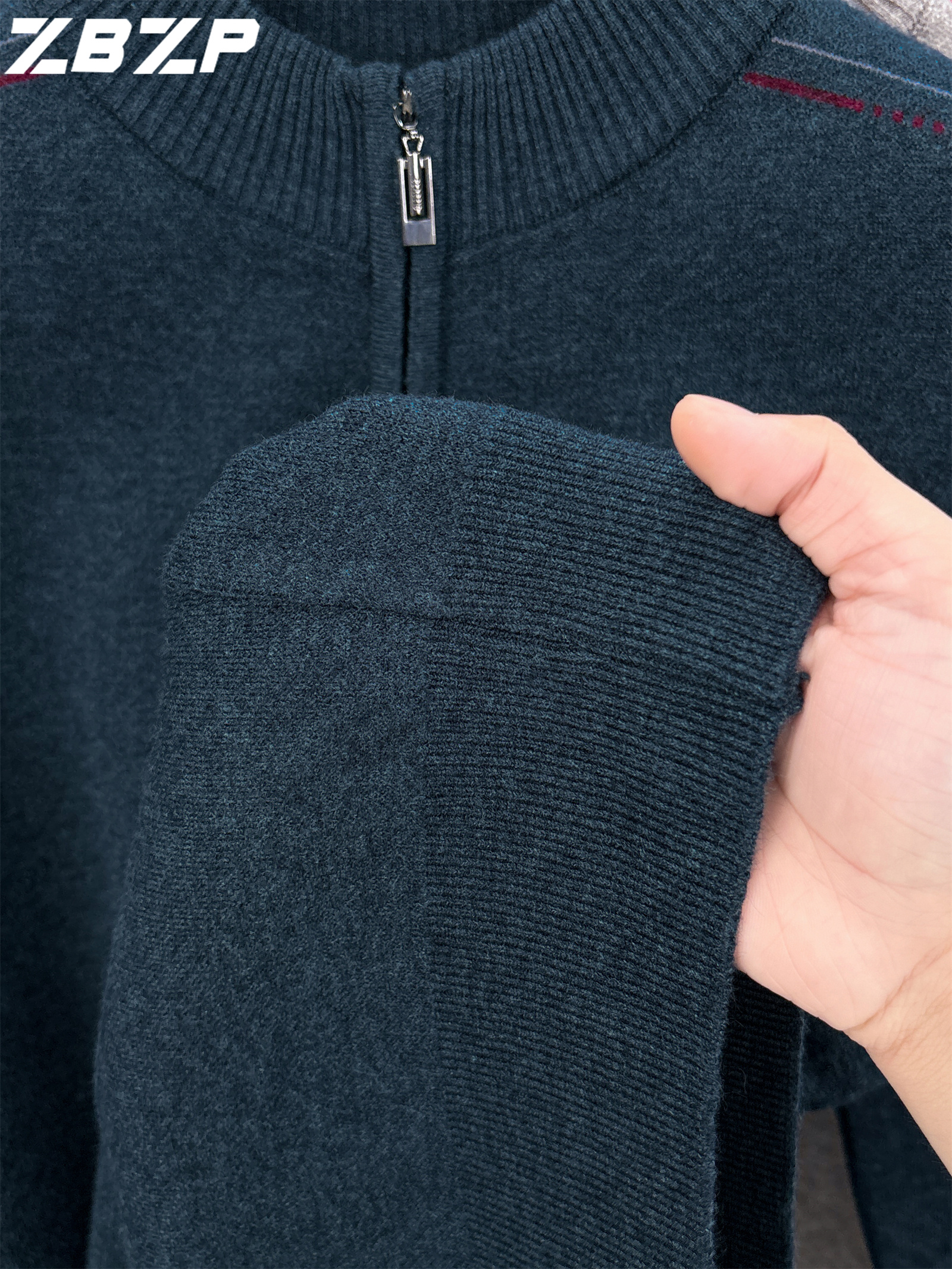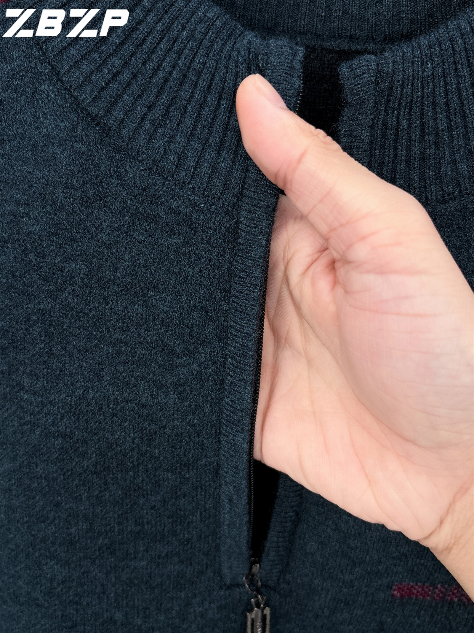 Men's Heavyweight Half-Zip Sweater - Stand Collar Zippered Winter Knit Sweater with Striped Collar & Back Logo, Dark Blue Casual Warm Pullover for Fall/Winter, Versatile Layering for Office & Casual Attire