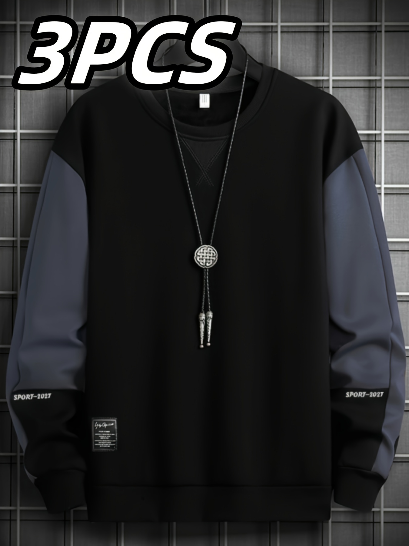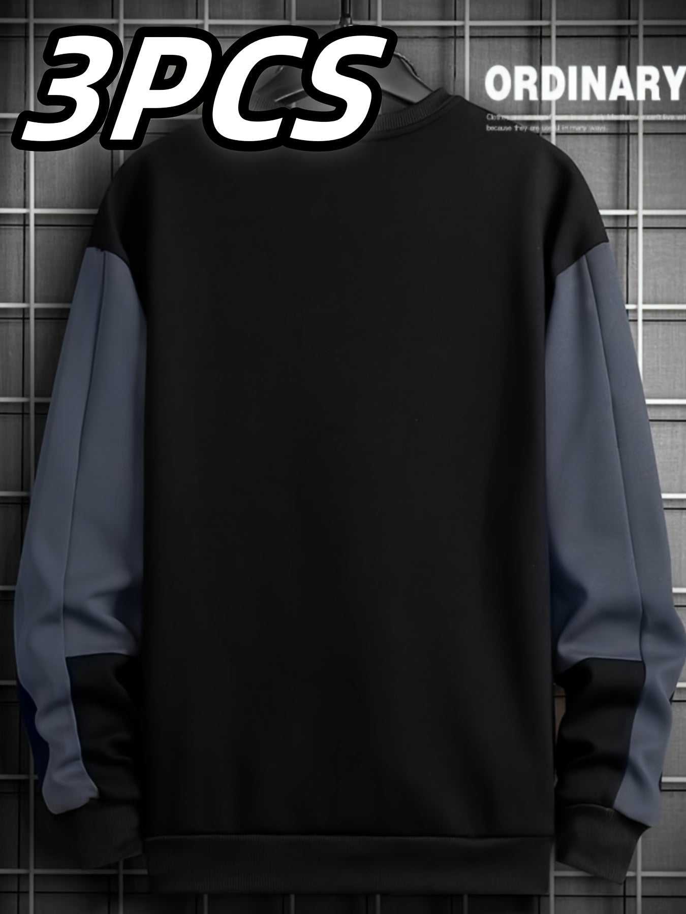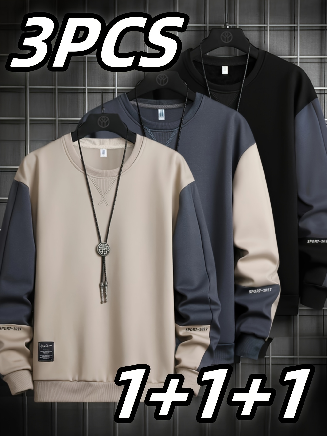 3pcs Sweatshirts Homme Col Rond – Polyester Extensible, Motif Lettre, Beige/Noir