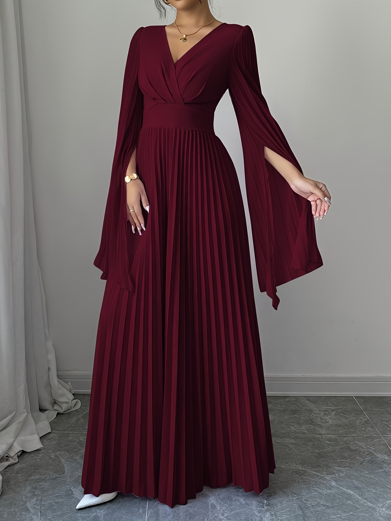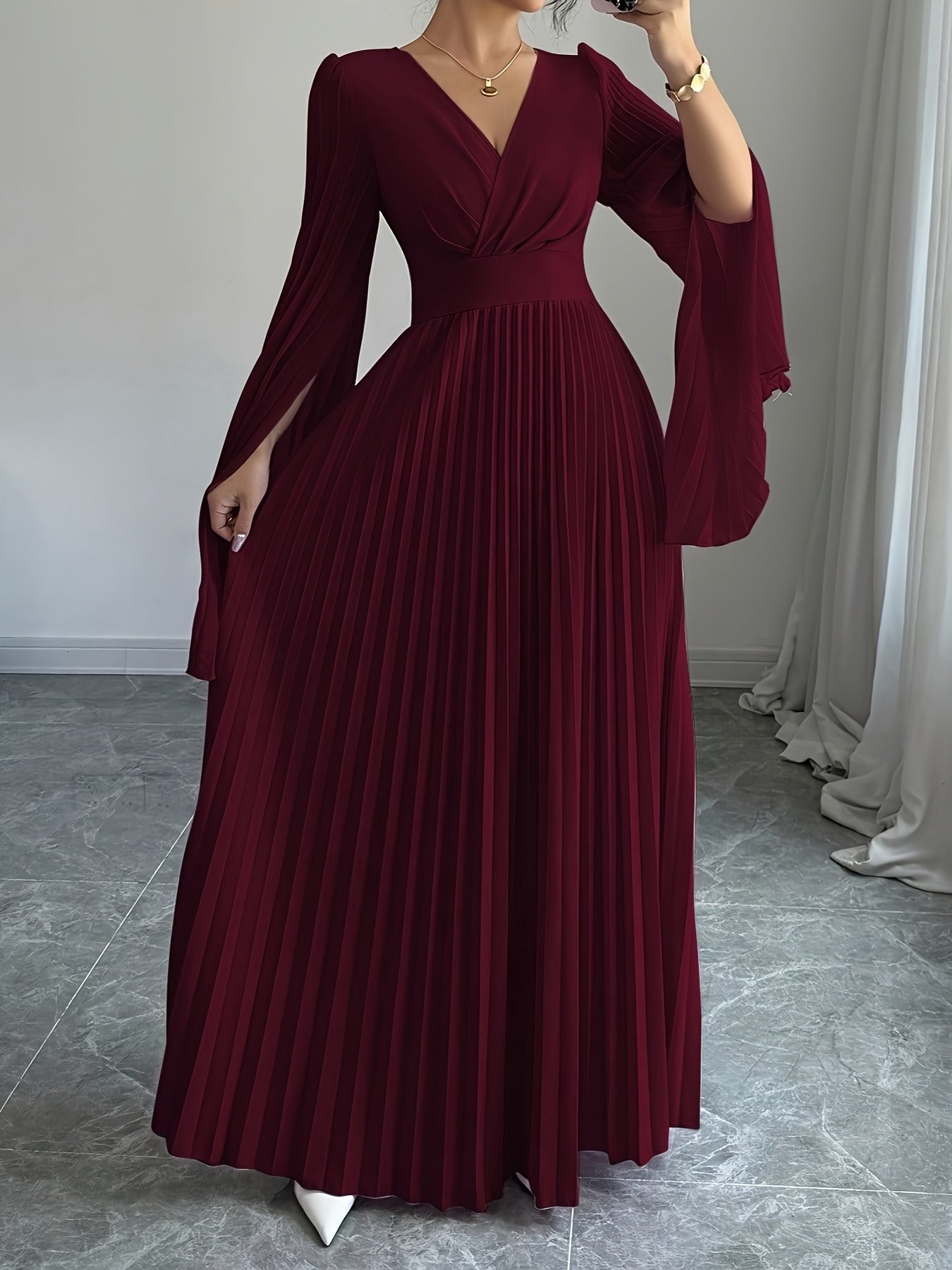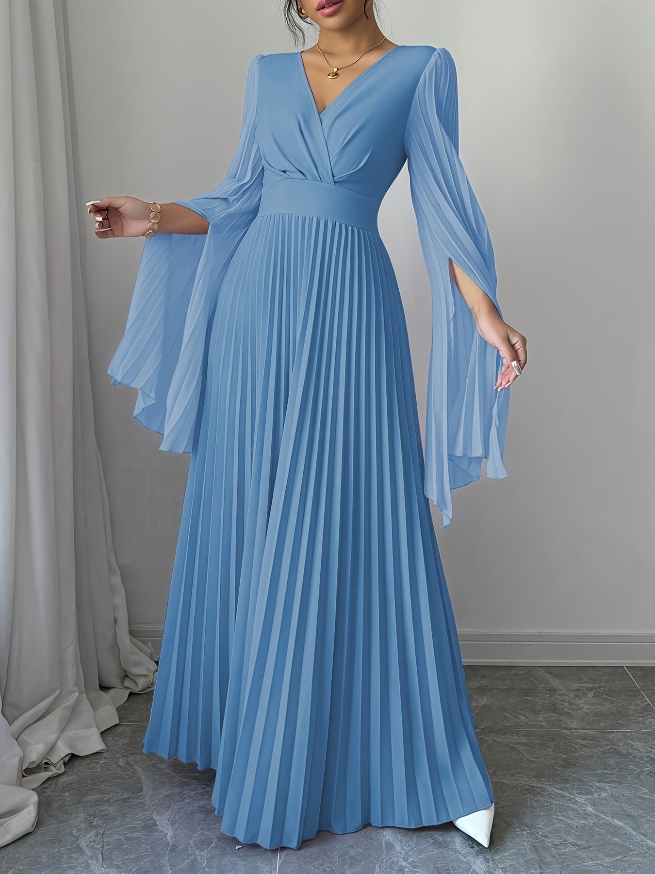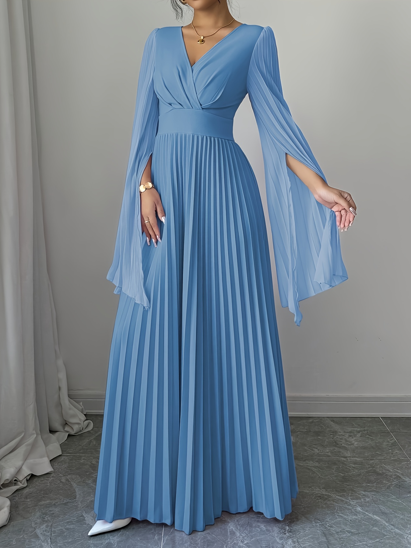 Elegant And Romantic Long Dress for Women with a V-Neck And Pleated Open Sleeves, Perfect for Parties, Gatherings, And Casual Occasions. This Solid Color, Waist-Cinching, Pleated Skirt Is a Fashionable And Versatile Choice fo
