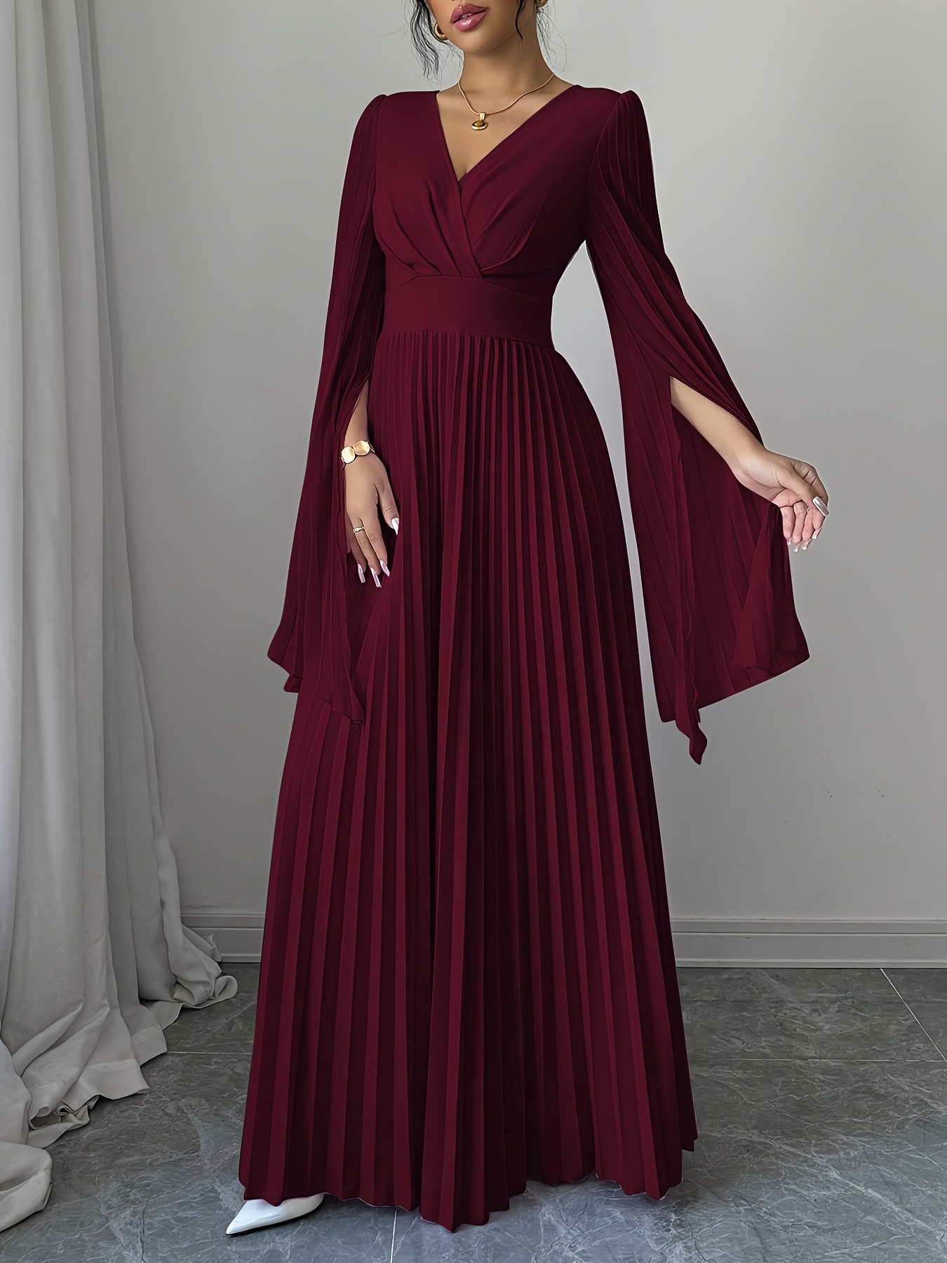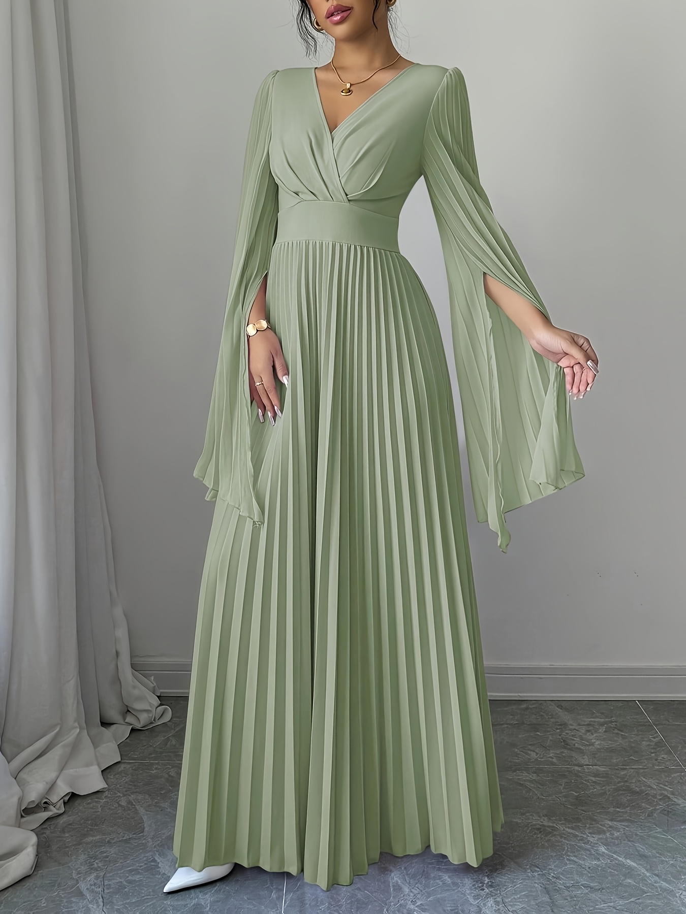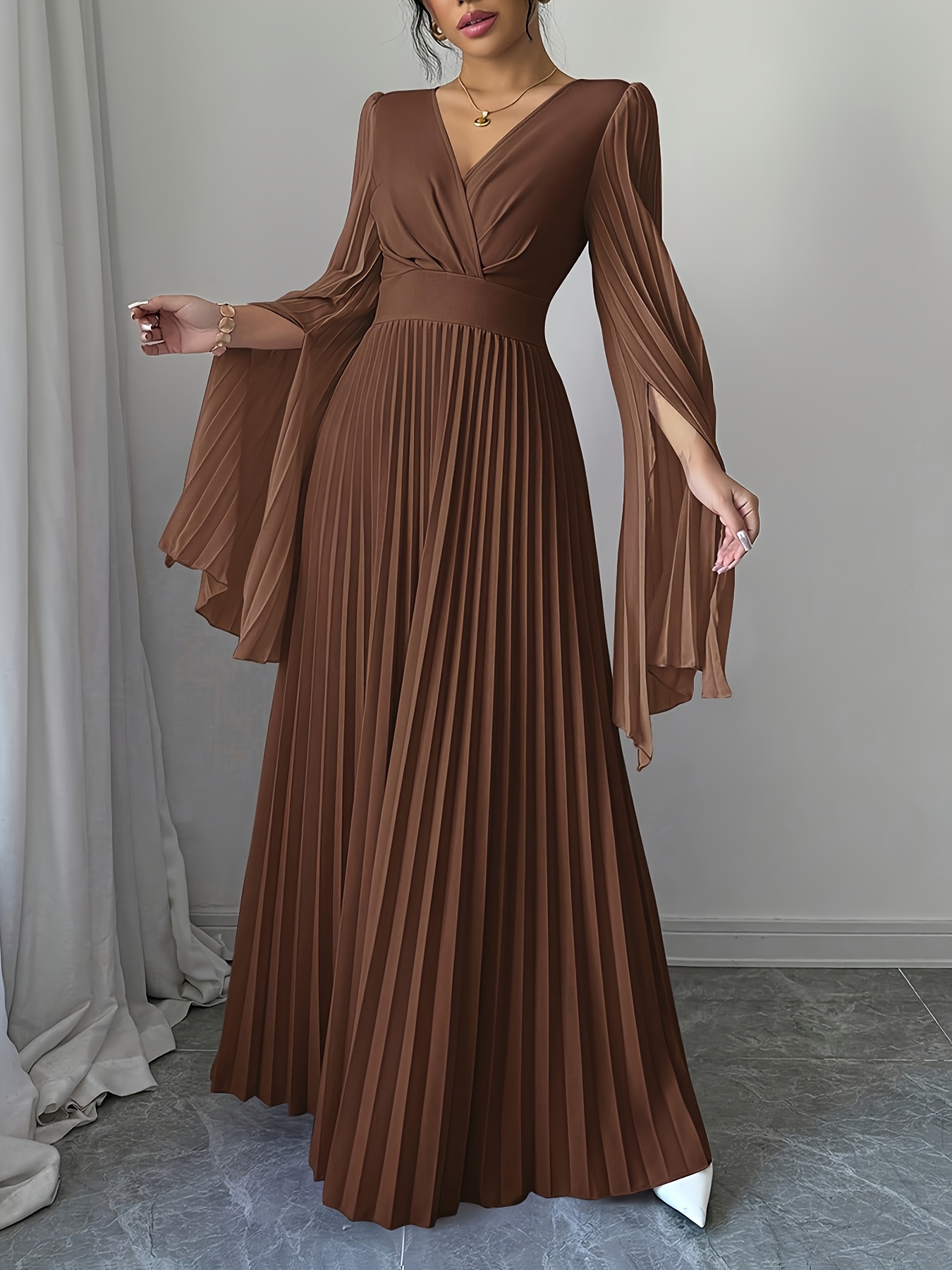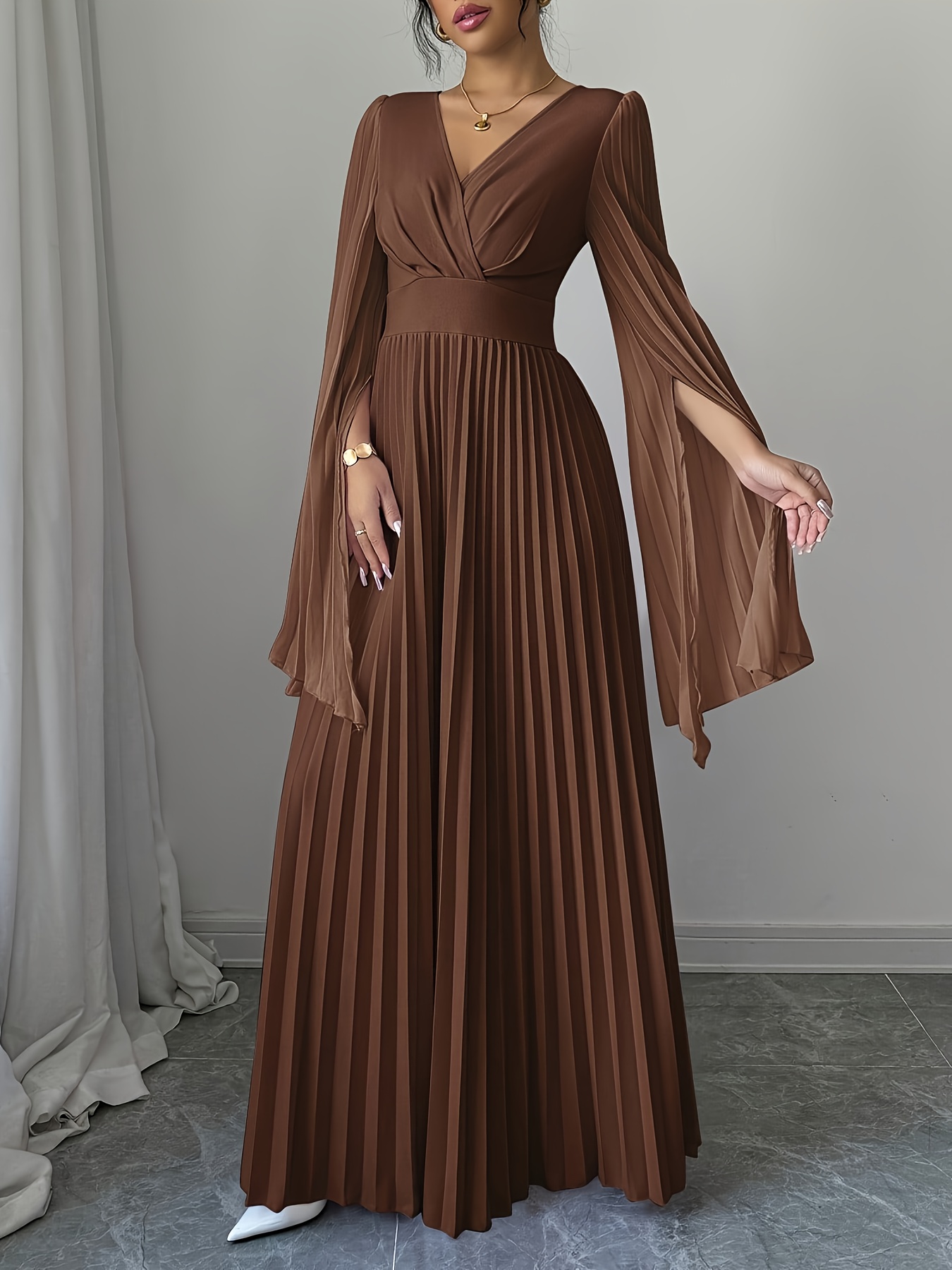 Elegant Long-Sleeve V-Neck Pleated Maxi Dress for Women, Perfect for Spring And Summer.
