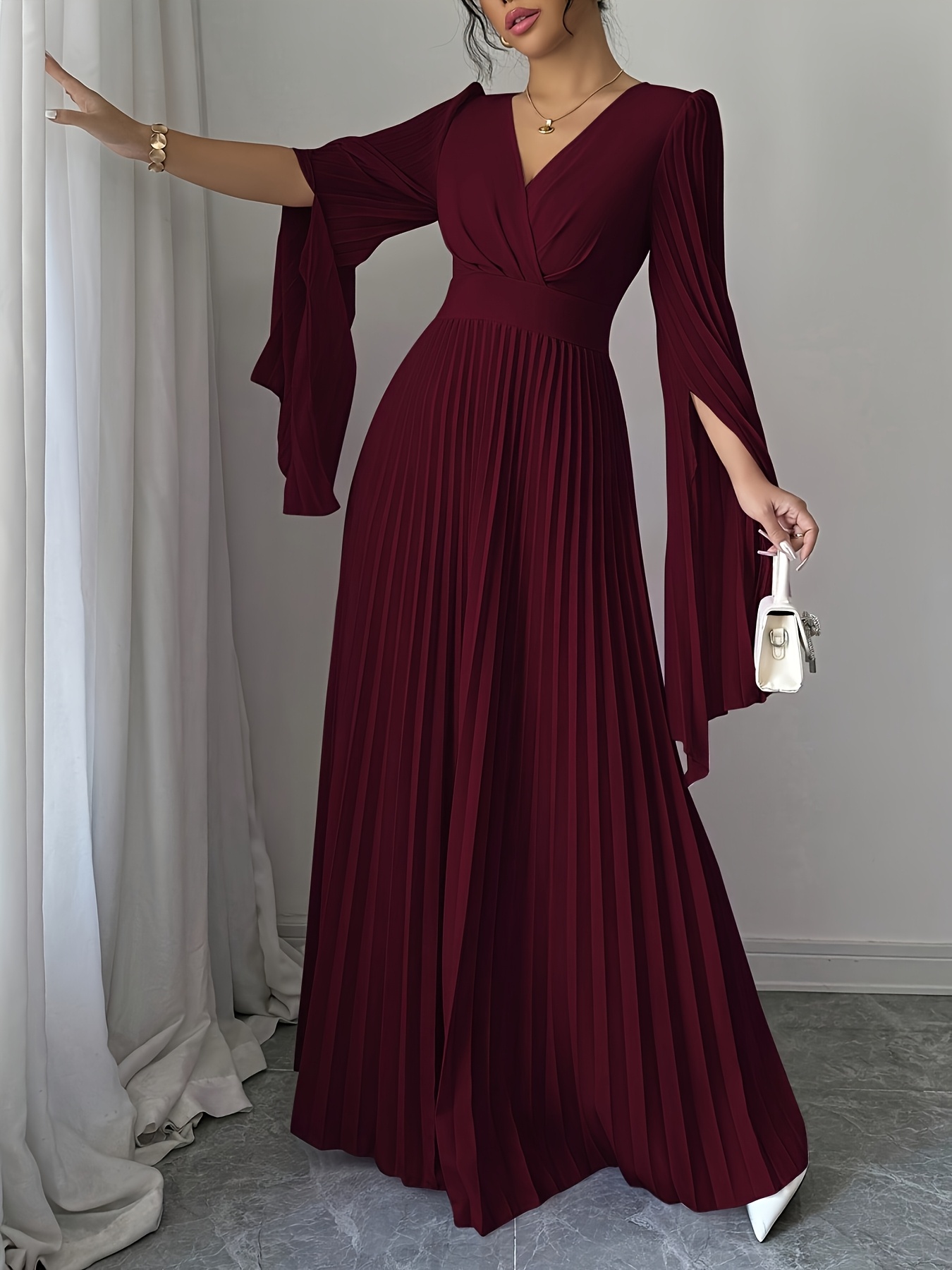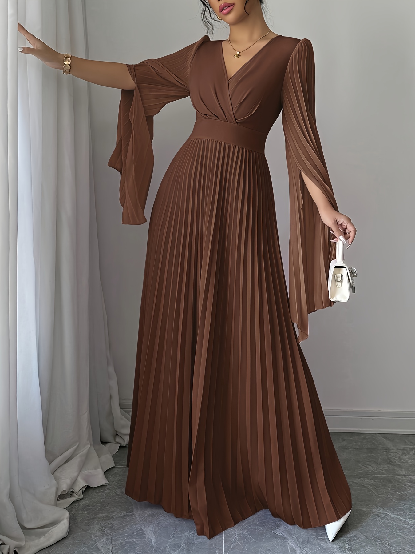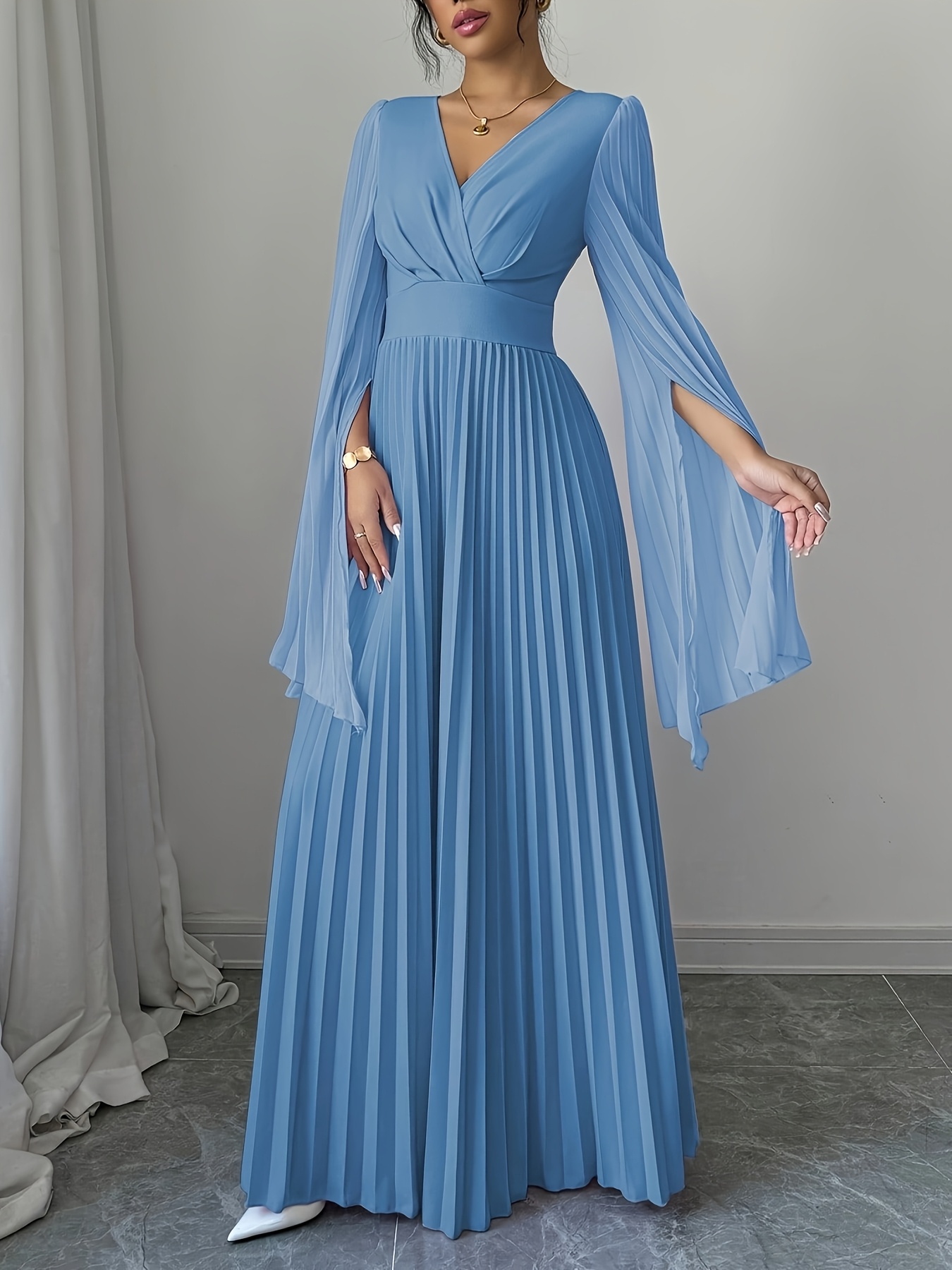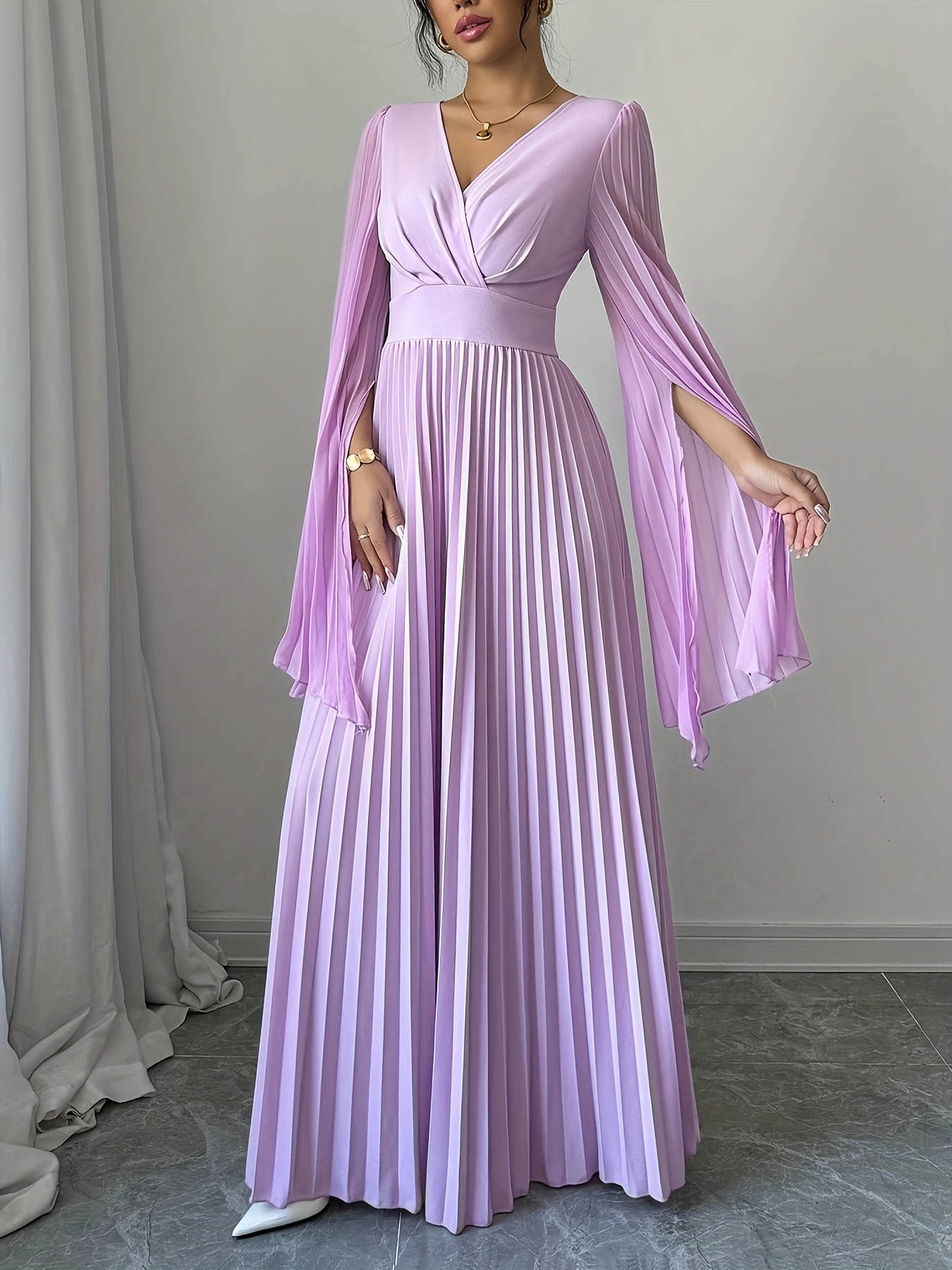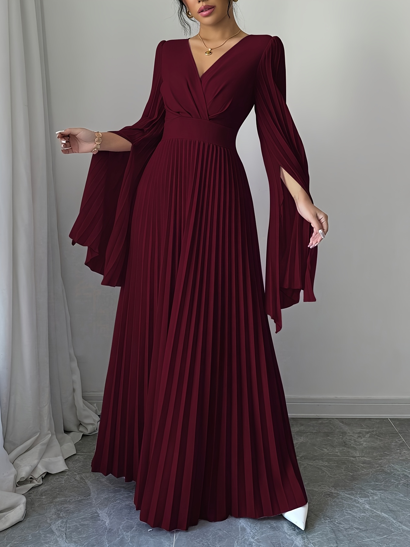 Elegant Long-Sleeve V-Neck Pleated Maxi Dress for Women, Perfect for Spring And Summer.