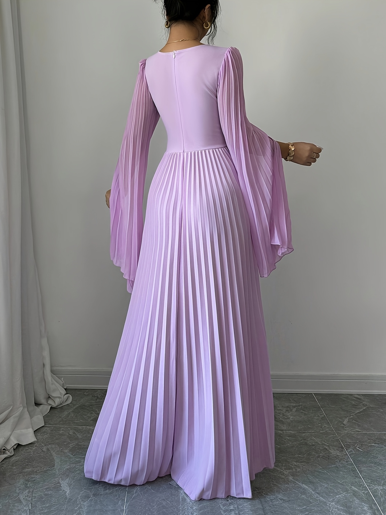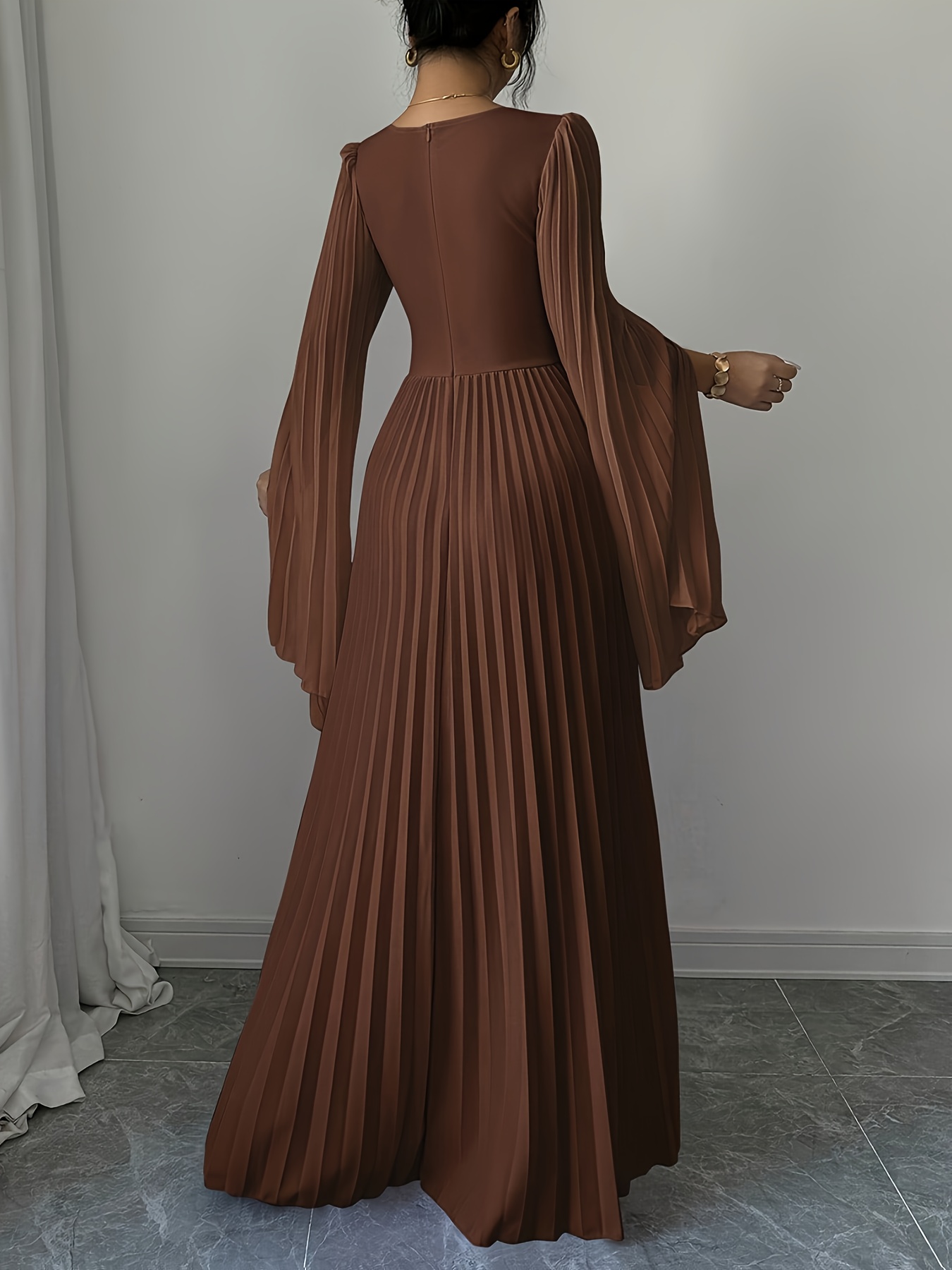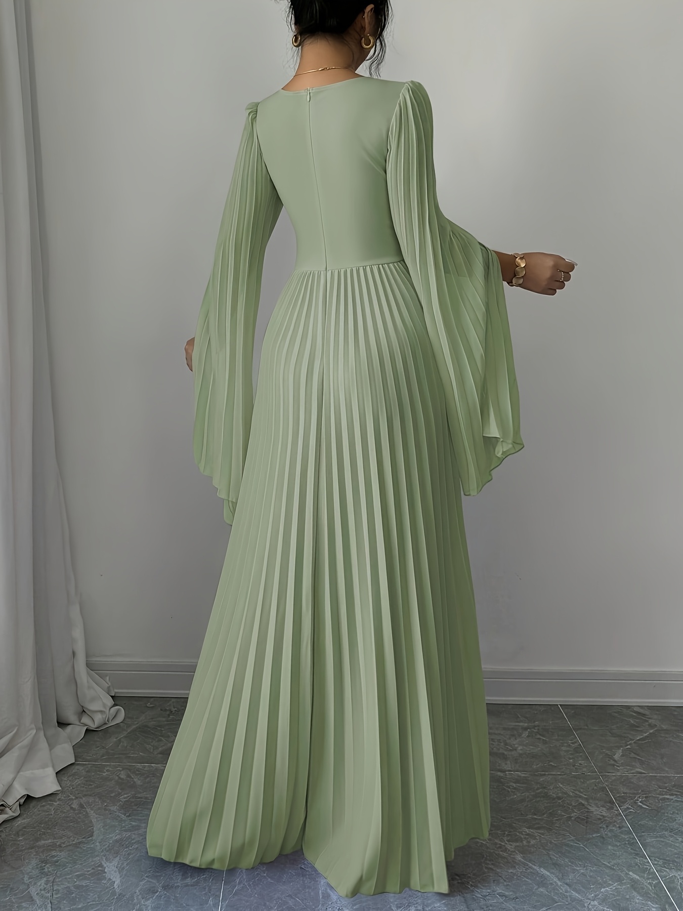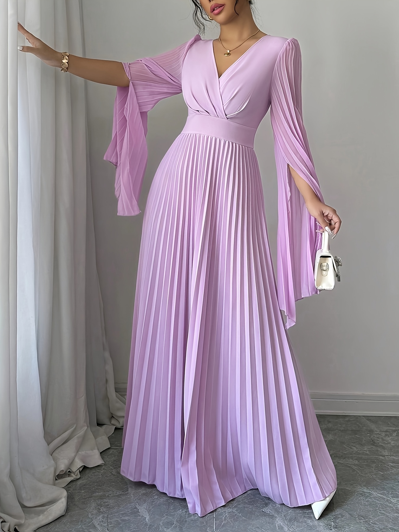 Elegant Long-Sleeve V-Neck Pleated Maxi Dress for Women, Perfect for Spring And Summer.