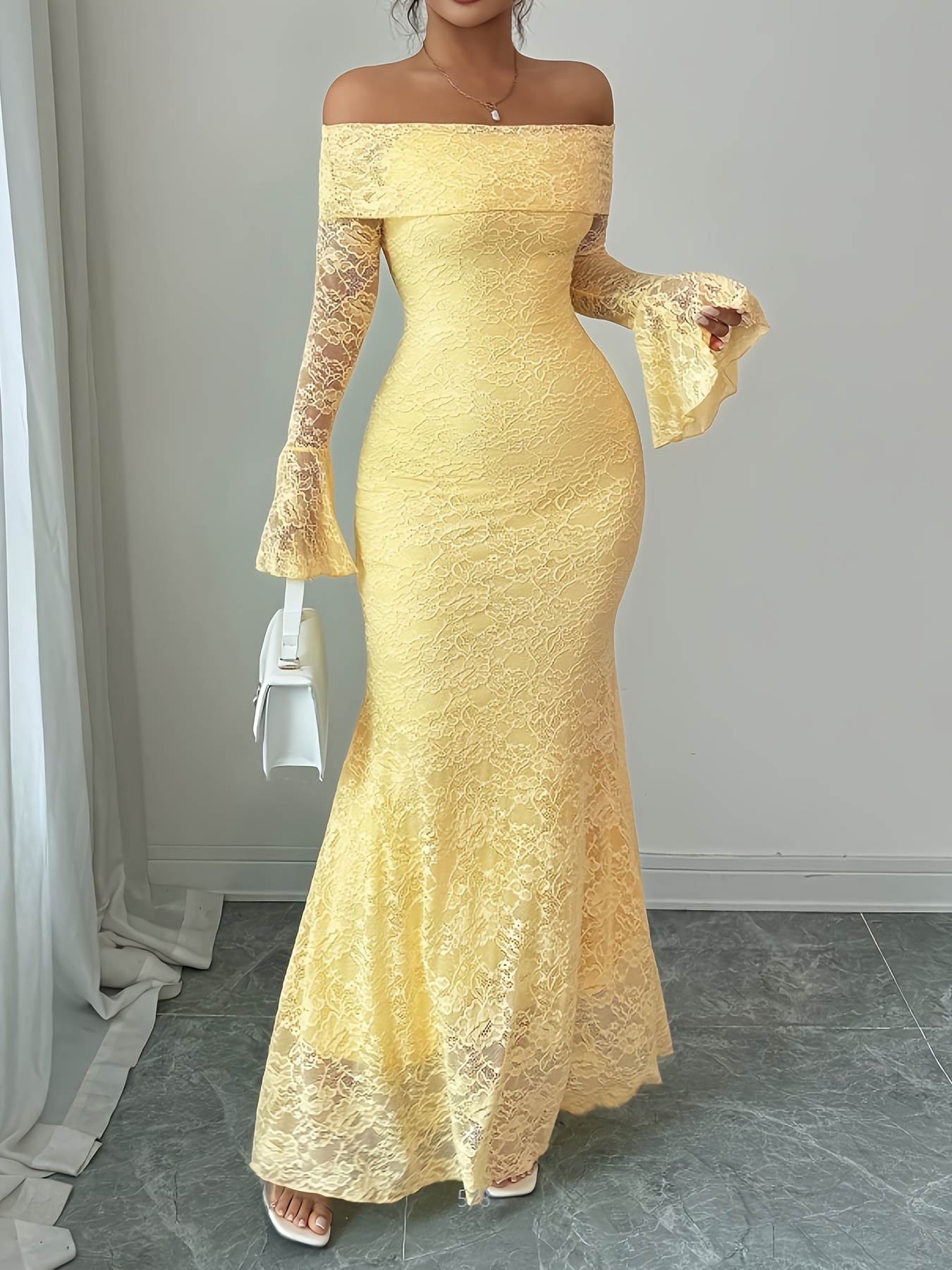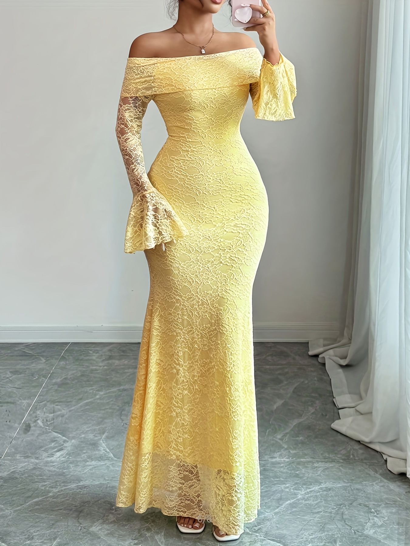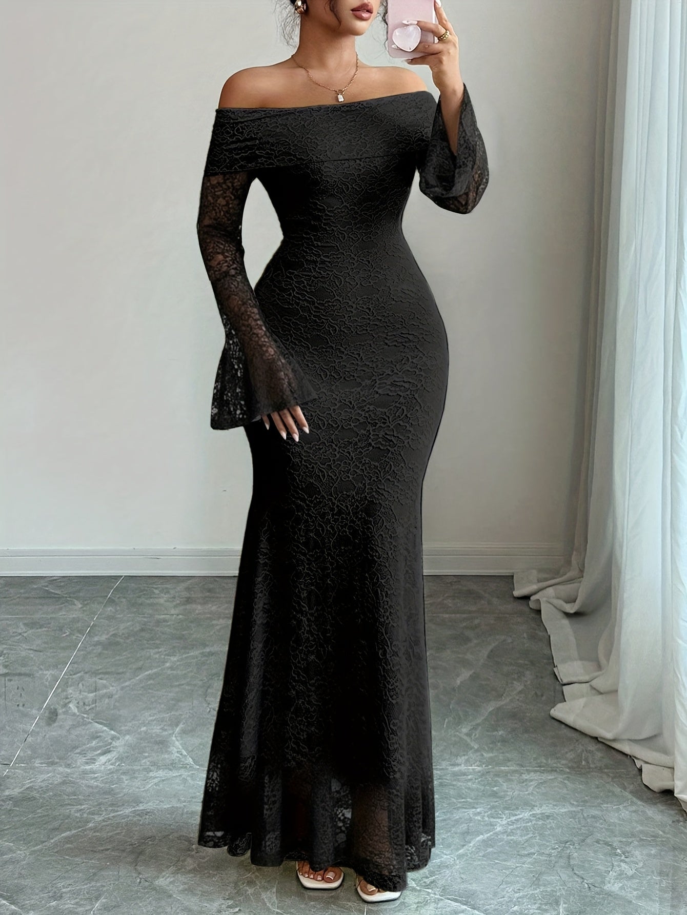 Elegant Off the Shoulder Long Dress with Contrast Lace Details | Women'S Sexy Bell Sleeves and Pendulum Style, Solid Color, Suitable for All Seasons