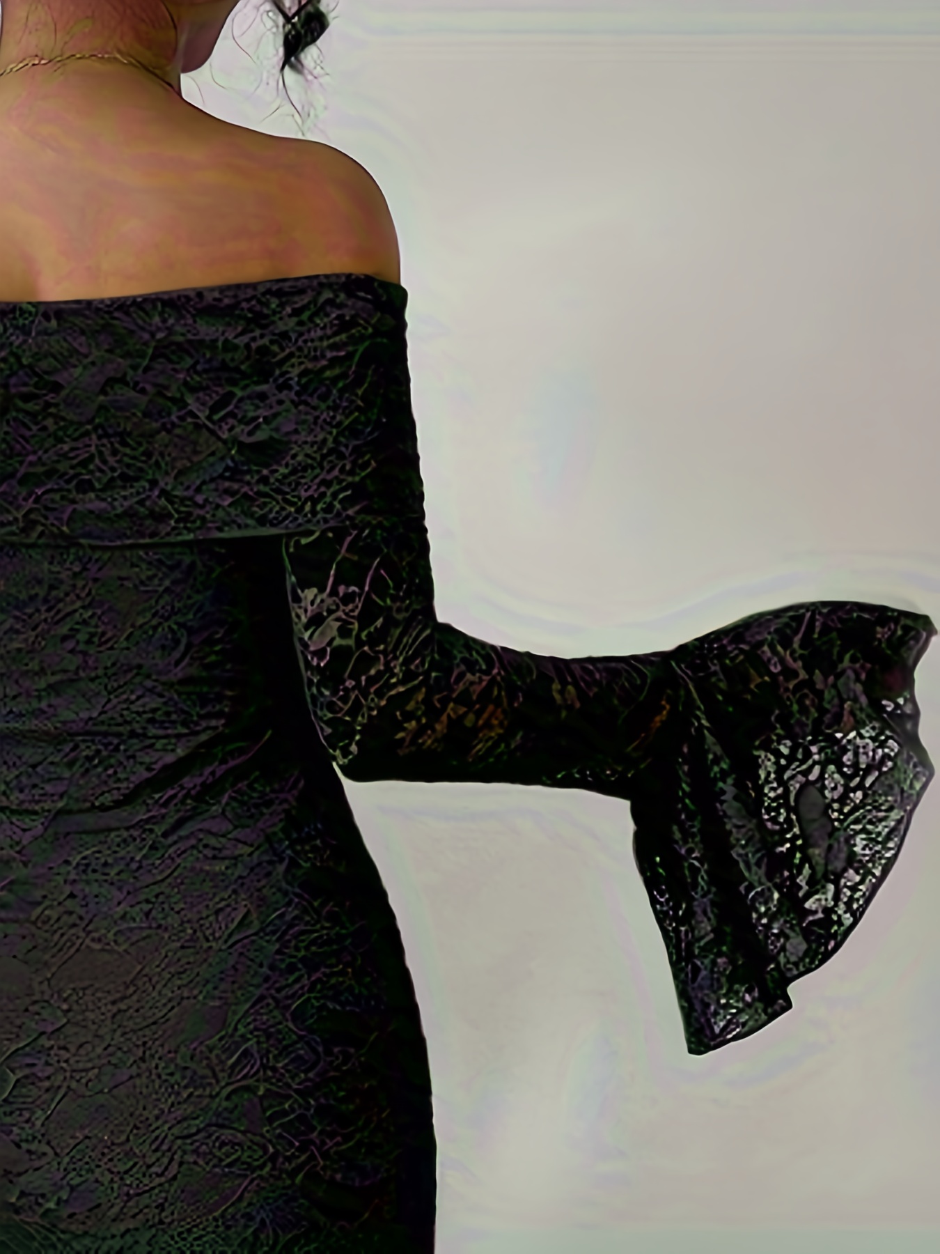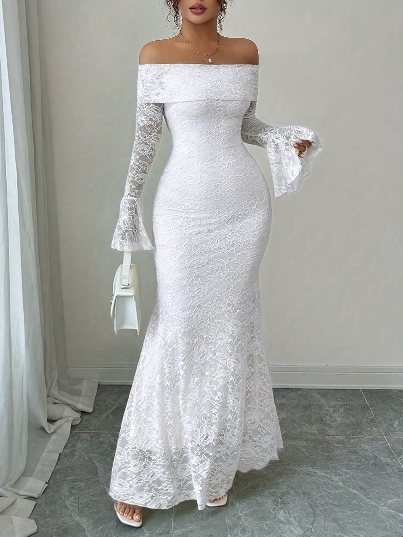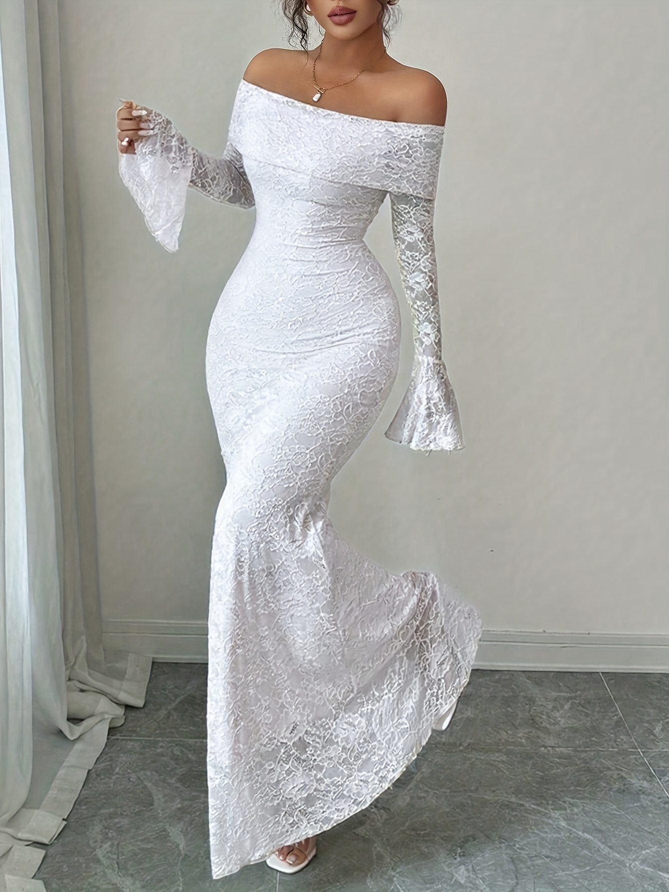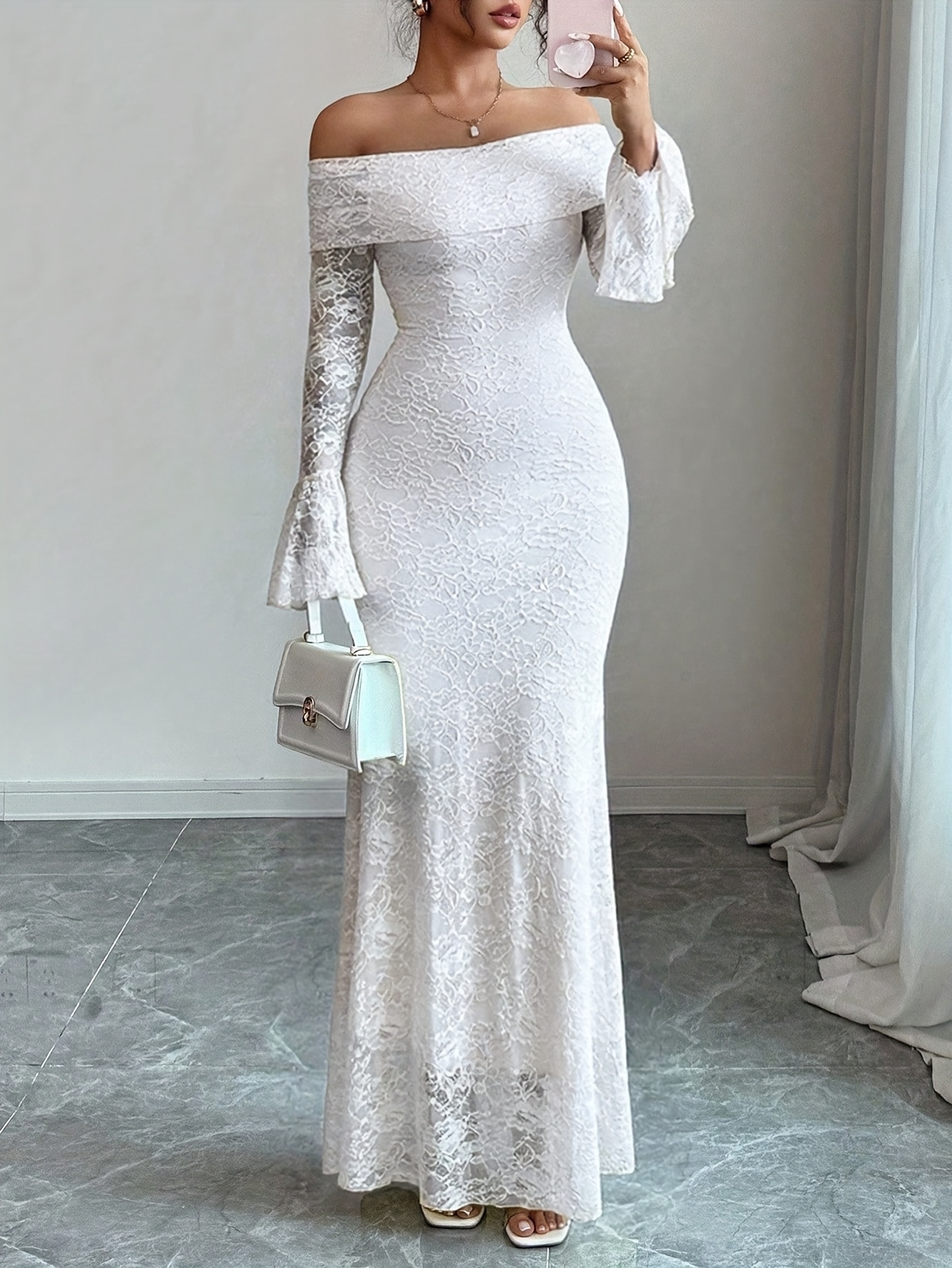 Elegant Off the Shoulder Long Dress with Contrast Lace Details | Women'S Sexy Bell Sleeves and Pendulum Style, Solid Color, Suitable for All Seasons