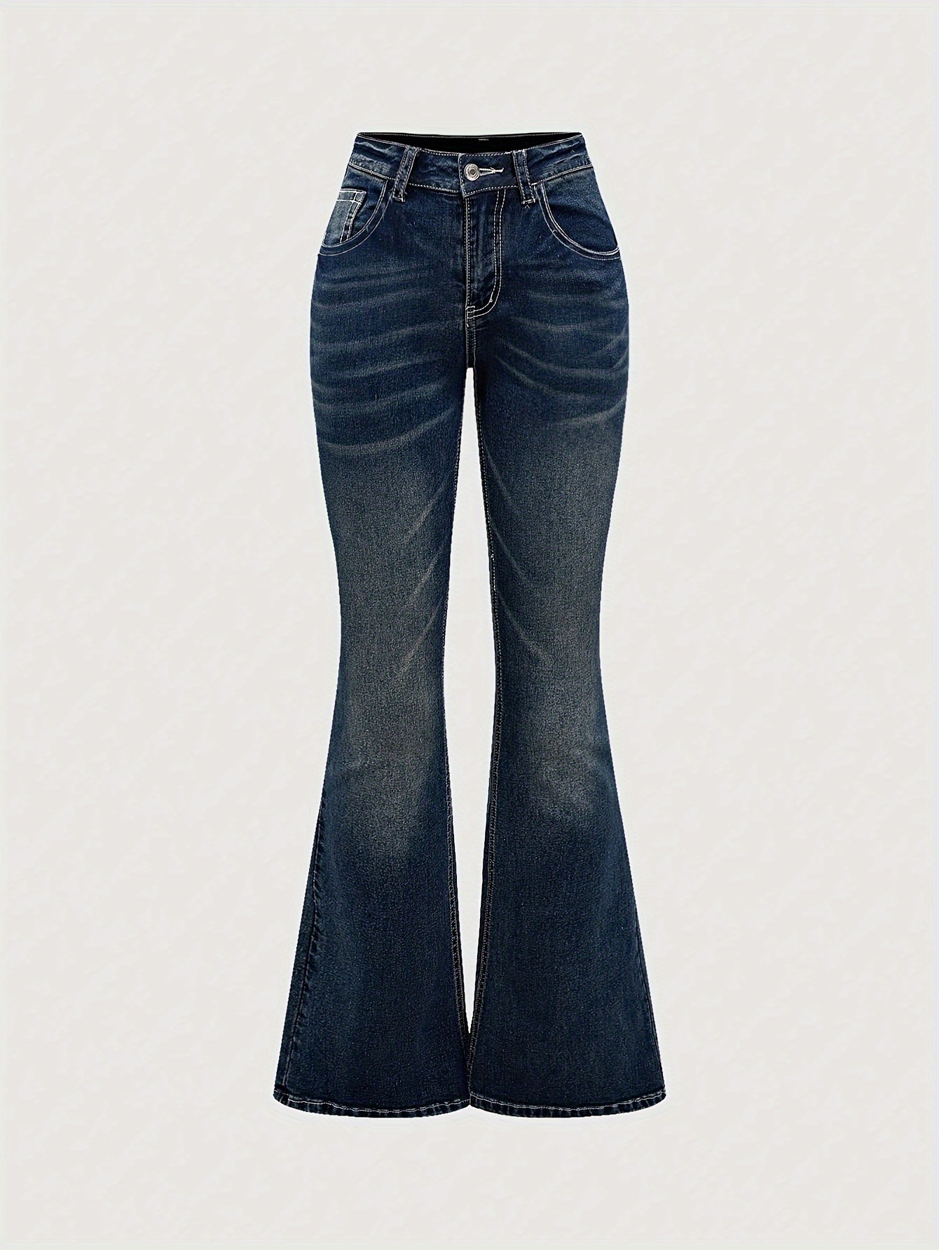 Jeans Femme Élégant Évasé Extensible Denim Poches Brodées Strass Confort Taille Mi-Haute Poches Obliques Toute Saison