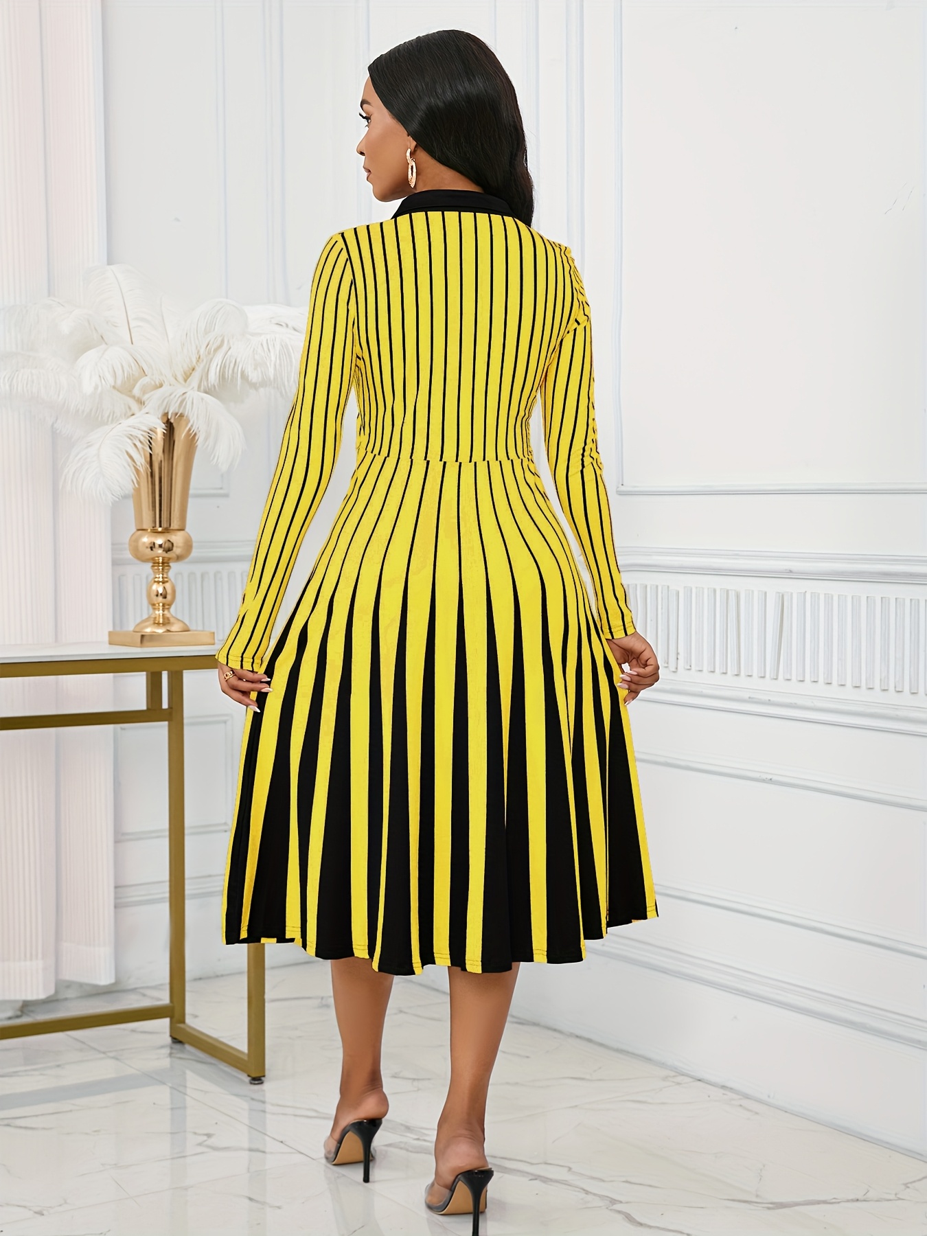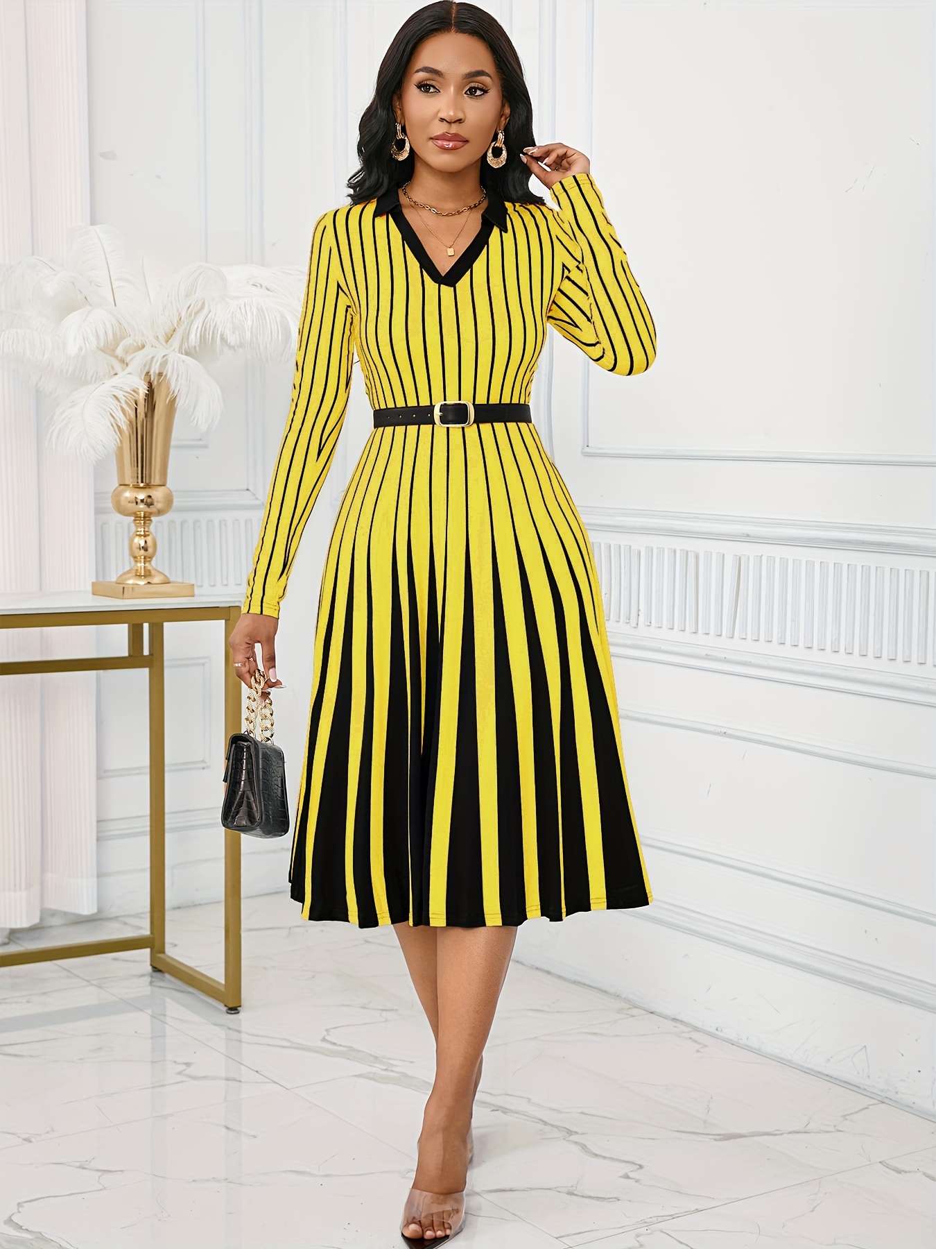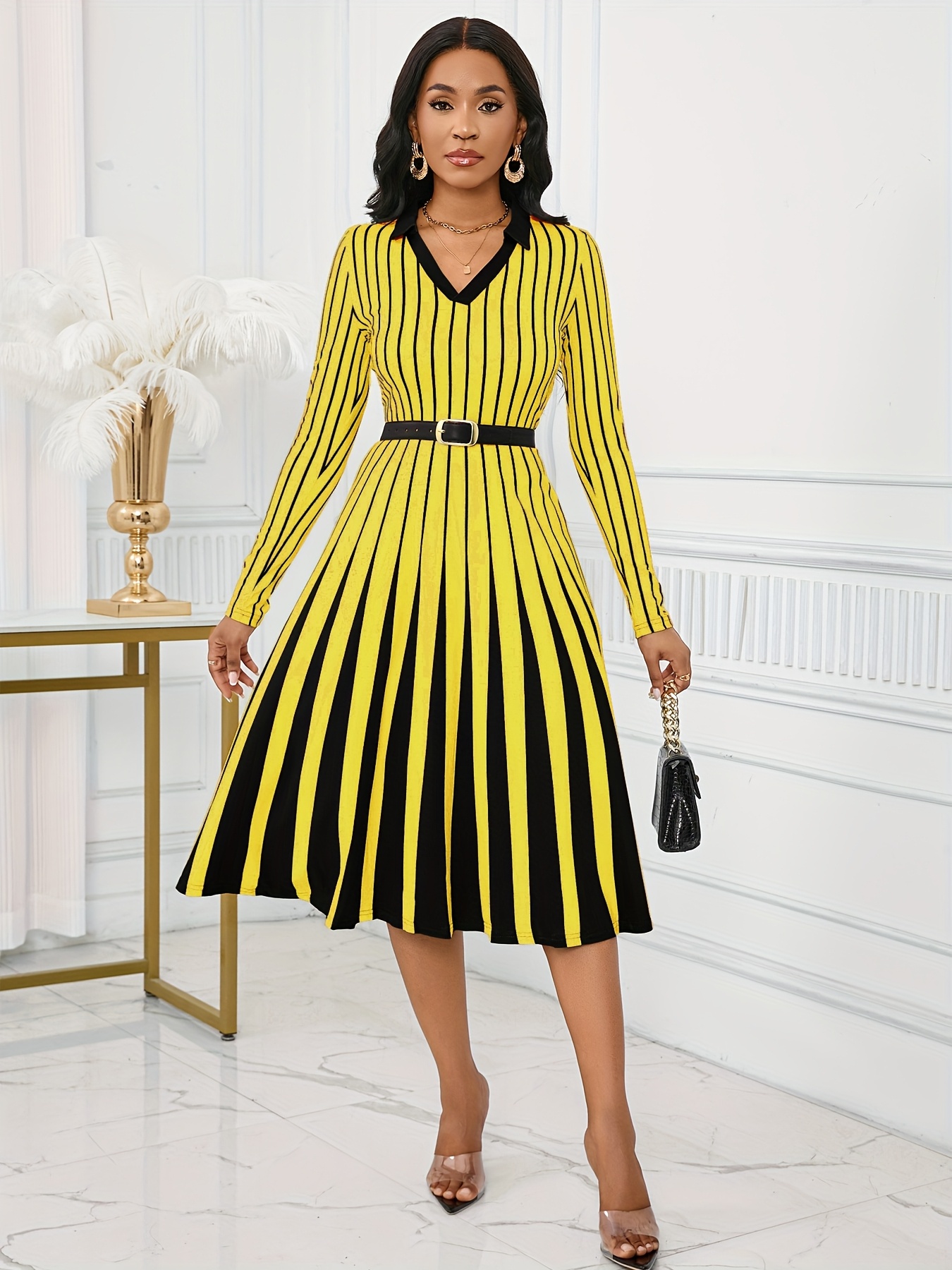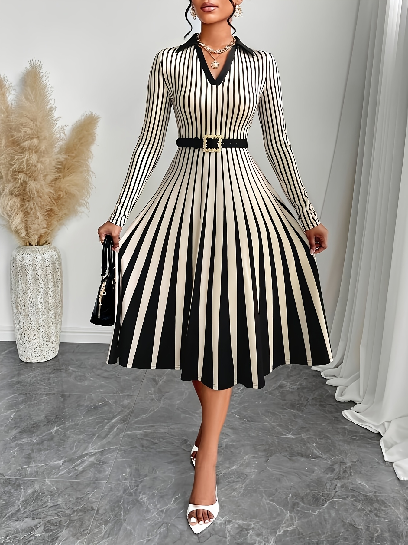 Elegant V-Neck Long Sleeve Geometric Stripe A-Line Dress - Black and White, Perfect for Spring/Fall Parties and Events, Party Dress|Striped Pattern|Vneckline