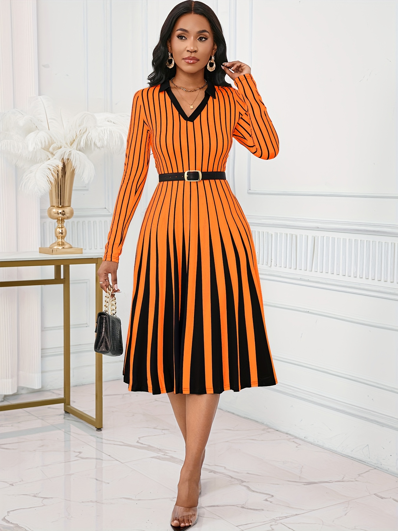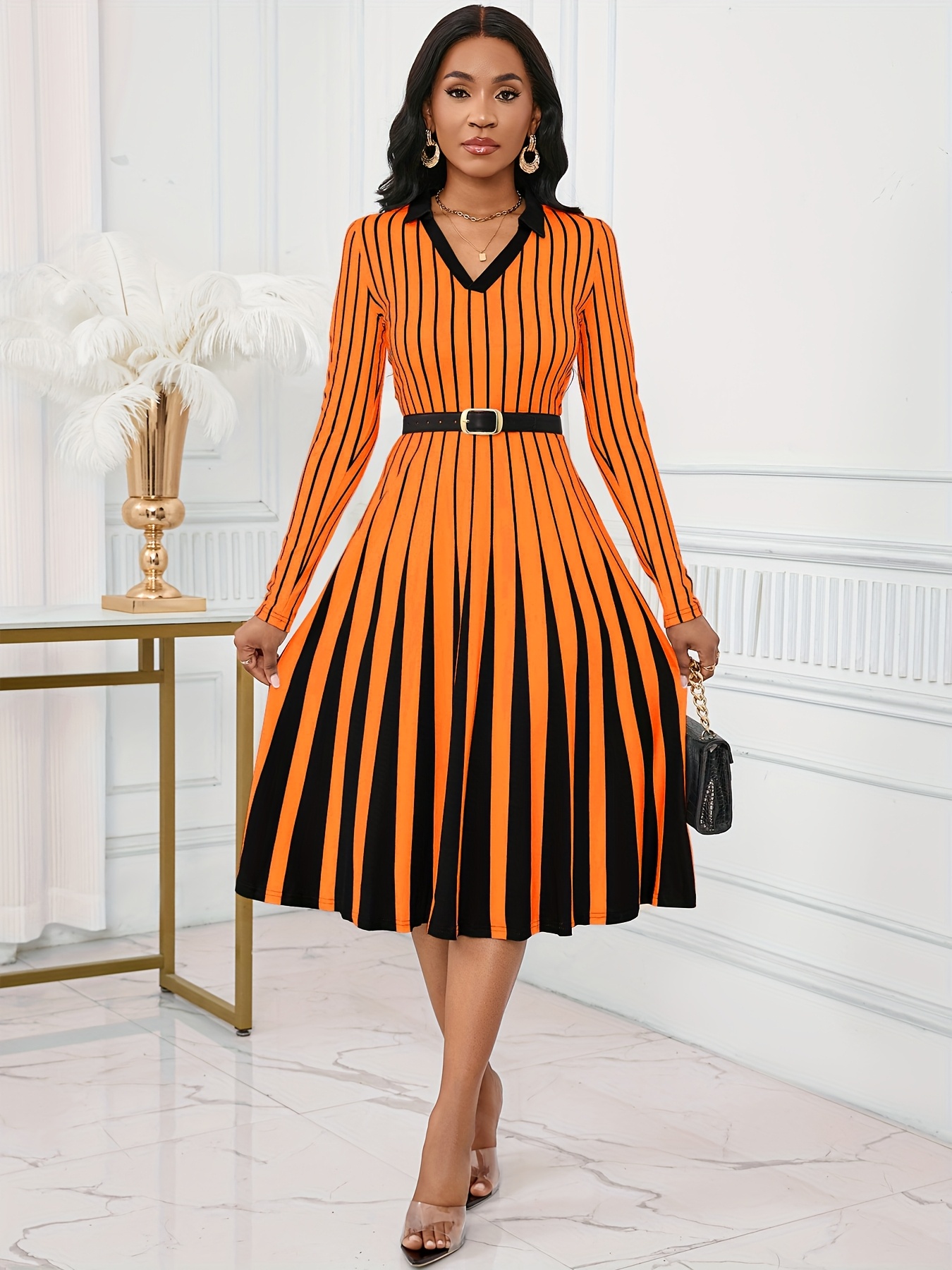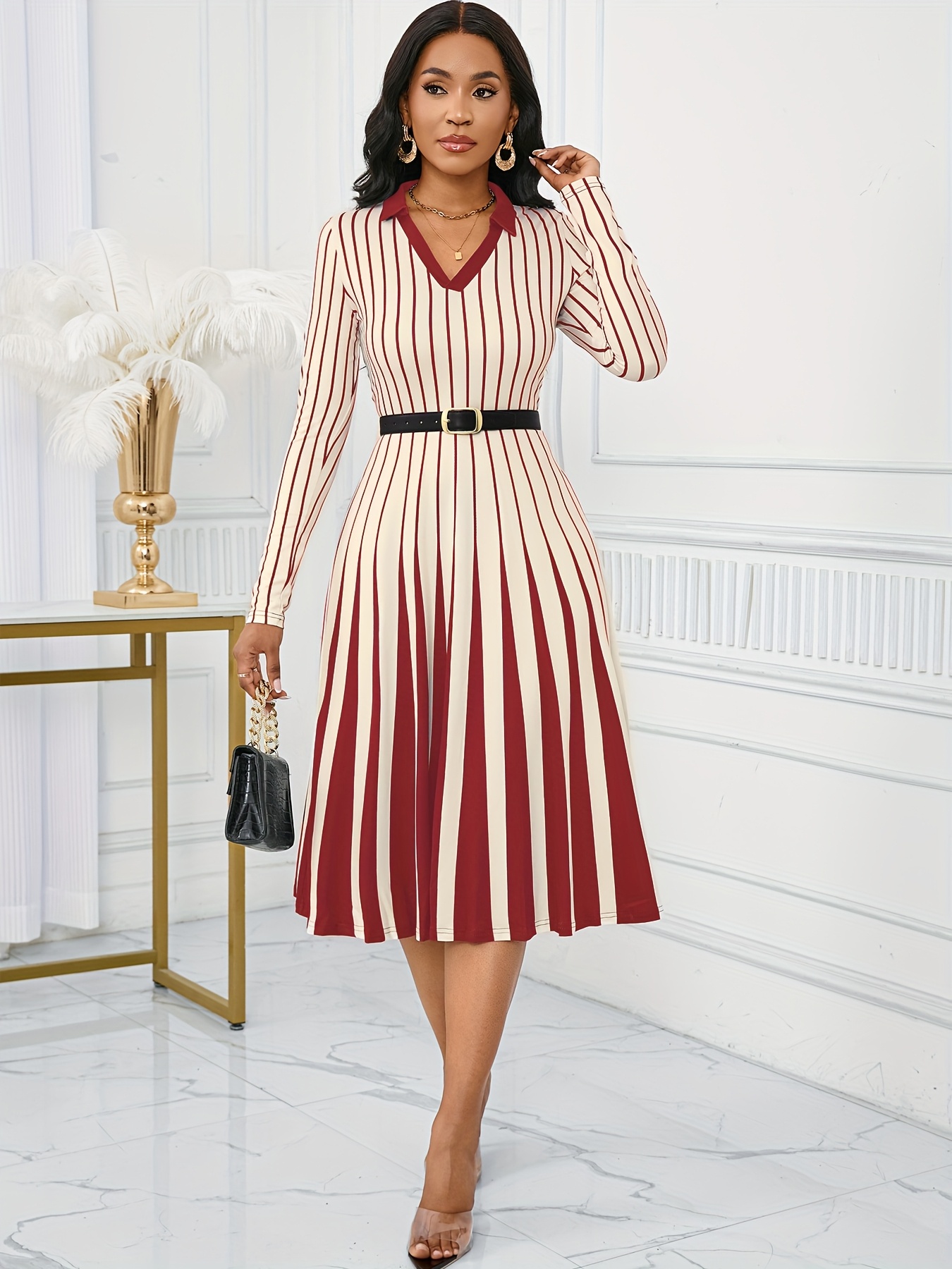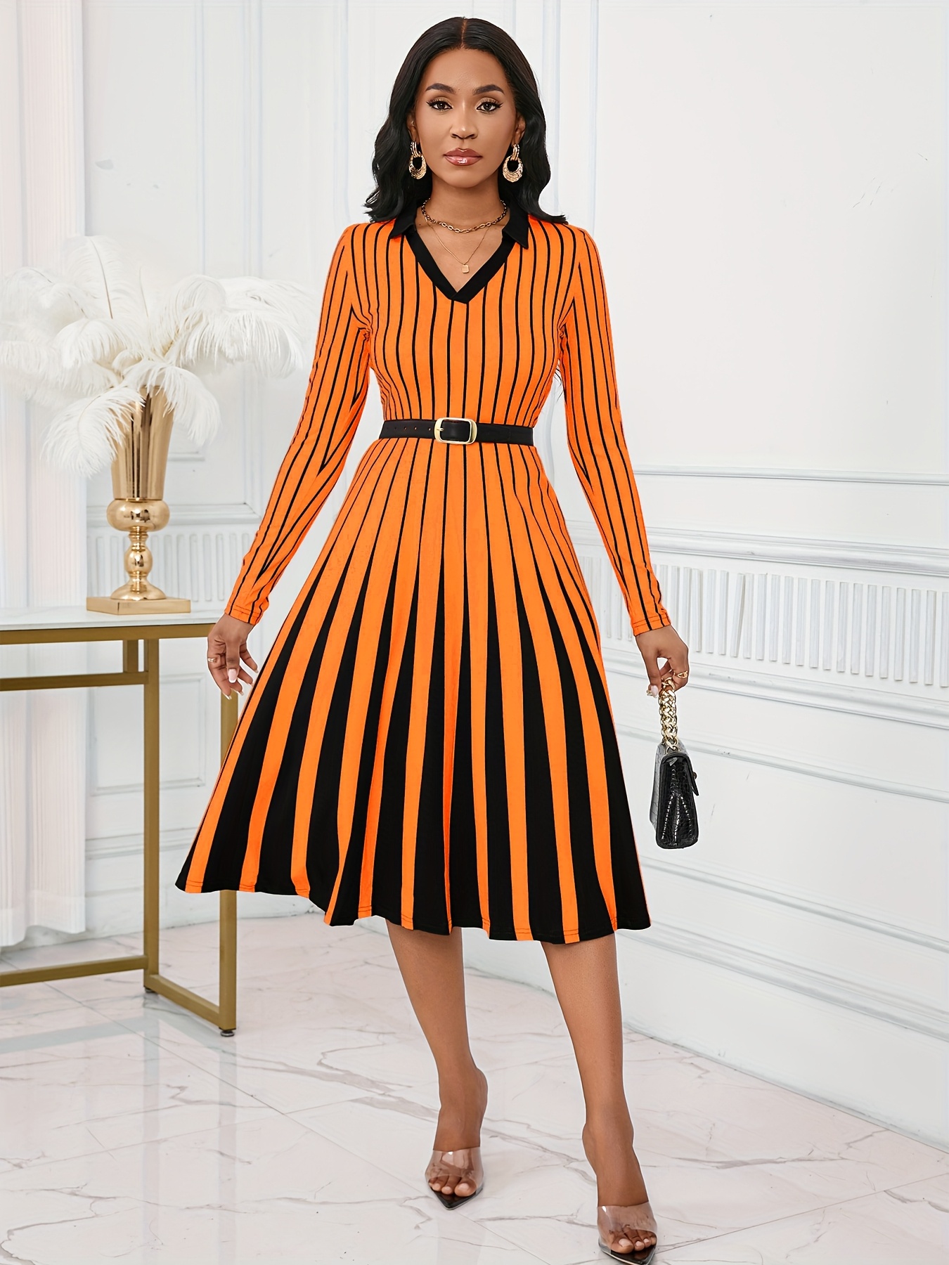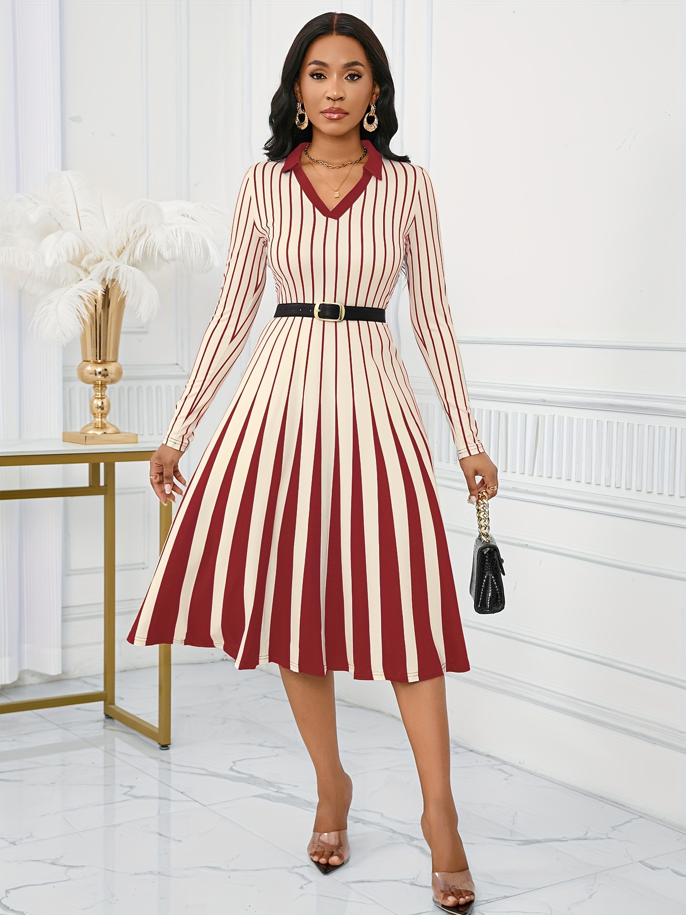 Elegant V-Neck Long Sleeve Geometric Stripe A-Line Dress - Black and White, Perfect for Spring/Fall Parties and Events, Party Dress|Striped Pattern|Vneckline