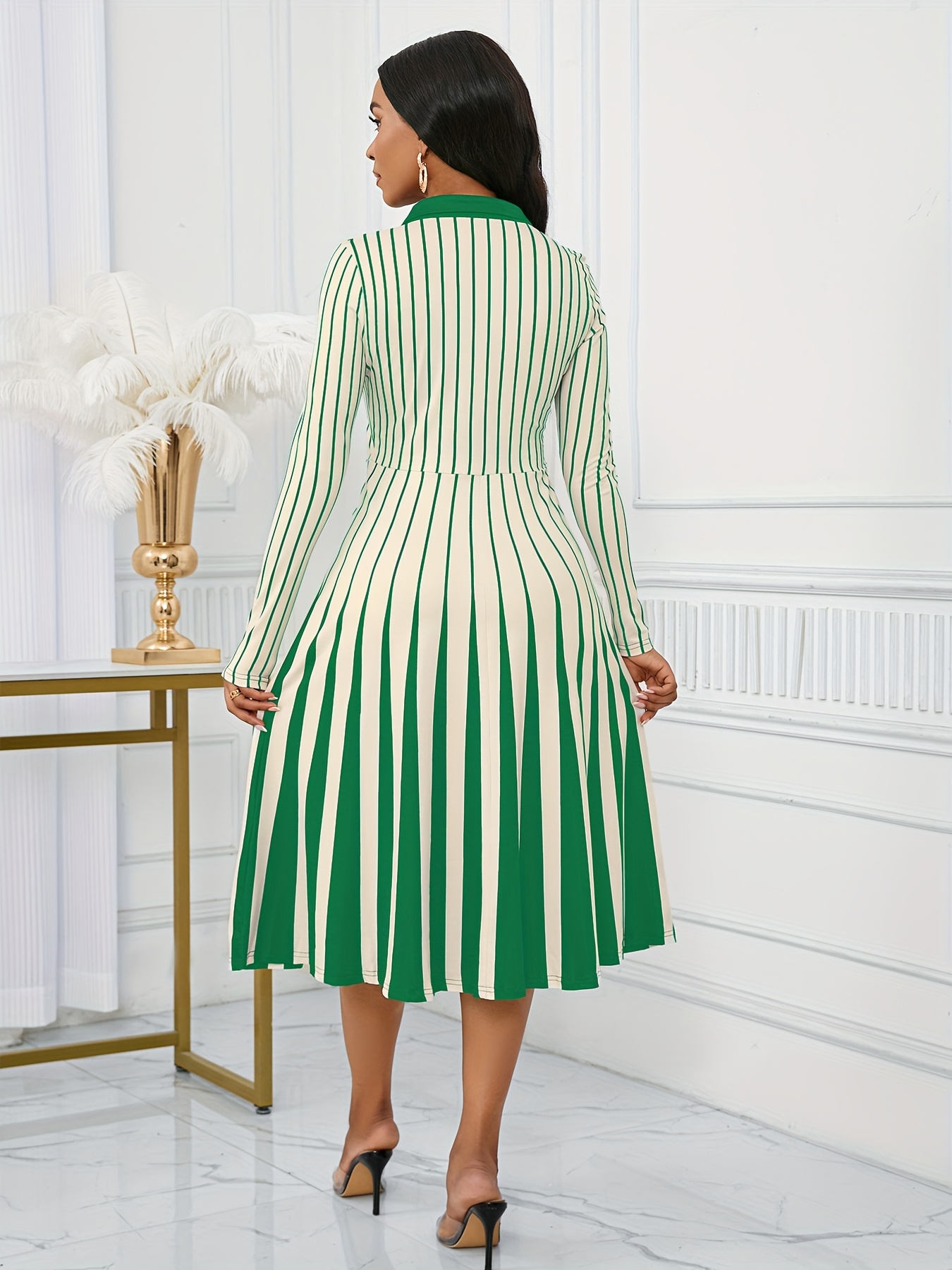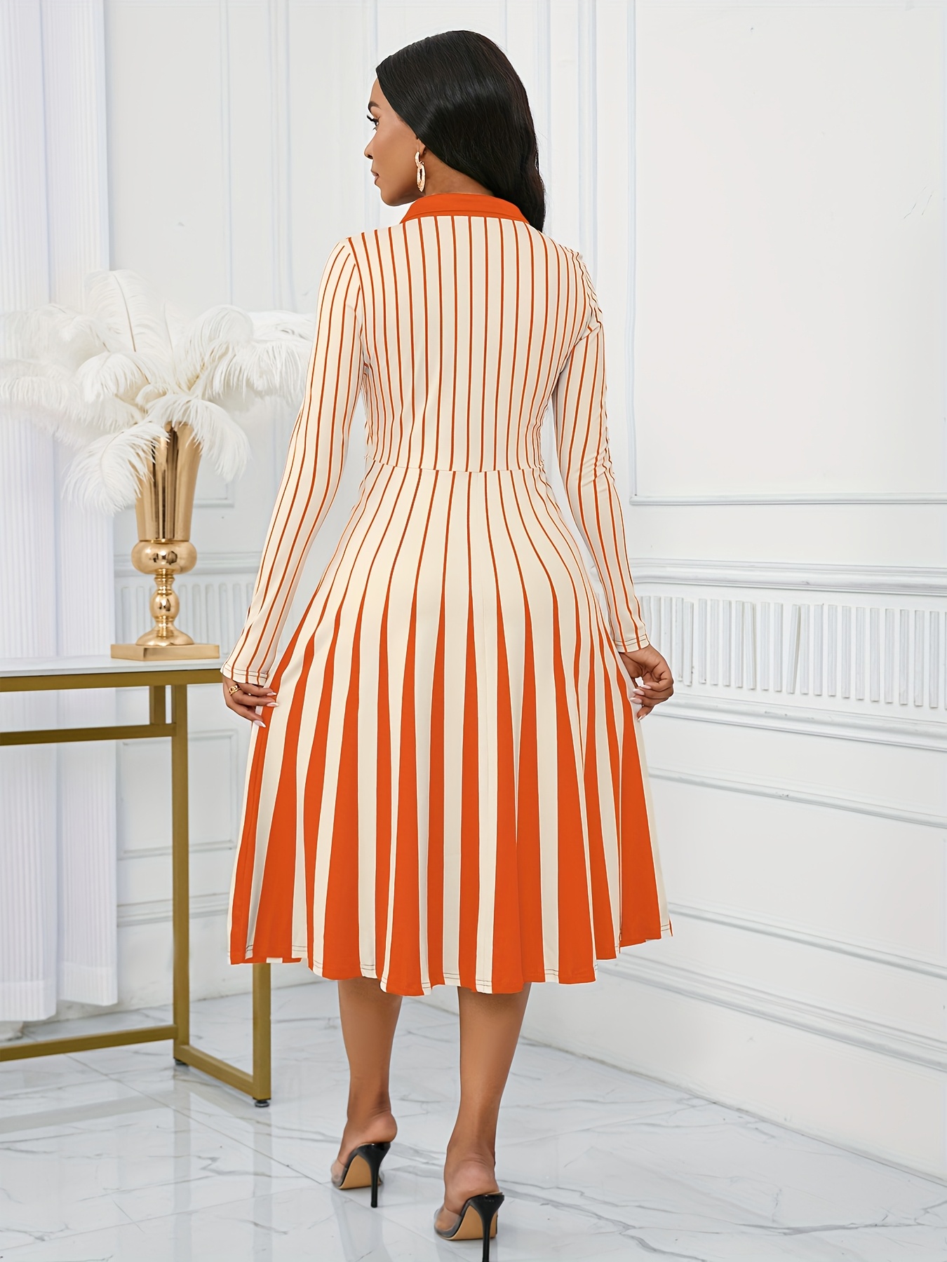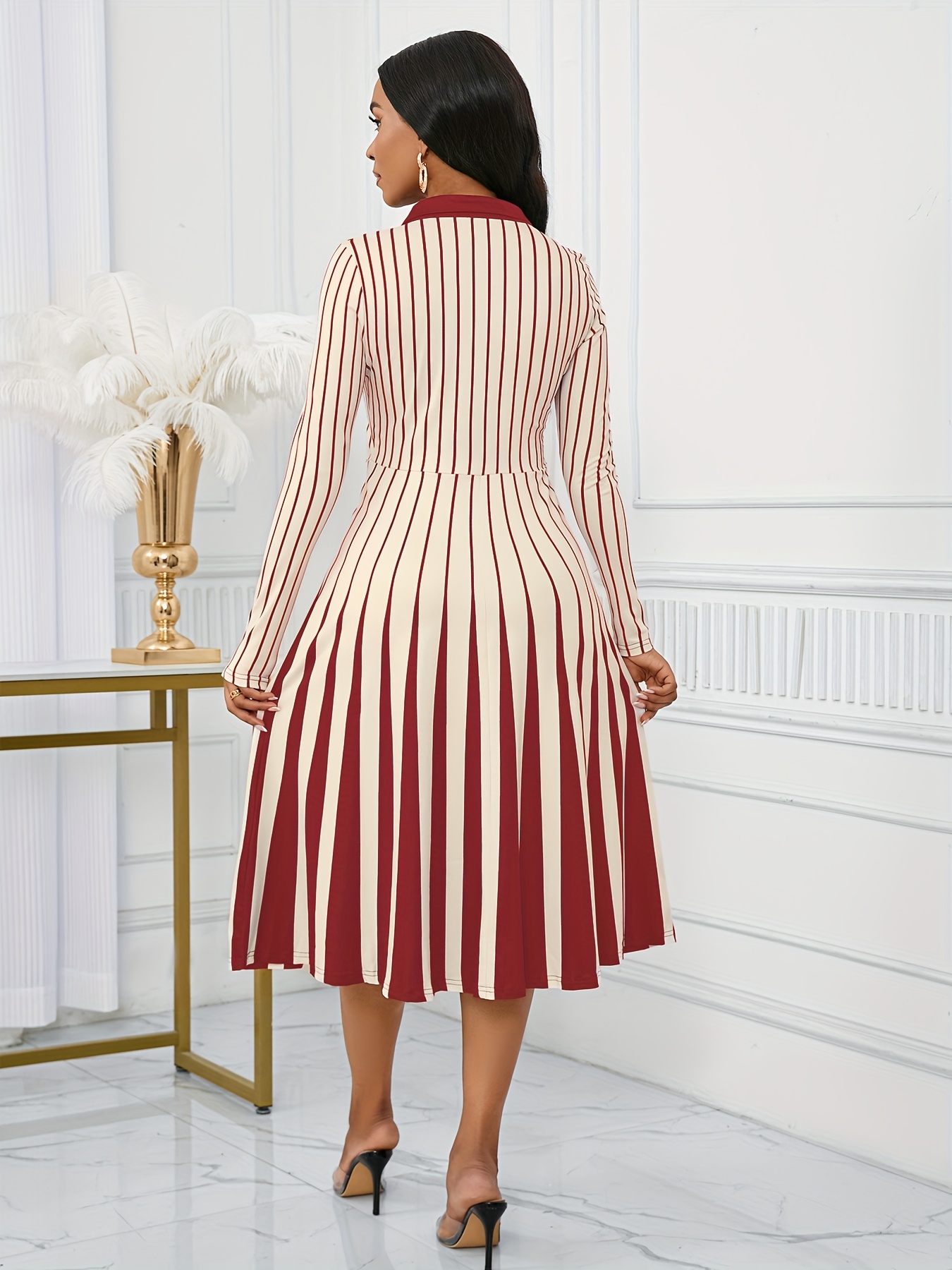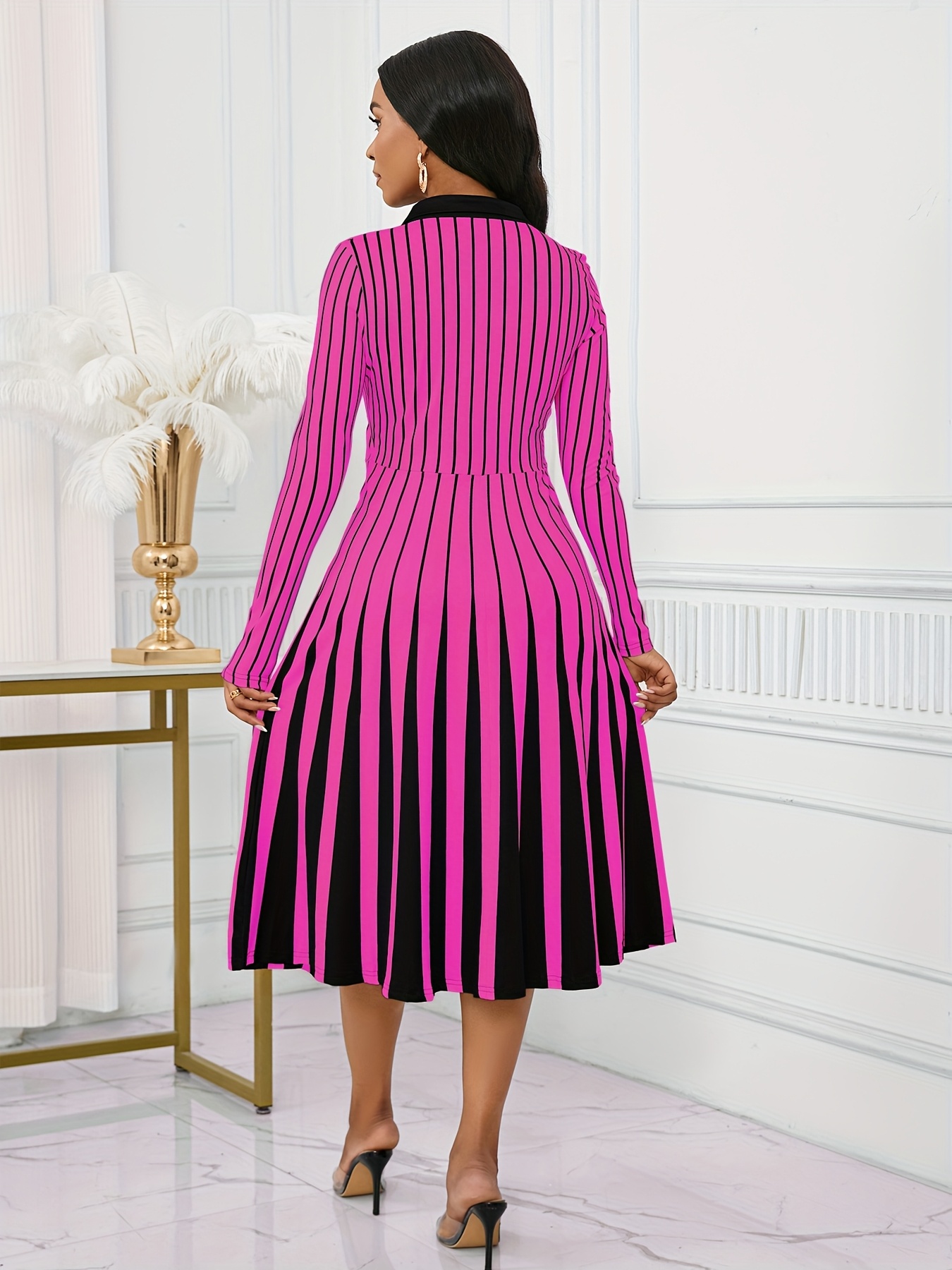 Elegant V-Neck Long Sleeve Geometric Stripe A-Line Dress - Black and White, Perfect for Spring/Fall Parties and Events, Party Dress|Striped Pattern|Vneckline