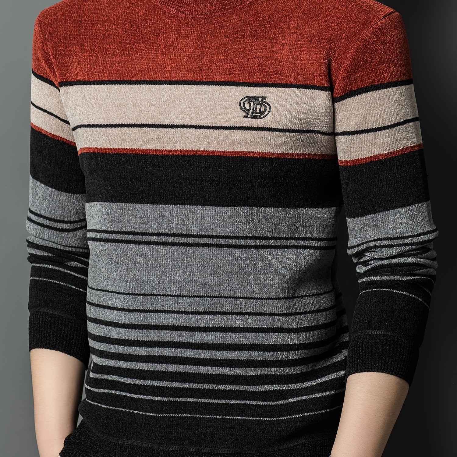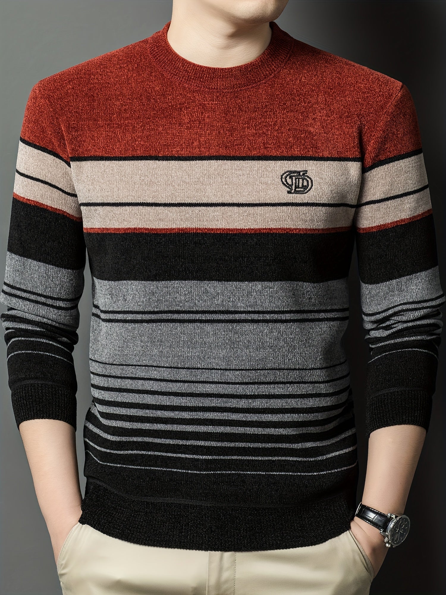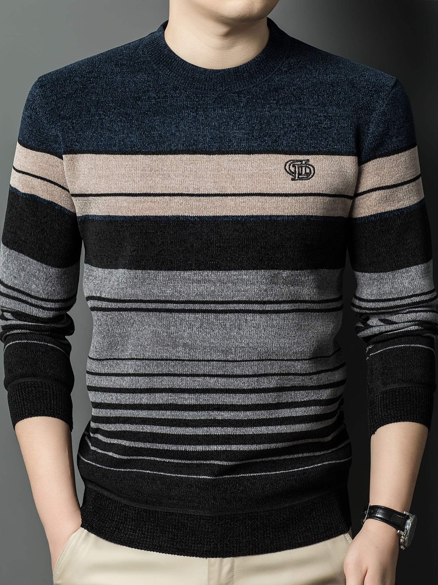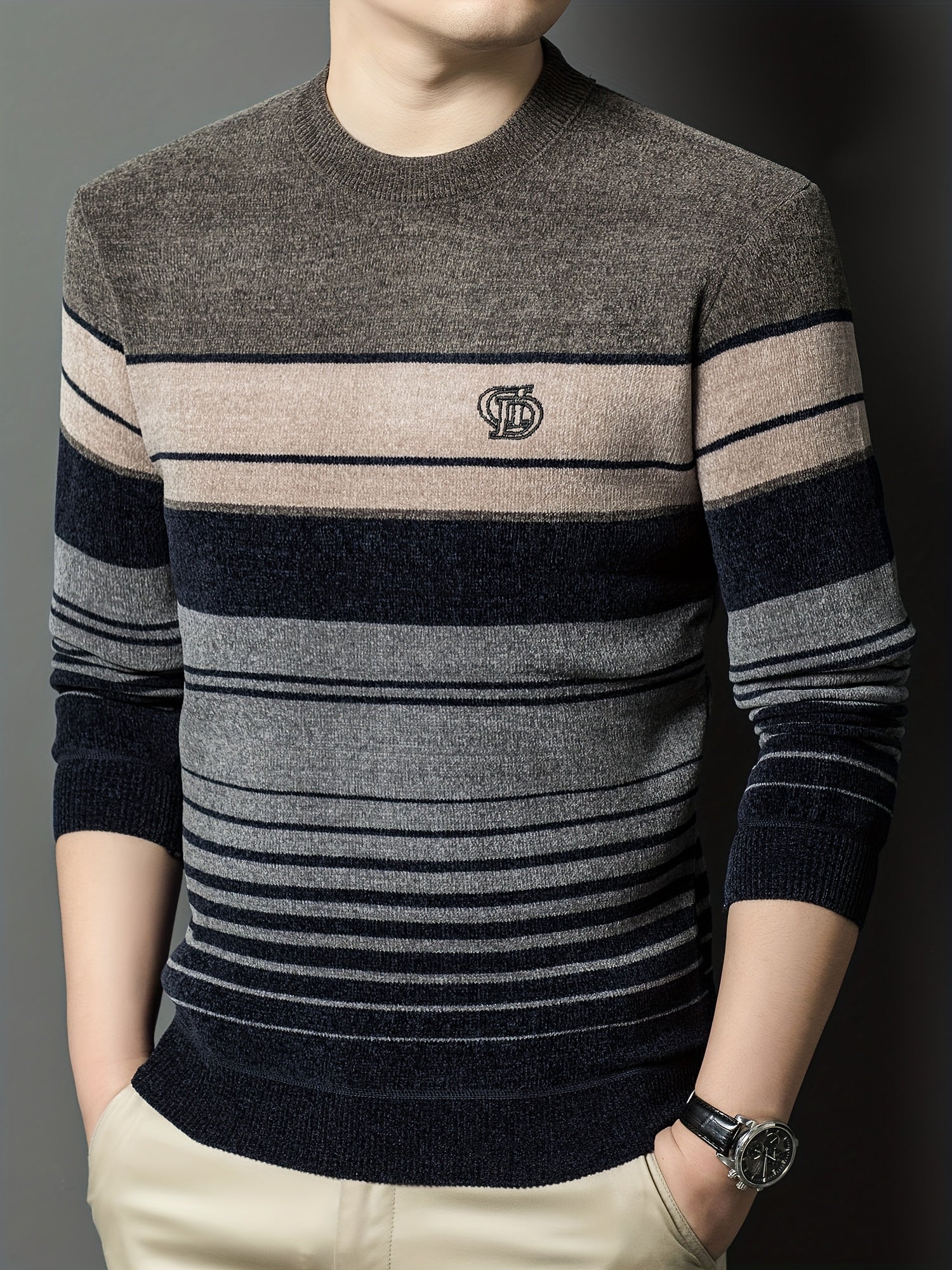 Men's Winter Thermal Fleece-Lined Striped Sweater - Thickened Warm Pullover with Embroidered Logo, Casual Round Neck Long Sleeve Knit Top, Machine Washable (Black/Brown/Beige), Cold Weather Apparel, Ribbed Texture, Comfortabl