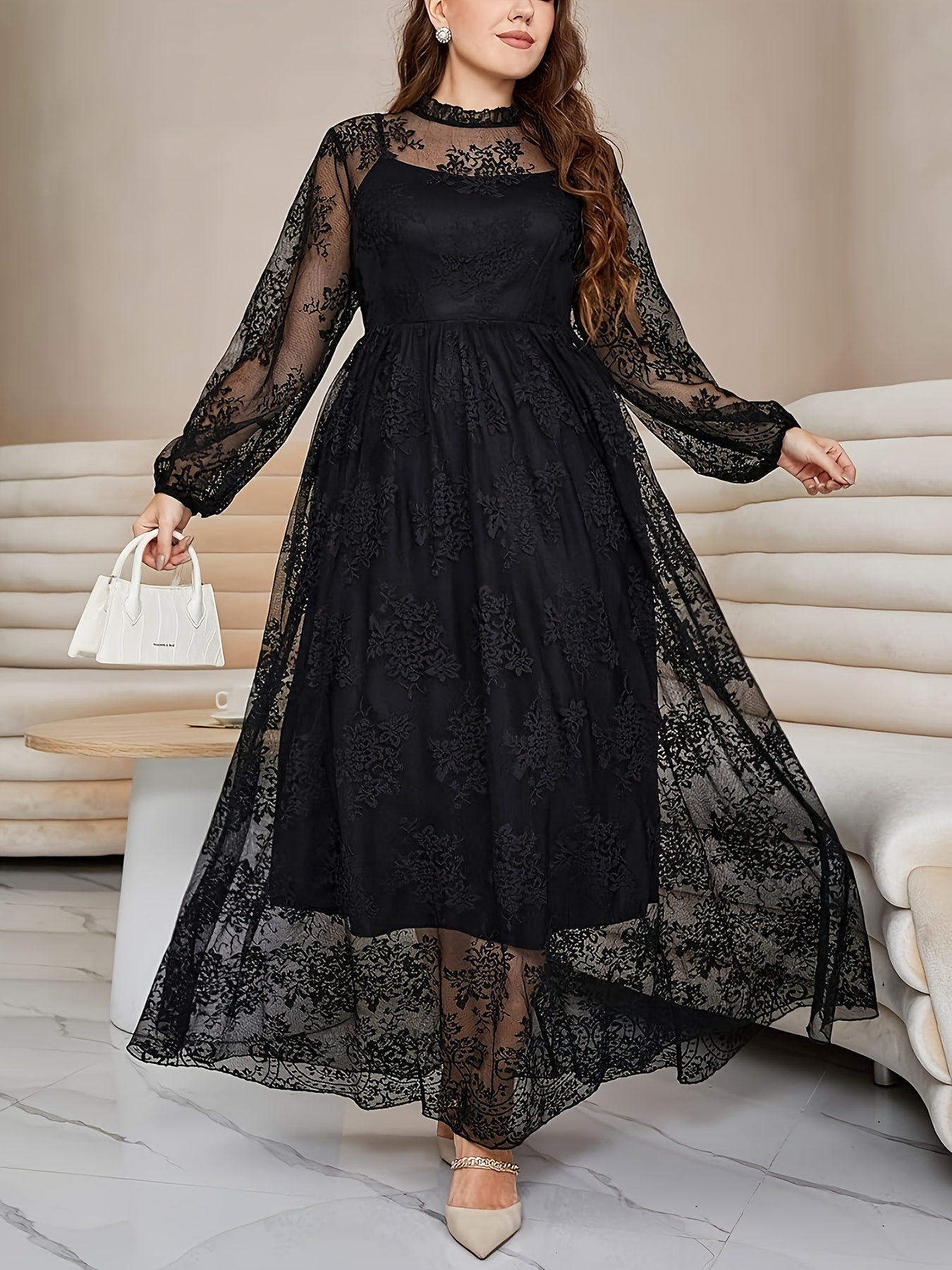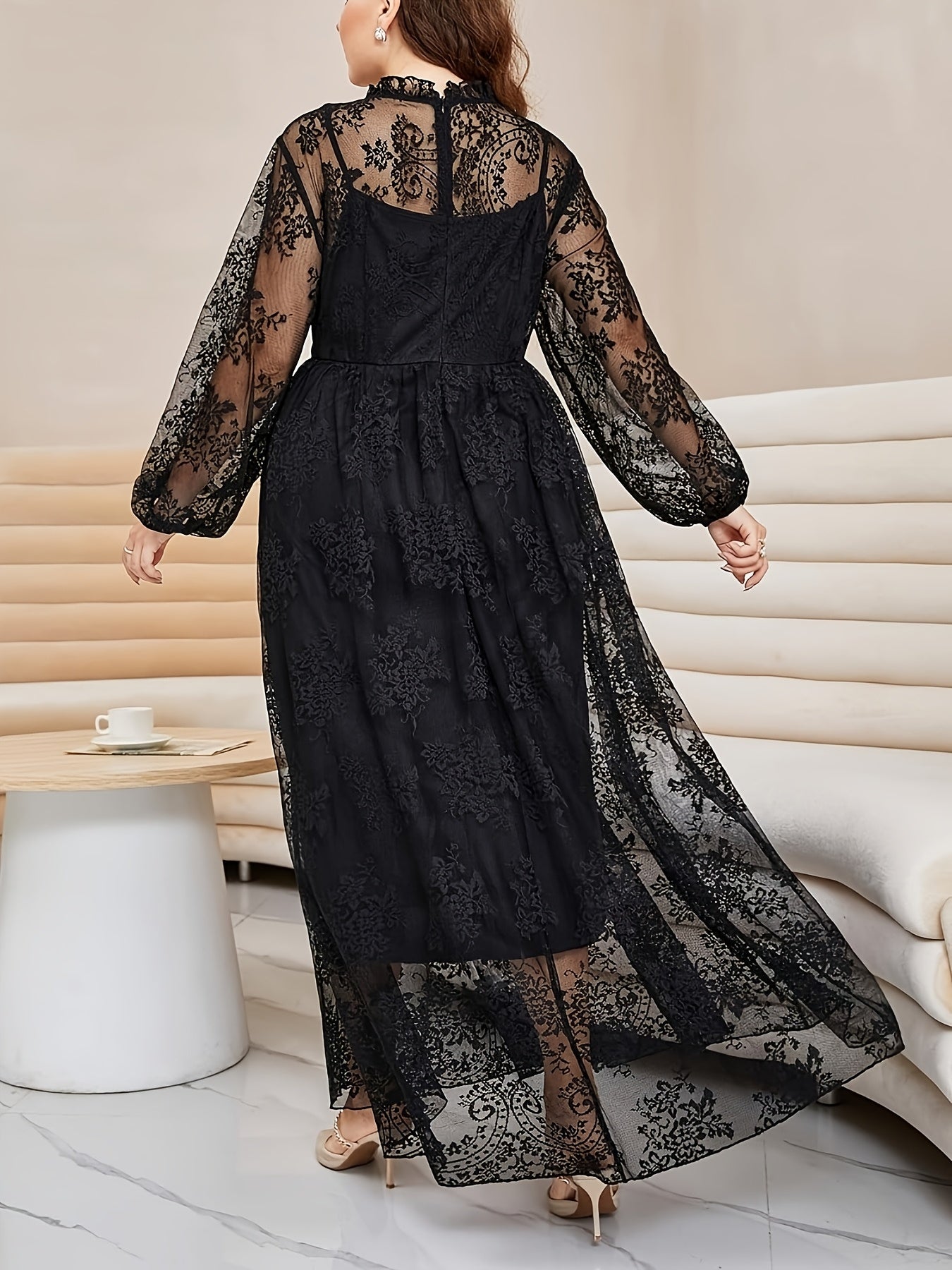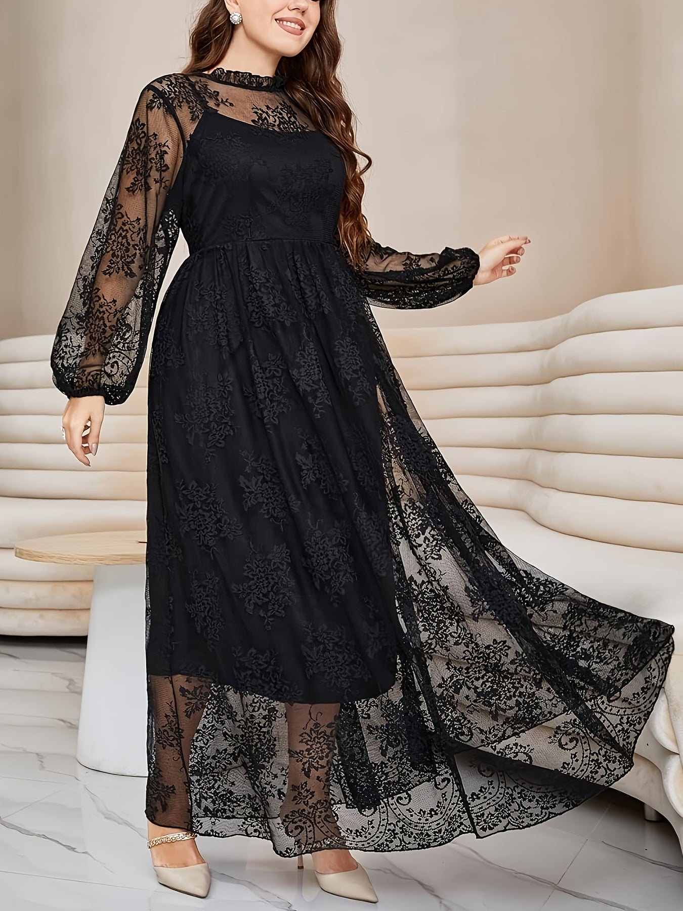 Robe Longue Grande Taille Élégante – Col Montant, Manches Lanternes, Bordure Dentelle, Coupe A-Ligne, Idéale Soirées, Mariages et Galas