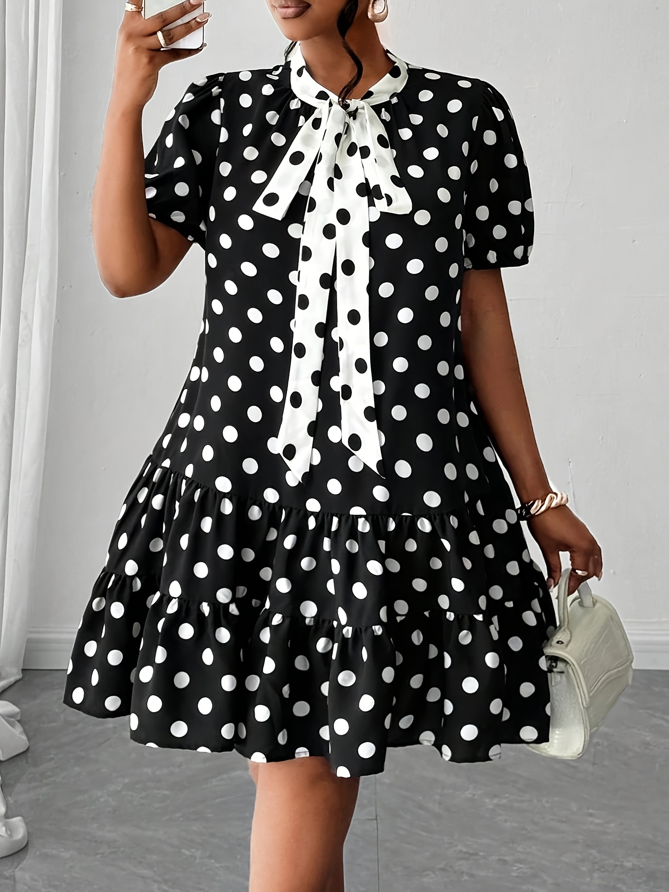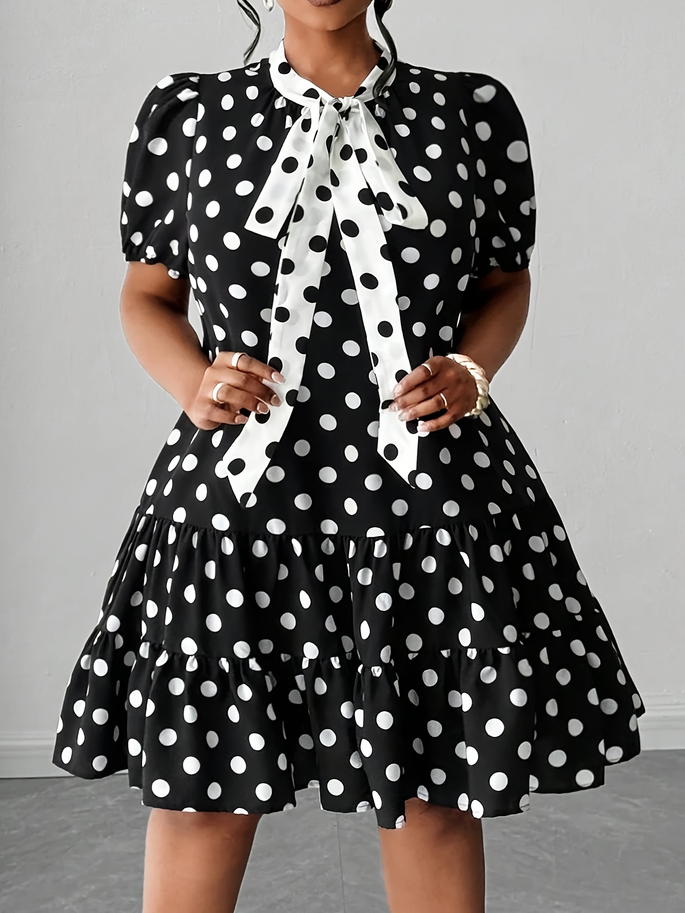 Robe A-Ligne Grande Taille – Pois Noir et Blanc, Jupe Évasée, Taille Ceinturée, Tissu Non Extensible, Idéale Bureau, Soirées et Mariages