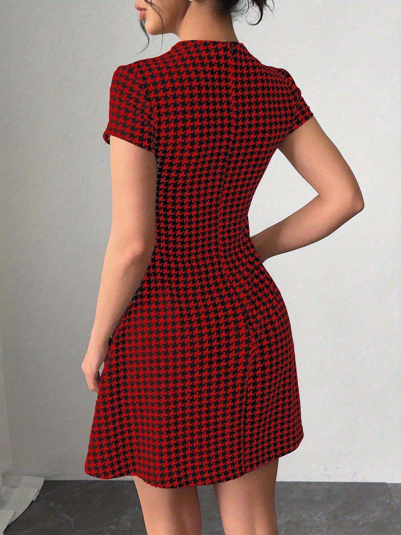 Robe A-Line à Imprimé Pied-de-Poule — Manches Courtes, Coupe Slim avec Taille Cintrée, Longueur Courte, Fermeture Éclair au Dos, Mini-Robe Noir et Blanc, Idéale pour Automne/Hiver, Événements Décontractés ou Formels (Bureau, Soirée, Rendez-vous)