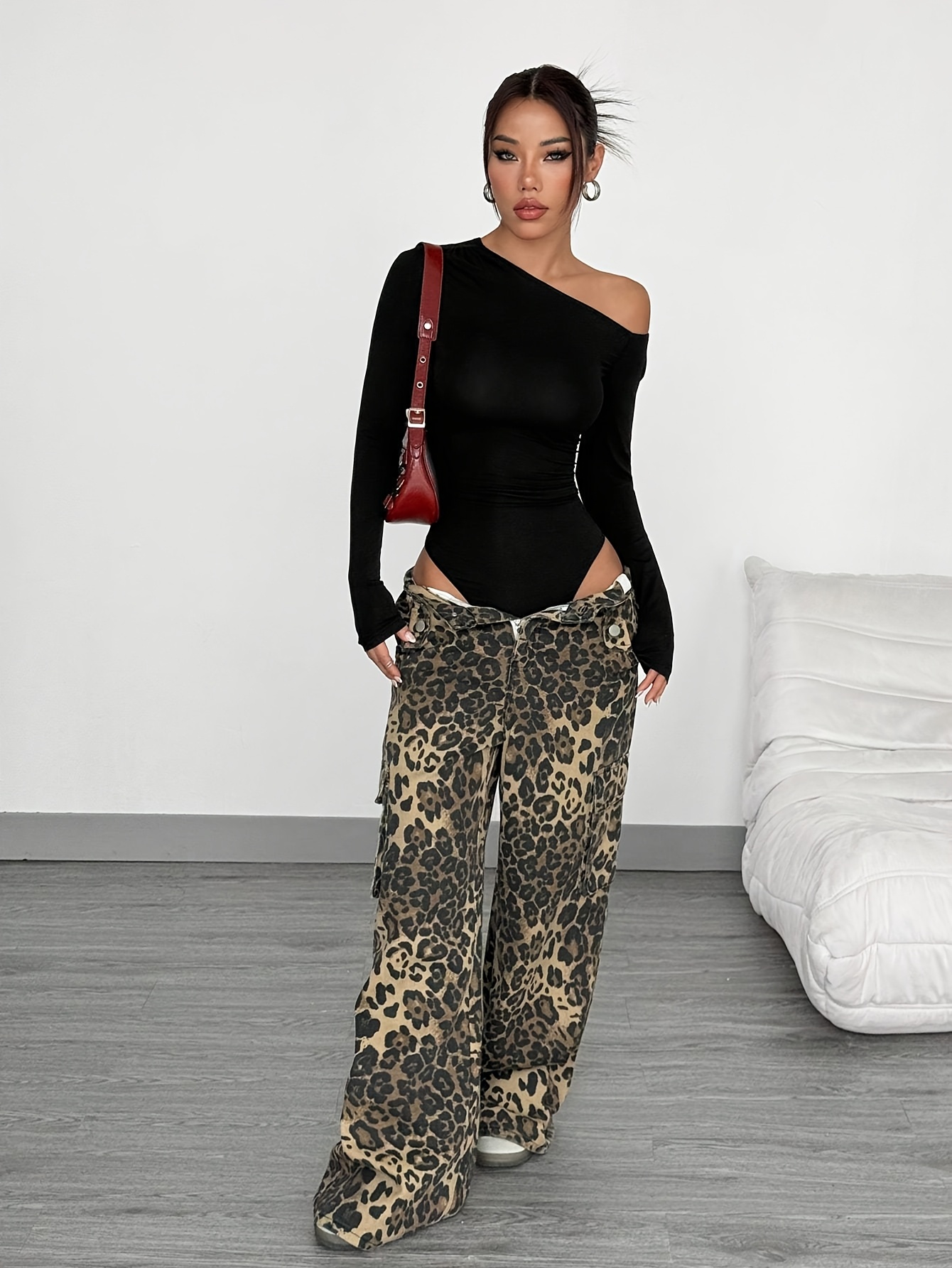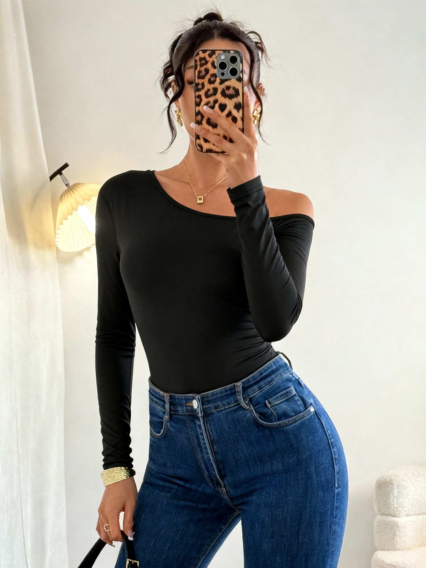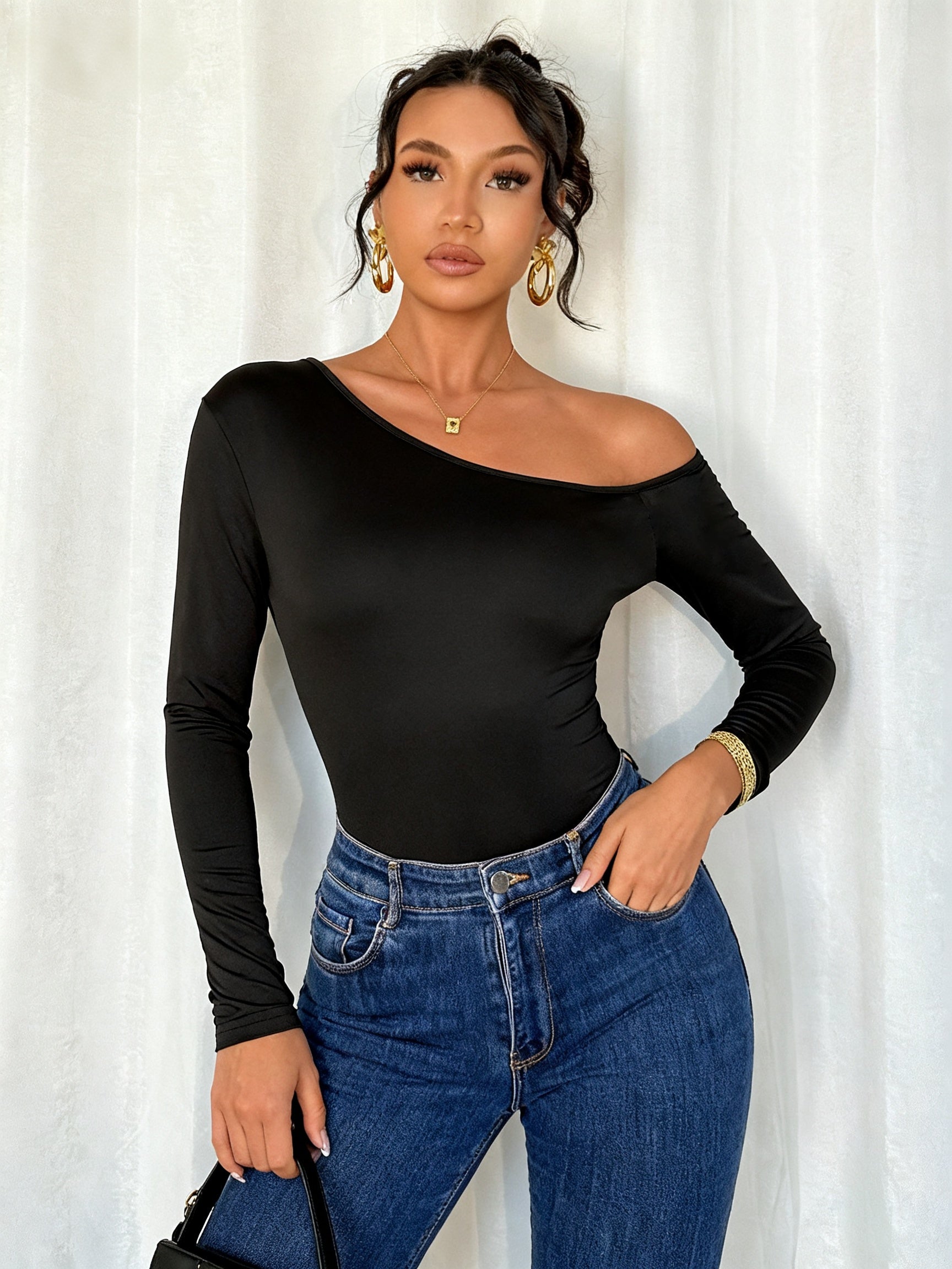 Body femme à manche longue, couleur unie, épaules dénudées, style simple et décontracté, coupe confortable et respirante, idéal pour un look quotidien d’automne