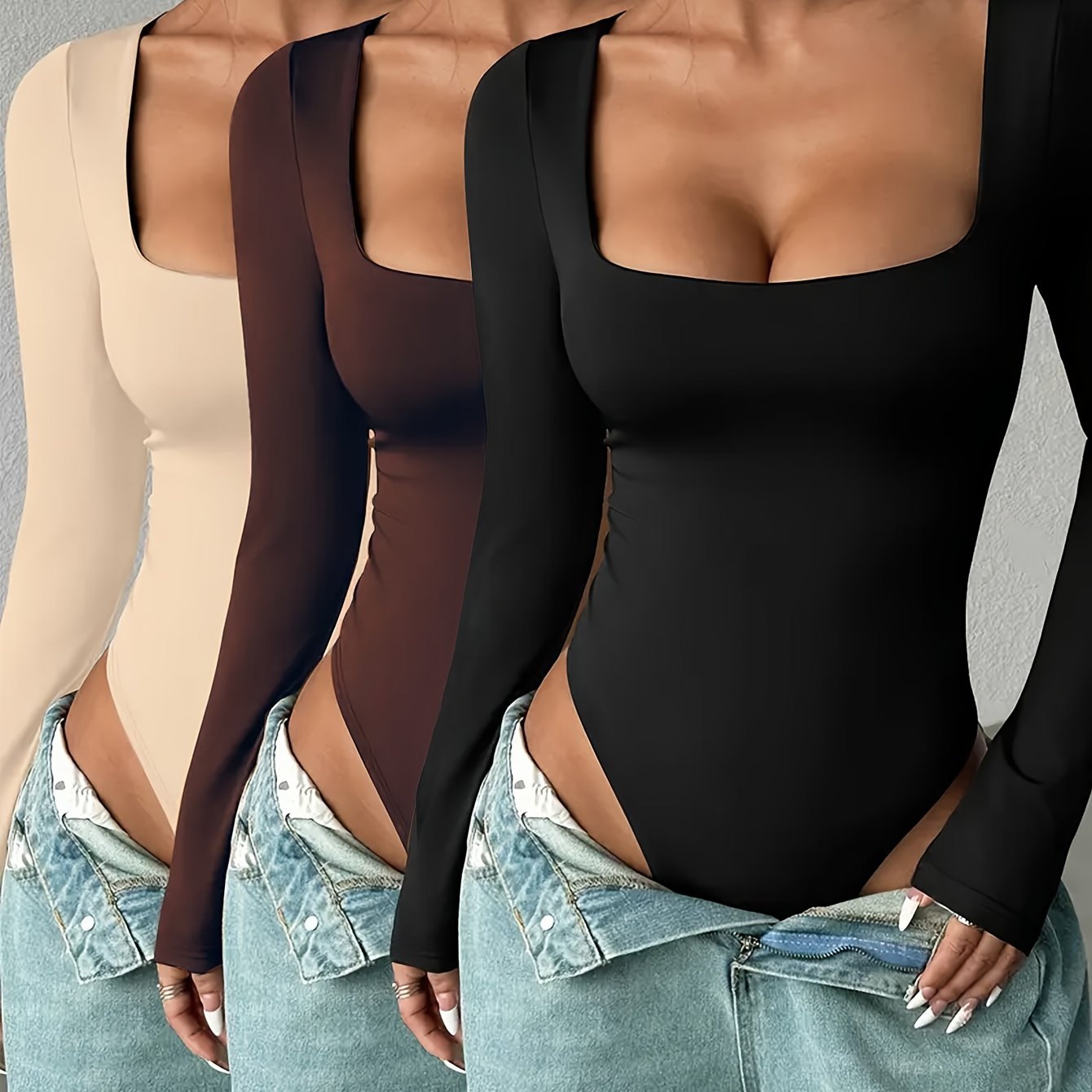 Lot de 3 bodys sexy femme à manches longues, col carré, fermeture intégrale à glissière, variations de col rond (beige, noir, marron, blanc), lavables en machine, maintien moyen, confort et chaleur pour l’hiver, tenues élégantes toutes saisons