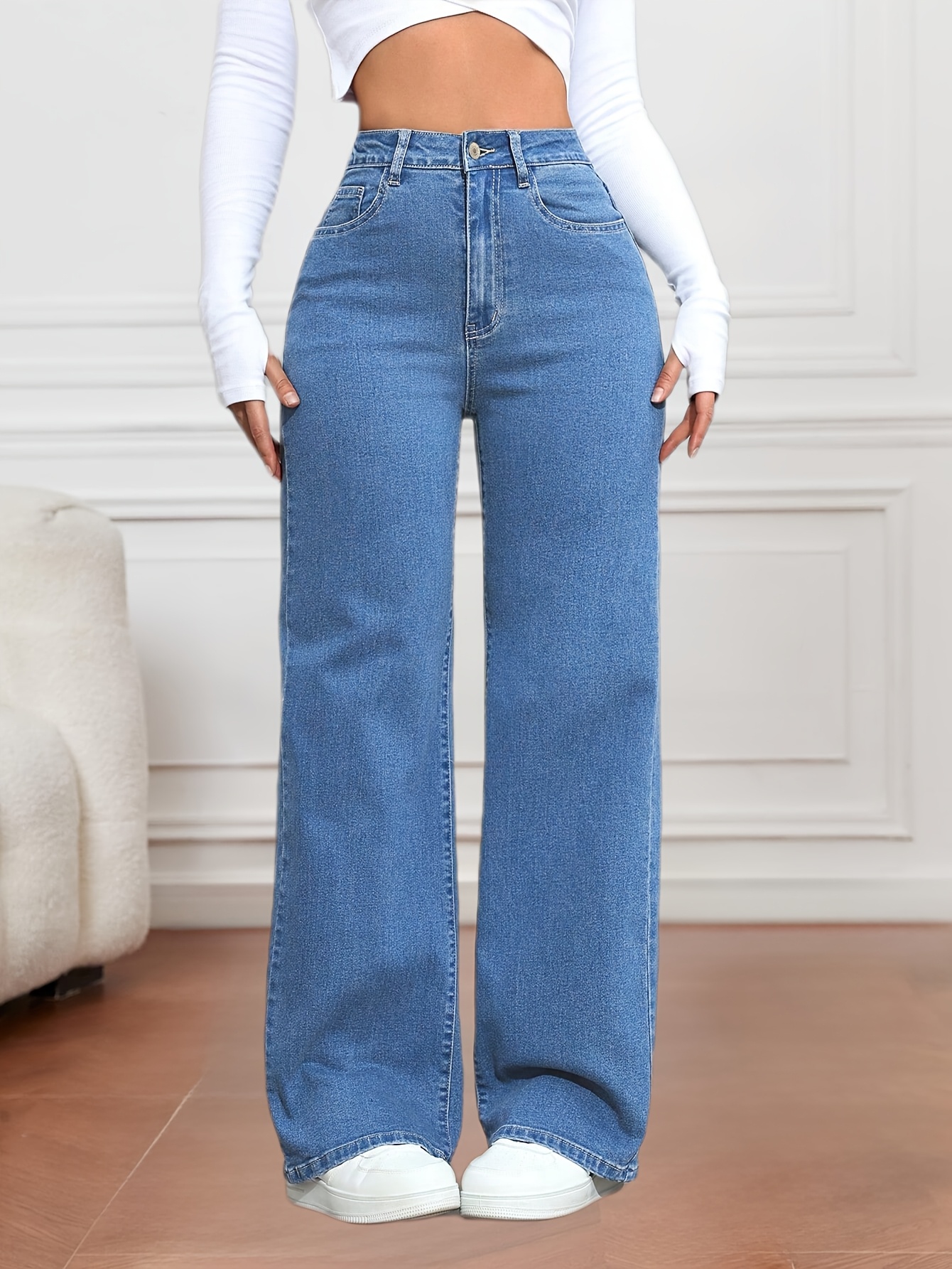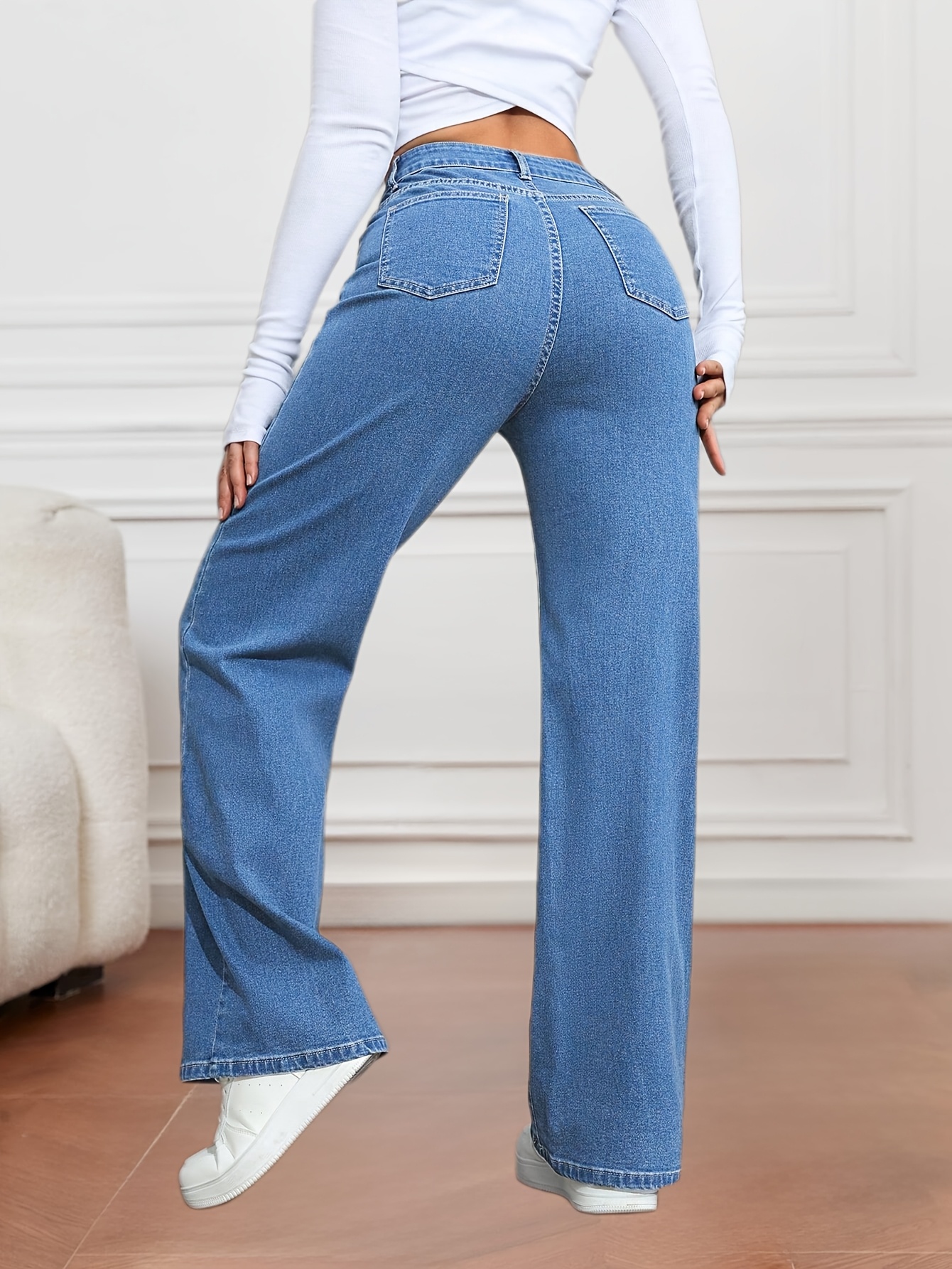Jeans femme bleu à jambes larges – décontracté, denim extensible, fermeture à boutons, confort toutes saisons, tenue décontractée | jeans larges | tissu tissé