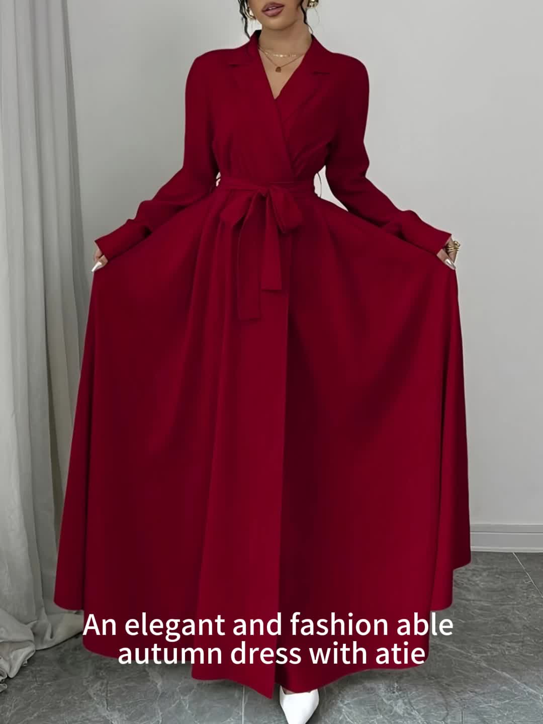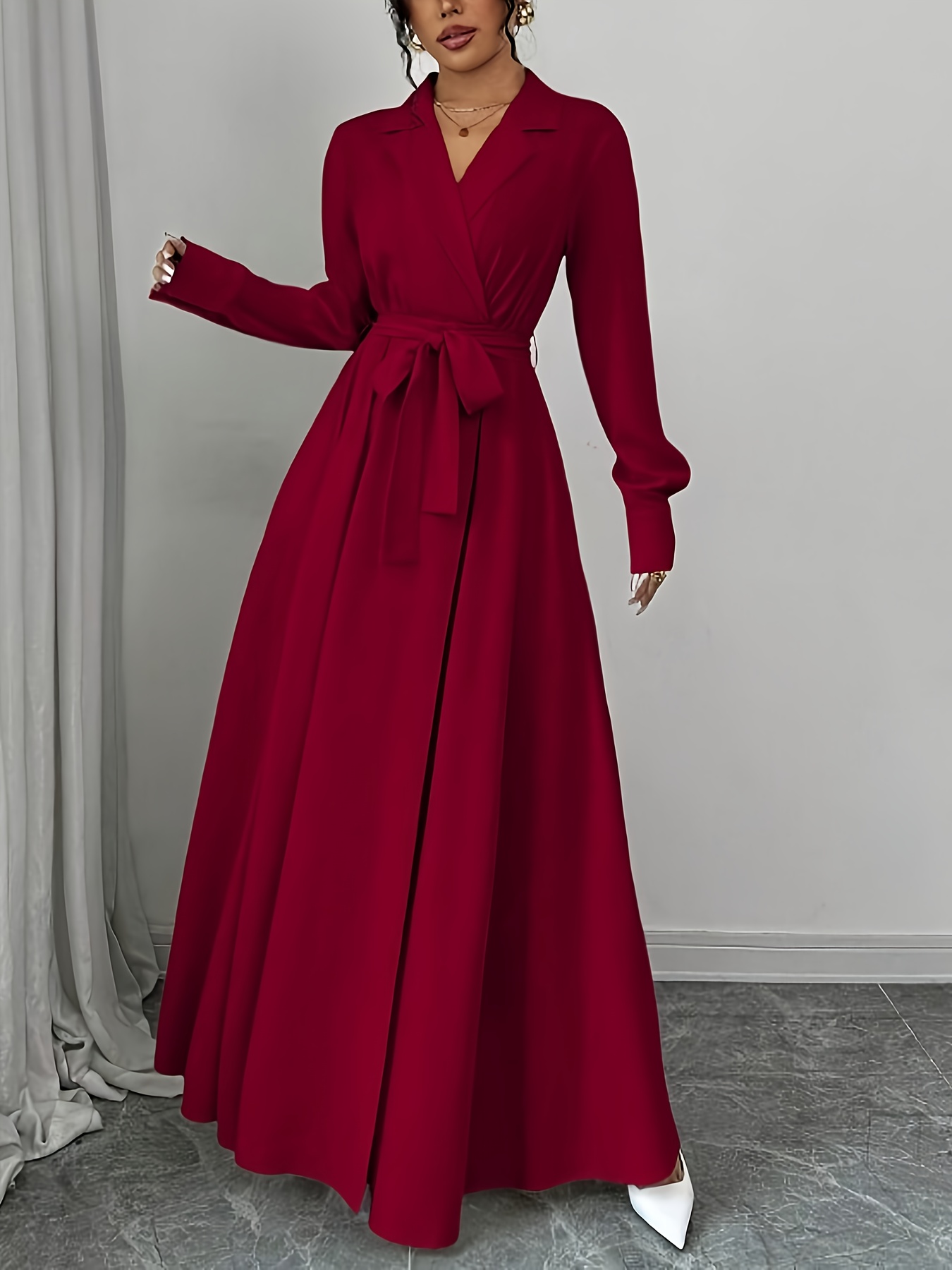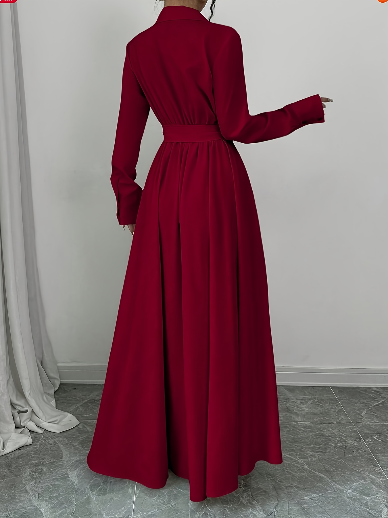 Women's Elegant A-Line Maxi Dress with Collar & Lace-Up Waist - Solid Color Formal Wedding Party Dress, Long Sleeve Flowing Flared, Machine Washable (Elegant Special Line Collection)