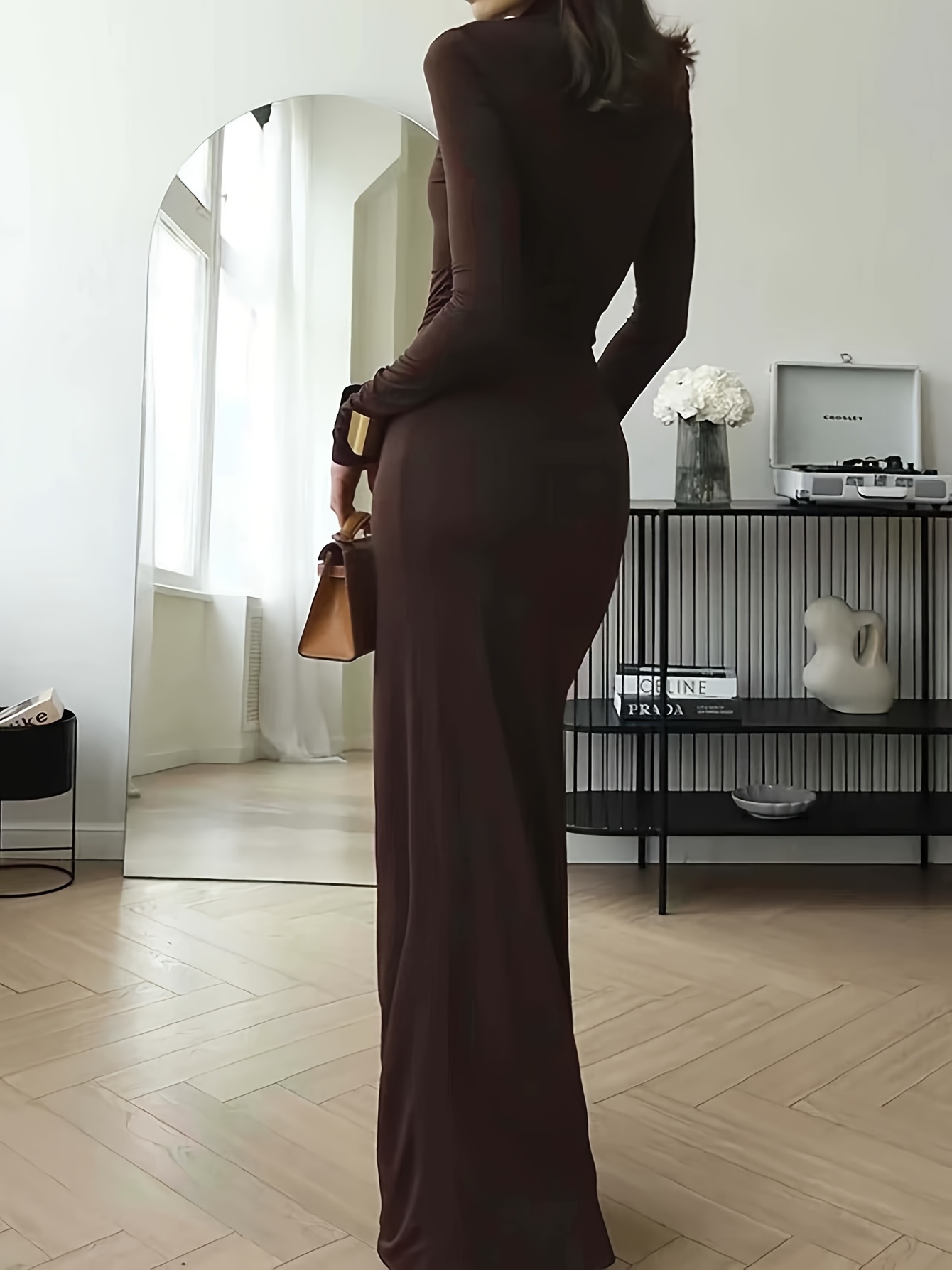 Robe Femme Élégante Col Haut Manches Longues Bodycon — Ourlet Asymétrique avec Fente, Couleur Unie (Marron/Bleu Marine), Silhouette H-Line Structurée, Confortable, Parfaite pour Soirées