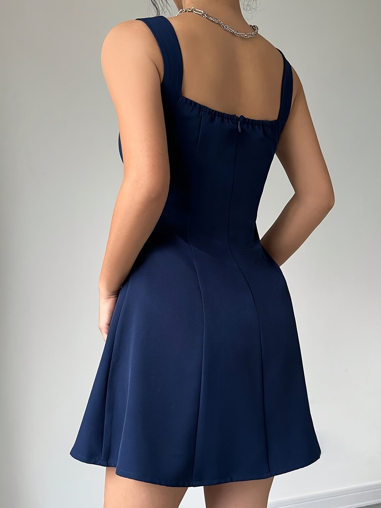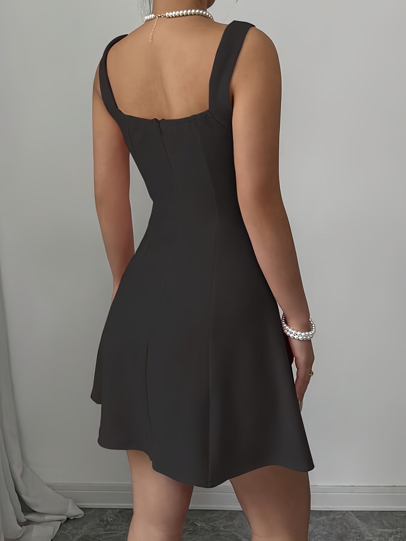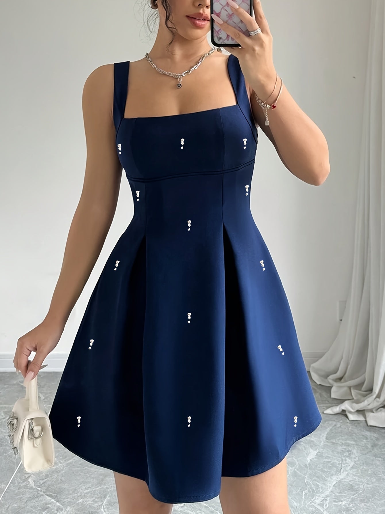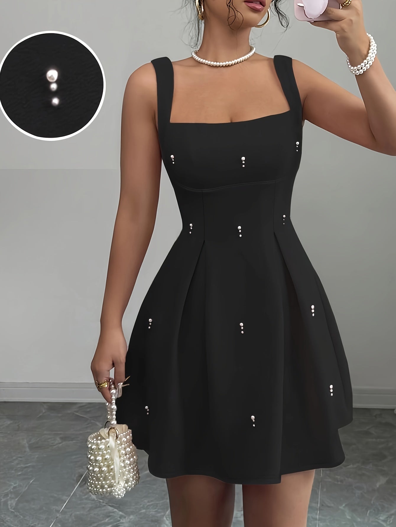 Sublimez votre style avec cette robe courte Fit & Flare à col carré et détails perles :
