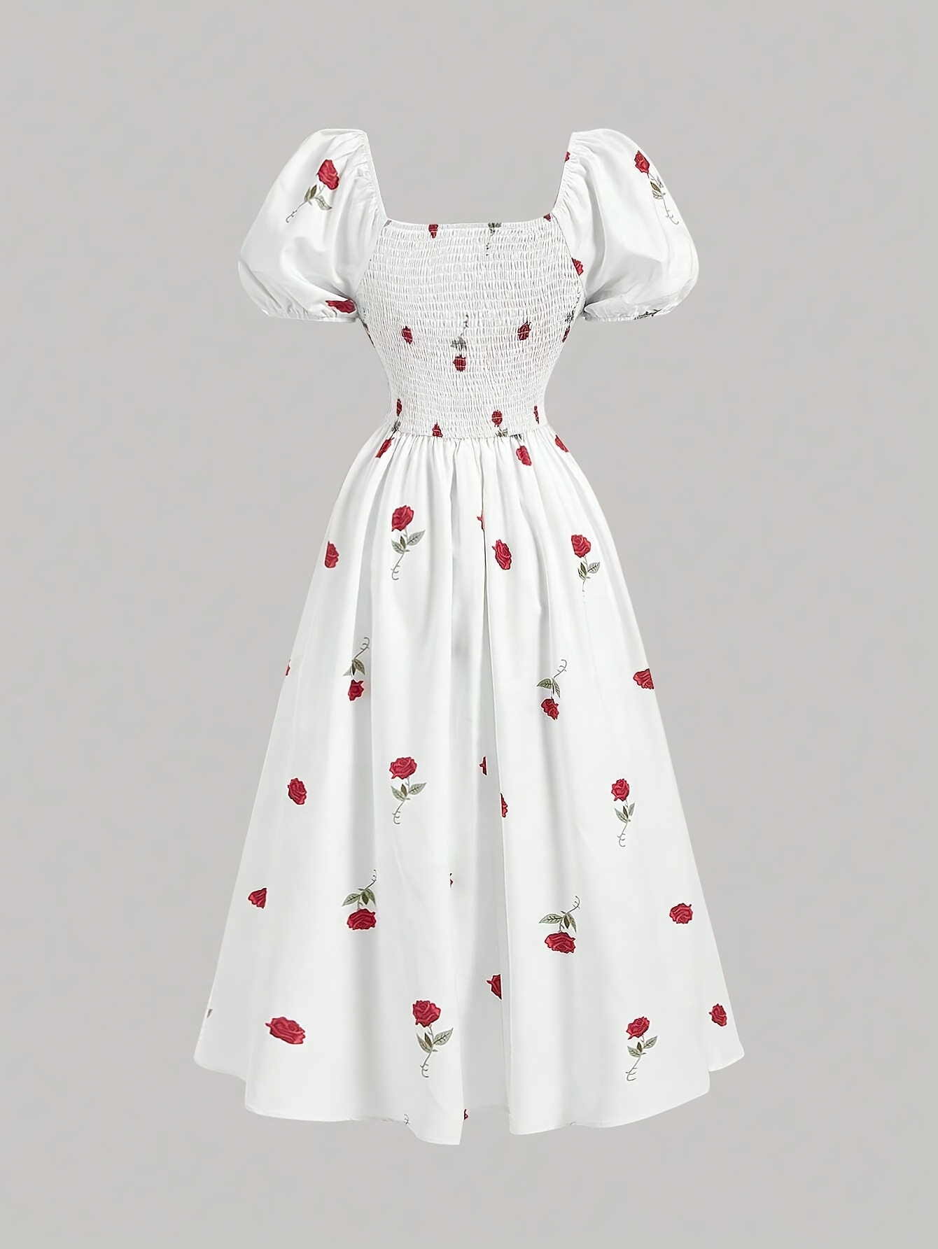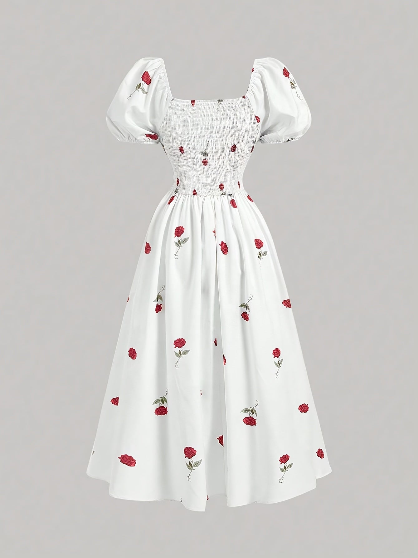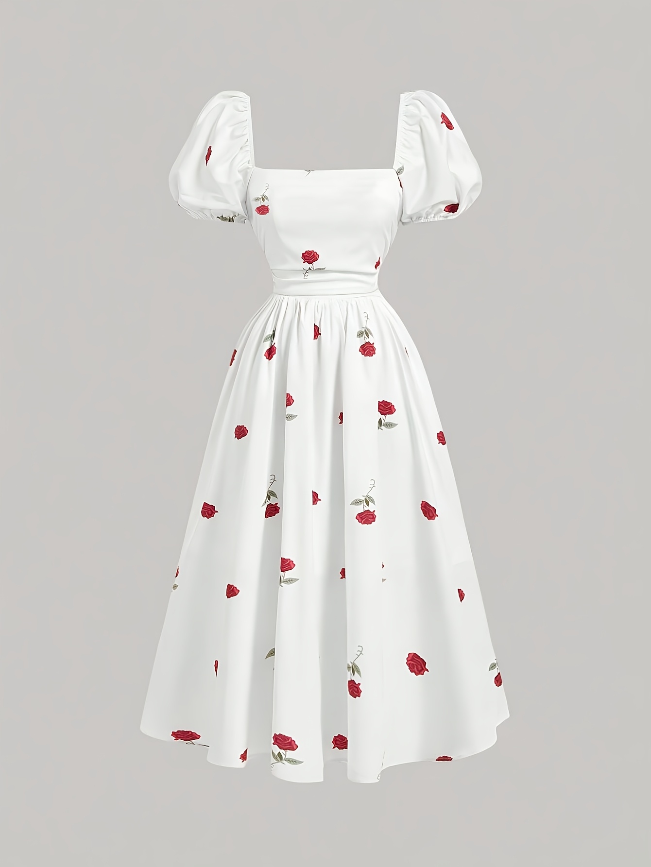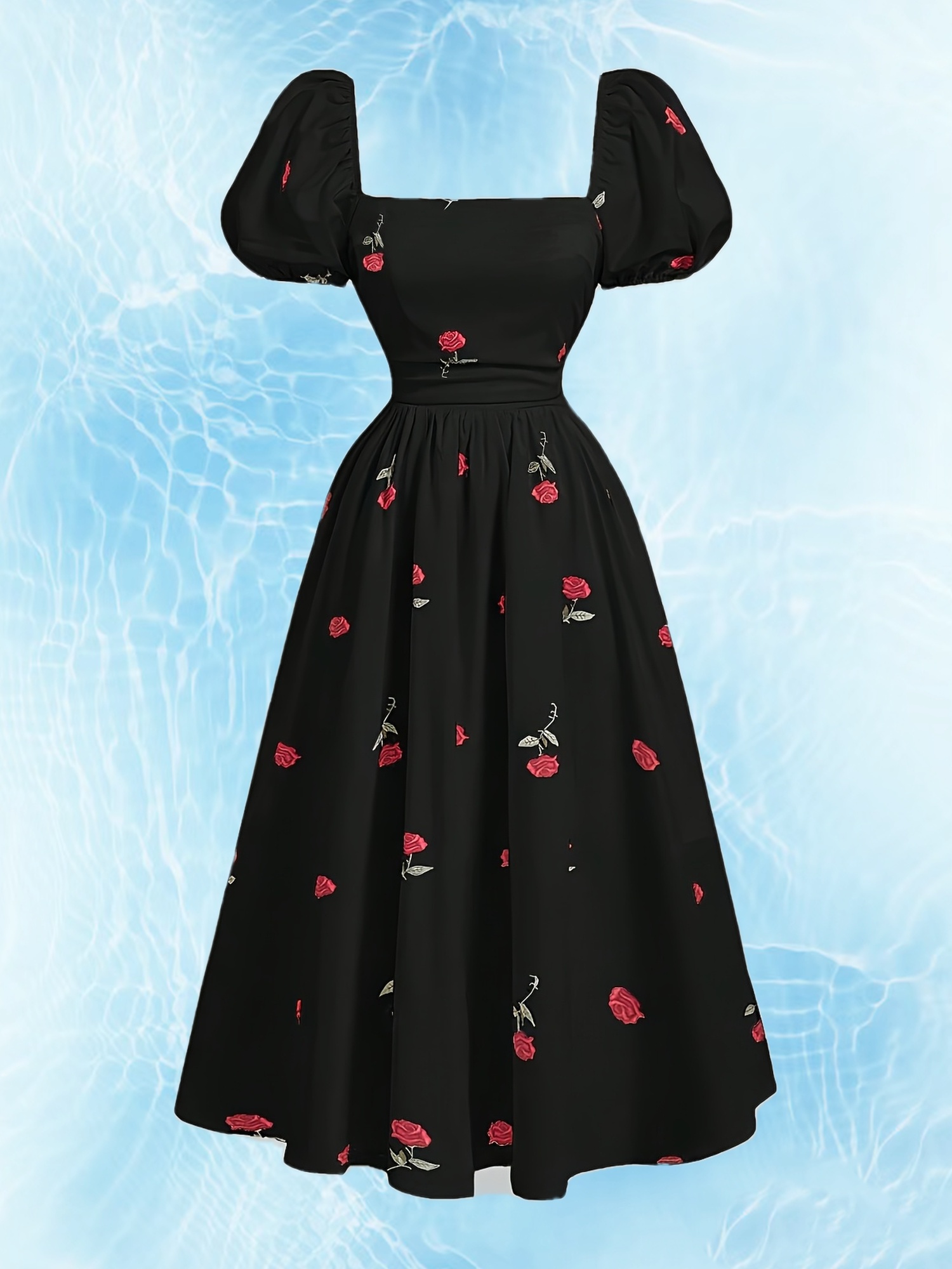 Robe élégante pour femmes à col carré – Imprimé floral, manches courtes, coupe ajustée en A, roses rouges et feuilles vertes, légère et lavable en machine, printemps/été/automne, casual à semi-formel