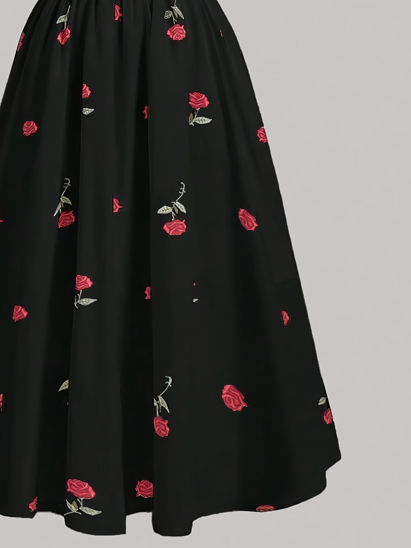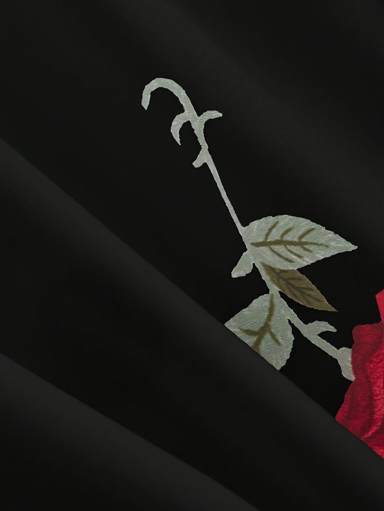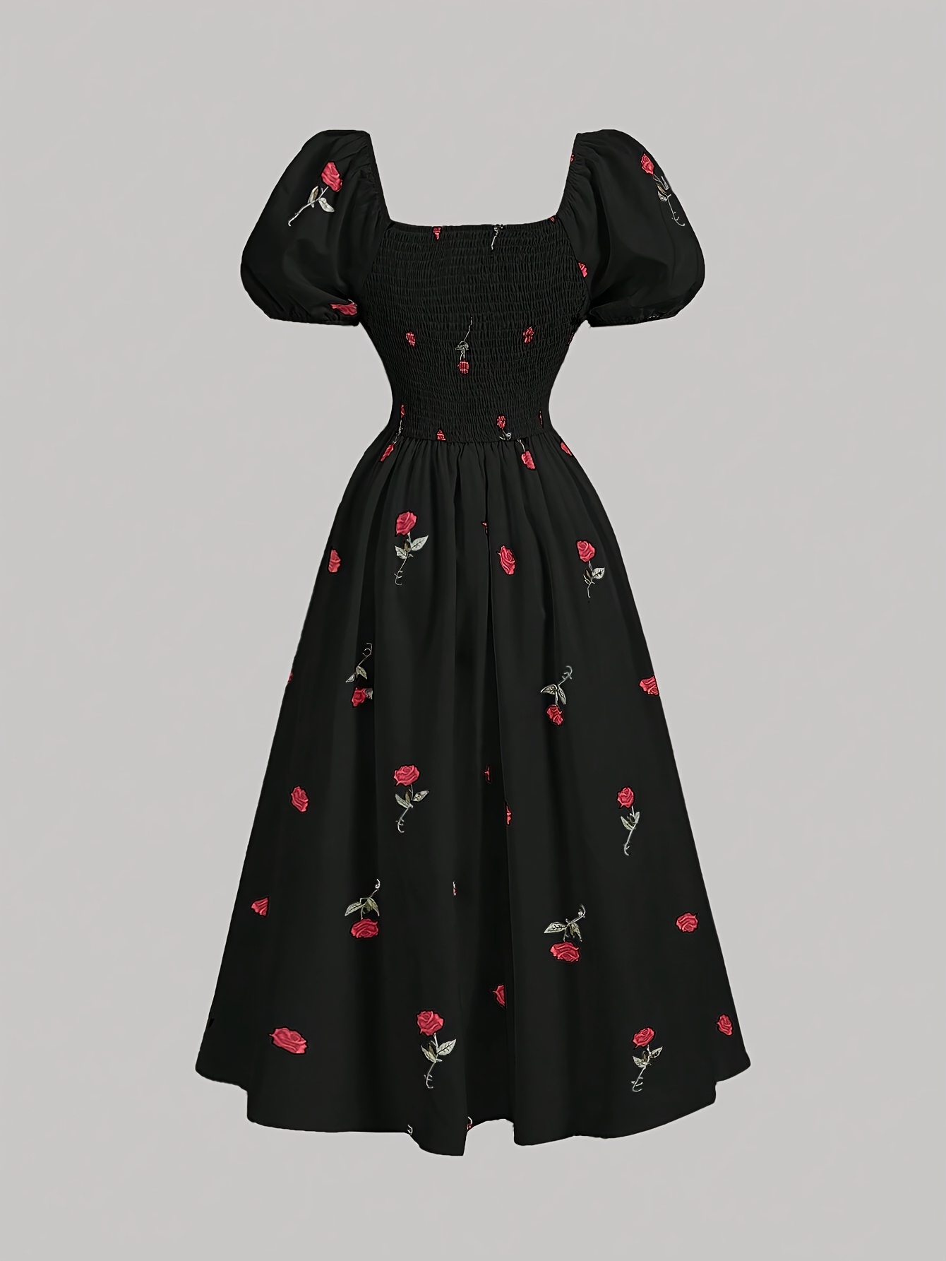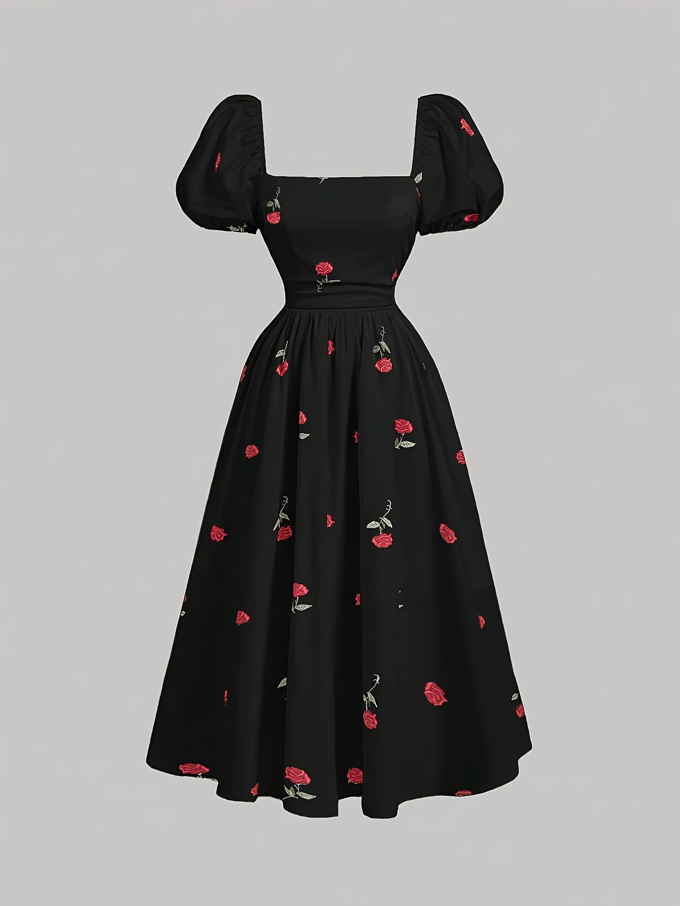 Robe élégante pour femmes à col carré – Imprimé floral, manches courtes, coupe ajustée en A, roses rouges et feuilles vertes, légère et lavable en machine, printemps/été/automne, casual à semi-formel
