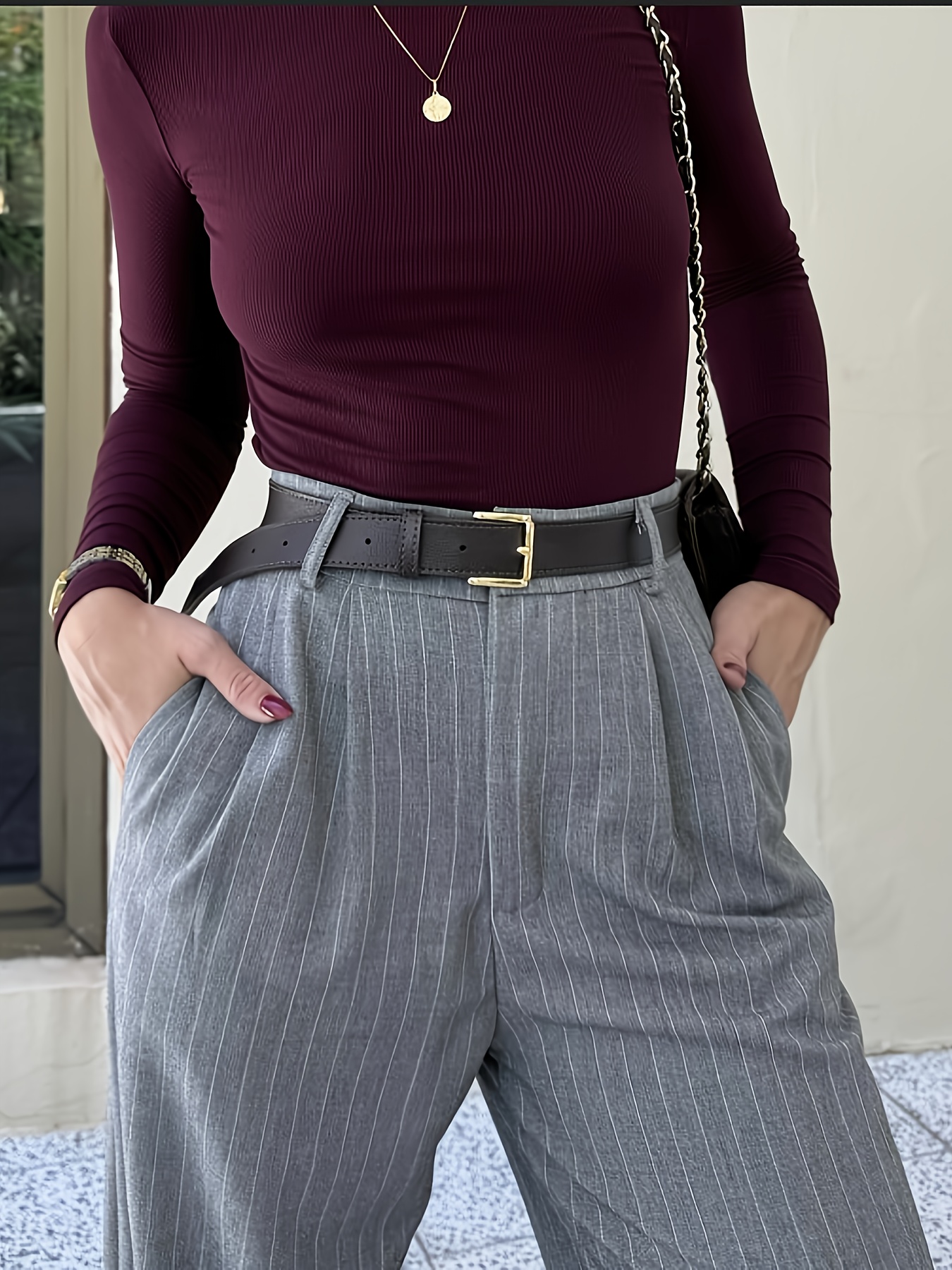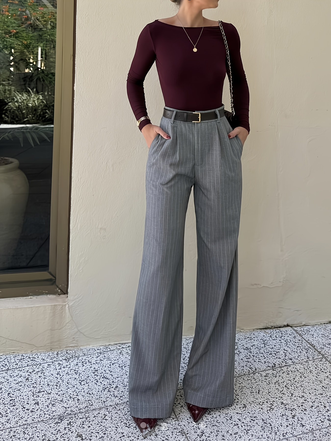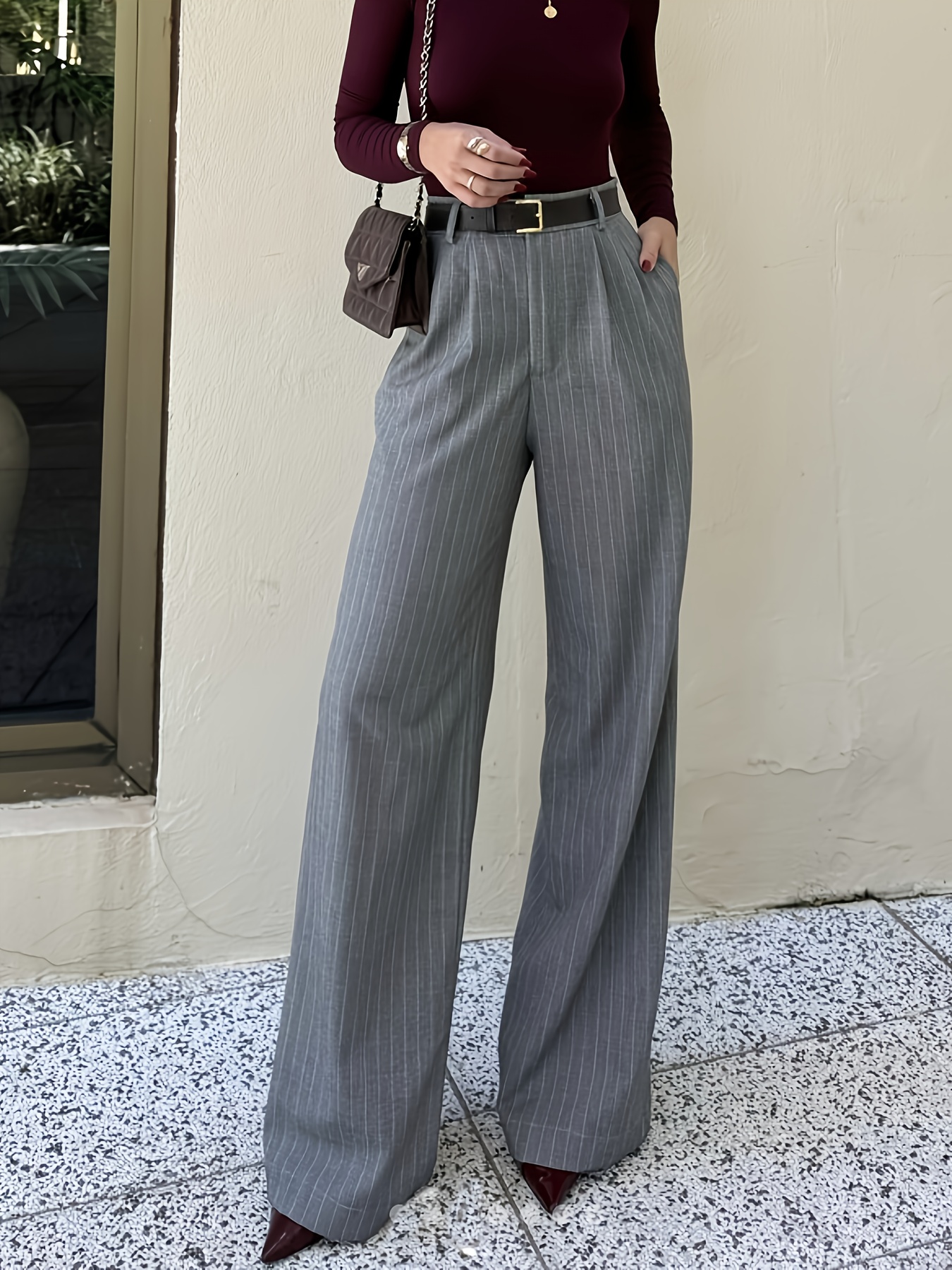 Pantalon Femme Élégant Jambe Large – Rayé, Taille Haute, Fermeture Bouton, Bureau et Décontracté, Sans Ceinture, Tous Saisons