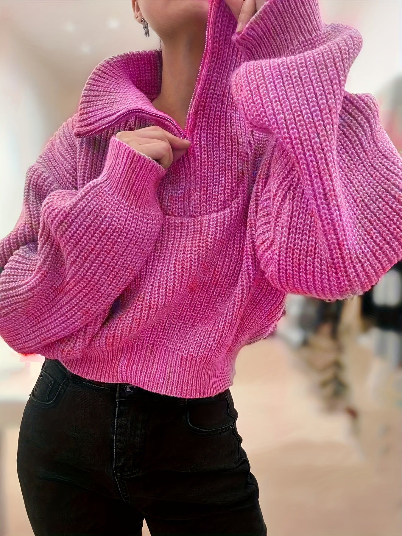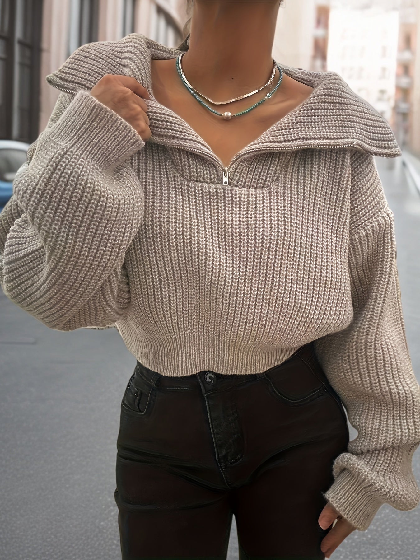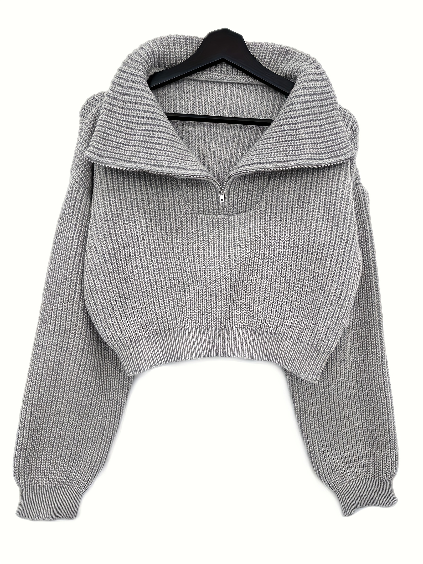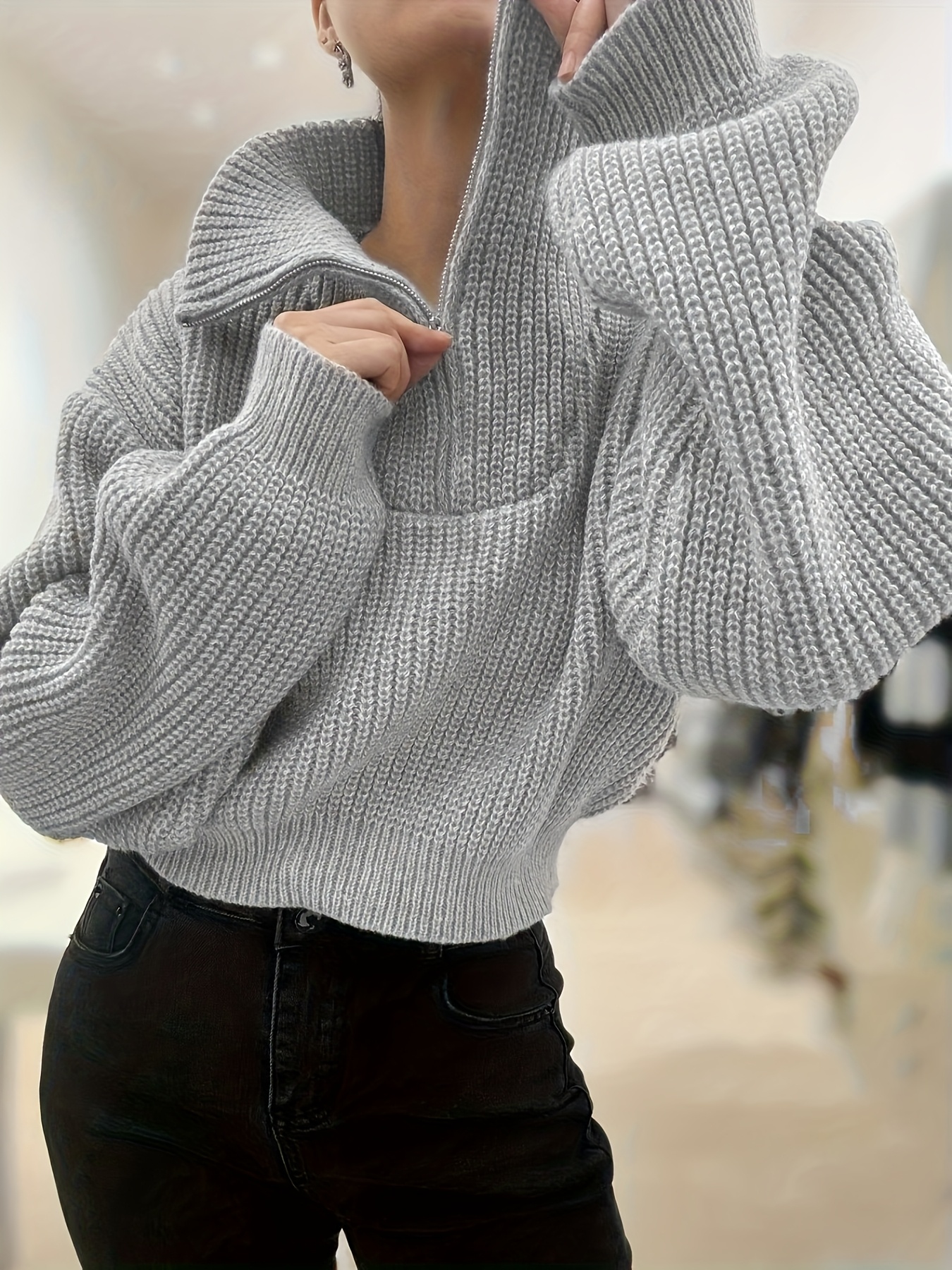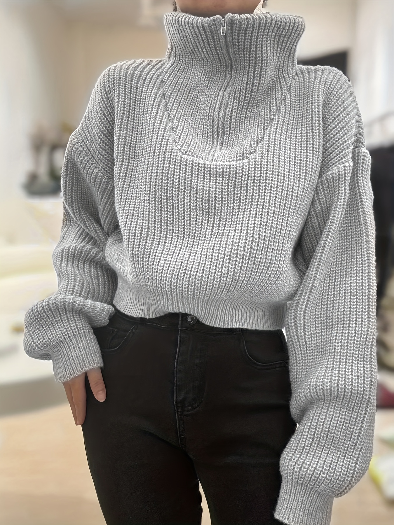 Pull court femme automne-hiver à demi-zip et manches lanterne – Pull côtelé élégant, coupe slim, tissu stretch mi-épais, lavable en machine, style décontracté chic, détail côtelé plié