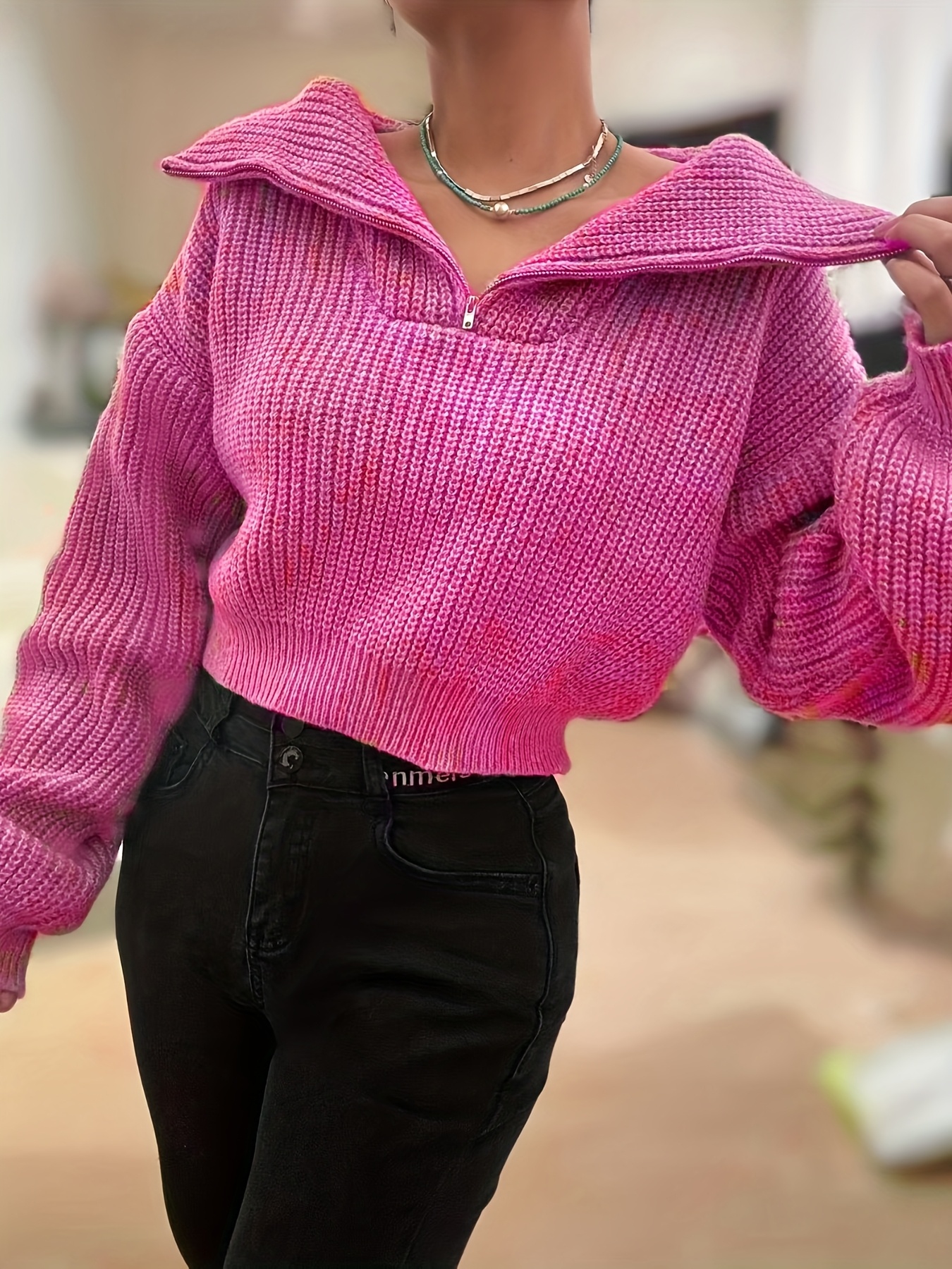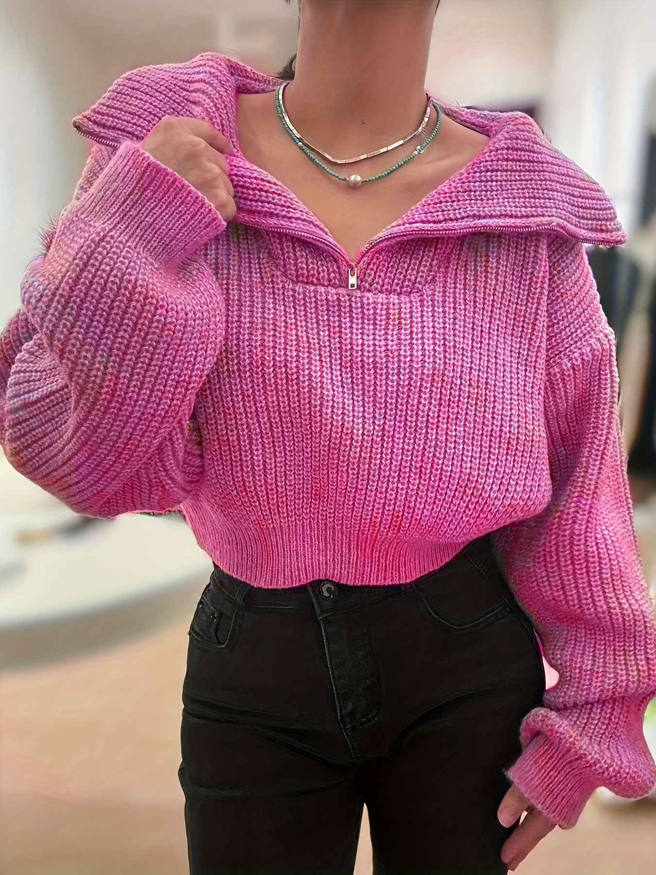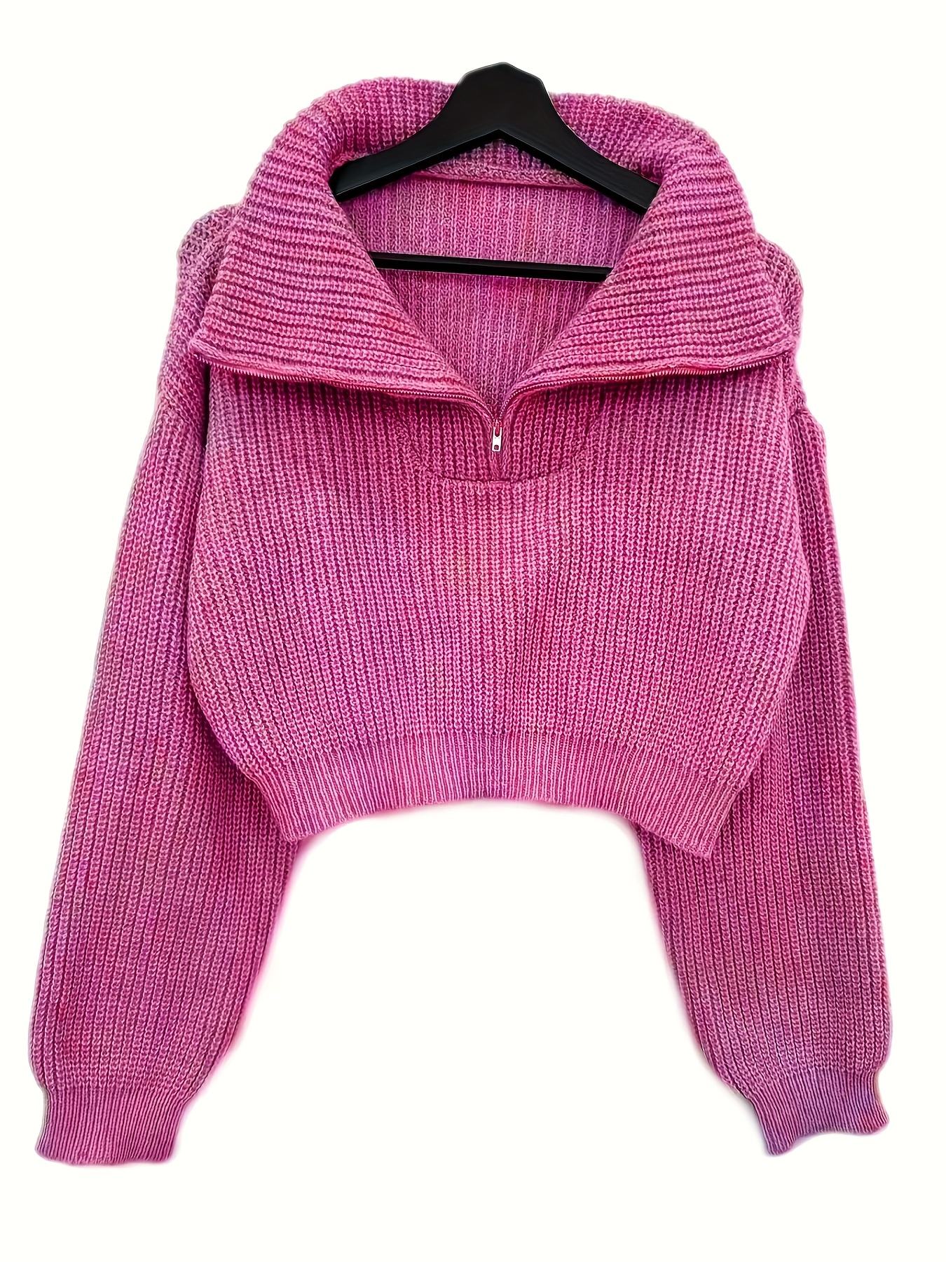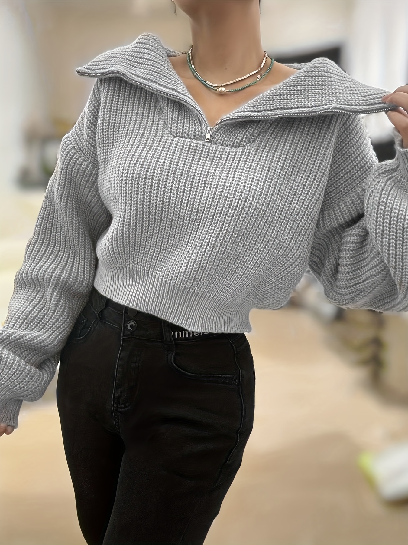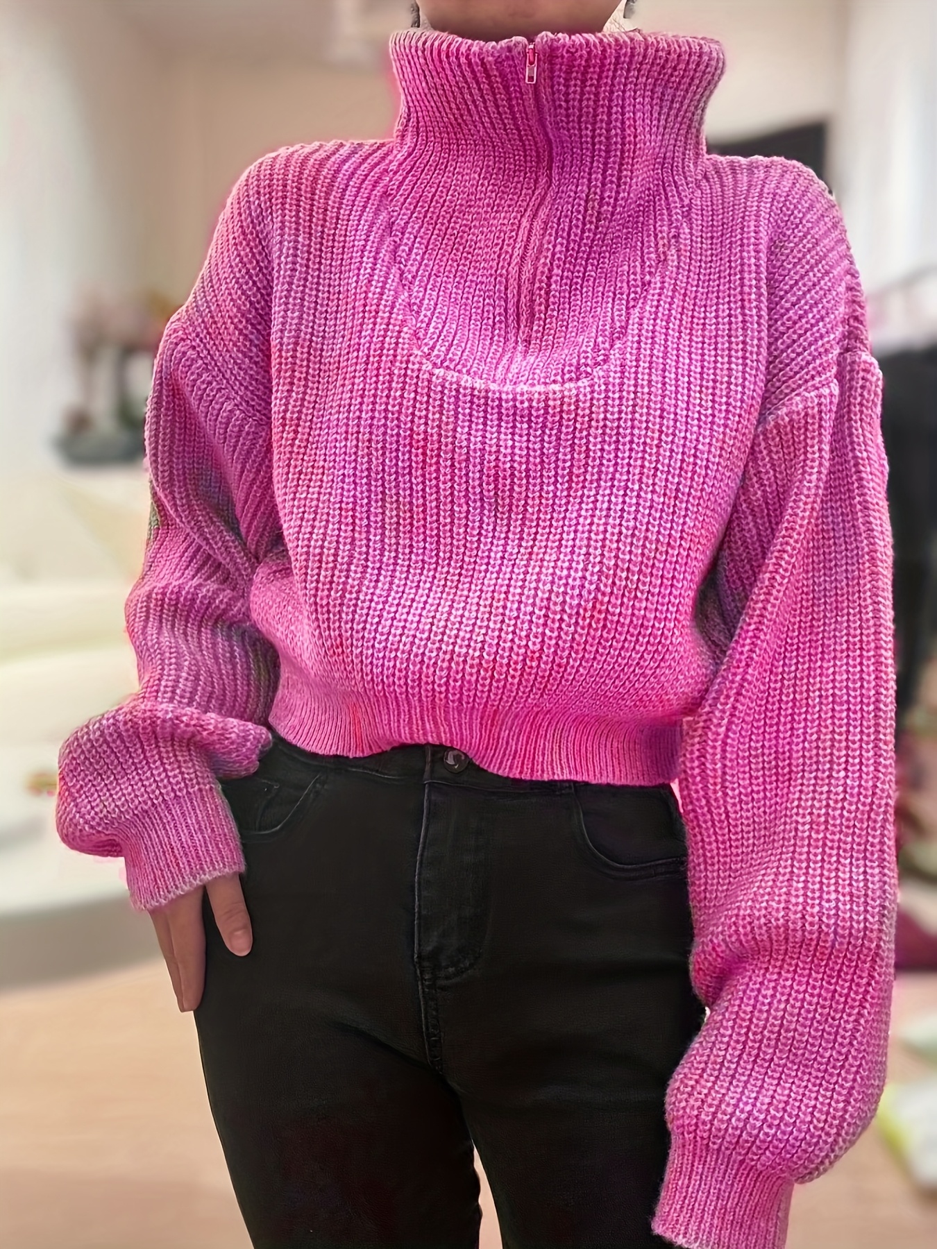 Pull court femme automne-hiver à demi-zip et manches lanterne – Pull côtelé élégant, coupe slim, tissu stretch mi-épais, lavable en machine, style décontracté chic, détail côtelé plié
