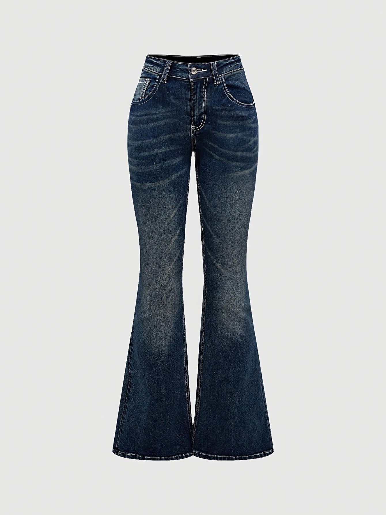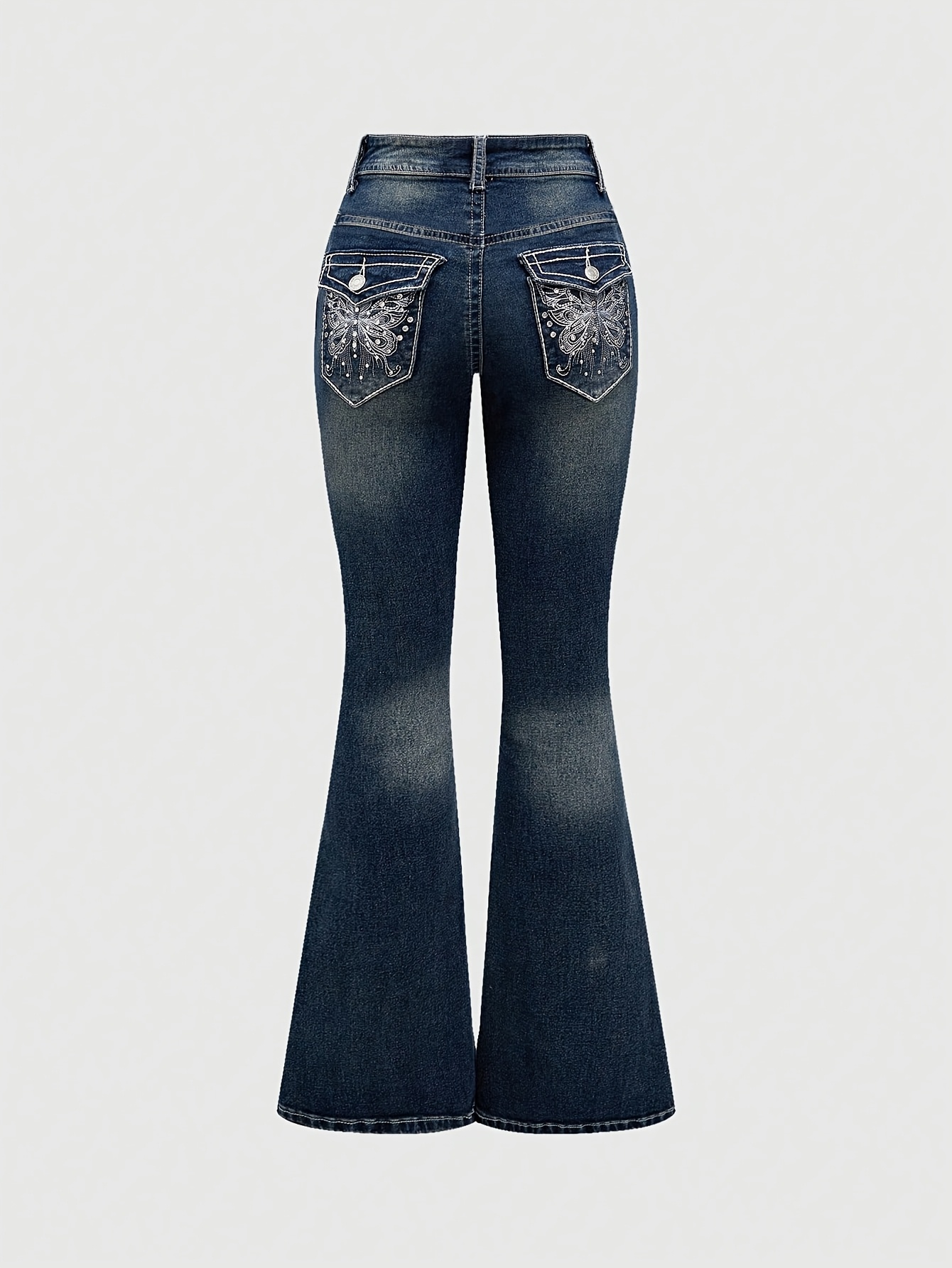 Jeans Femme Évasé Brodé Main Poches Arrière Strass Extensible Toute Saison Élégant Décontracté Lavable Couleur Unie