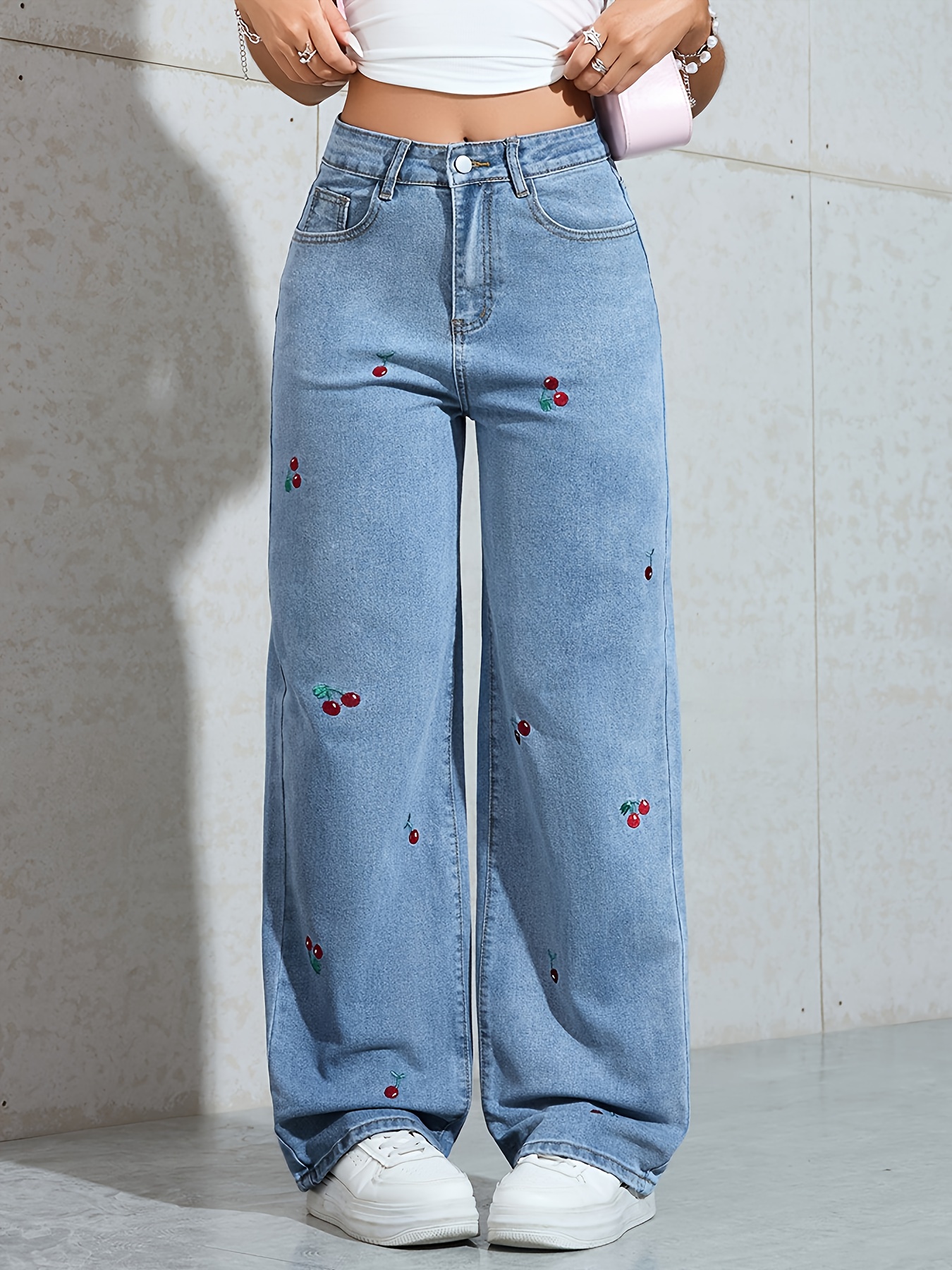 Jeans Femme Jambe Droite Large Faux Denim Broderie Cerise Extensible Effet Usé Confort Toute Saison Décontracté Durable