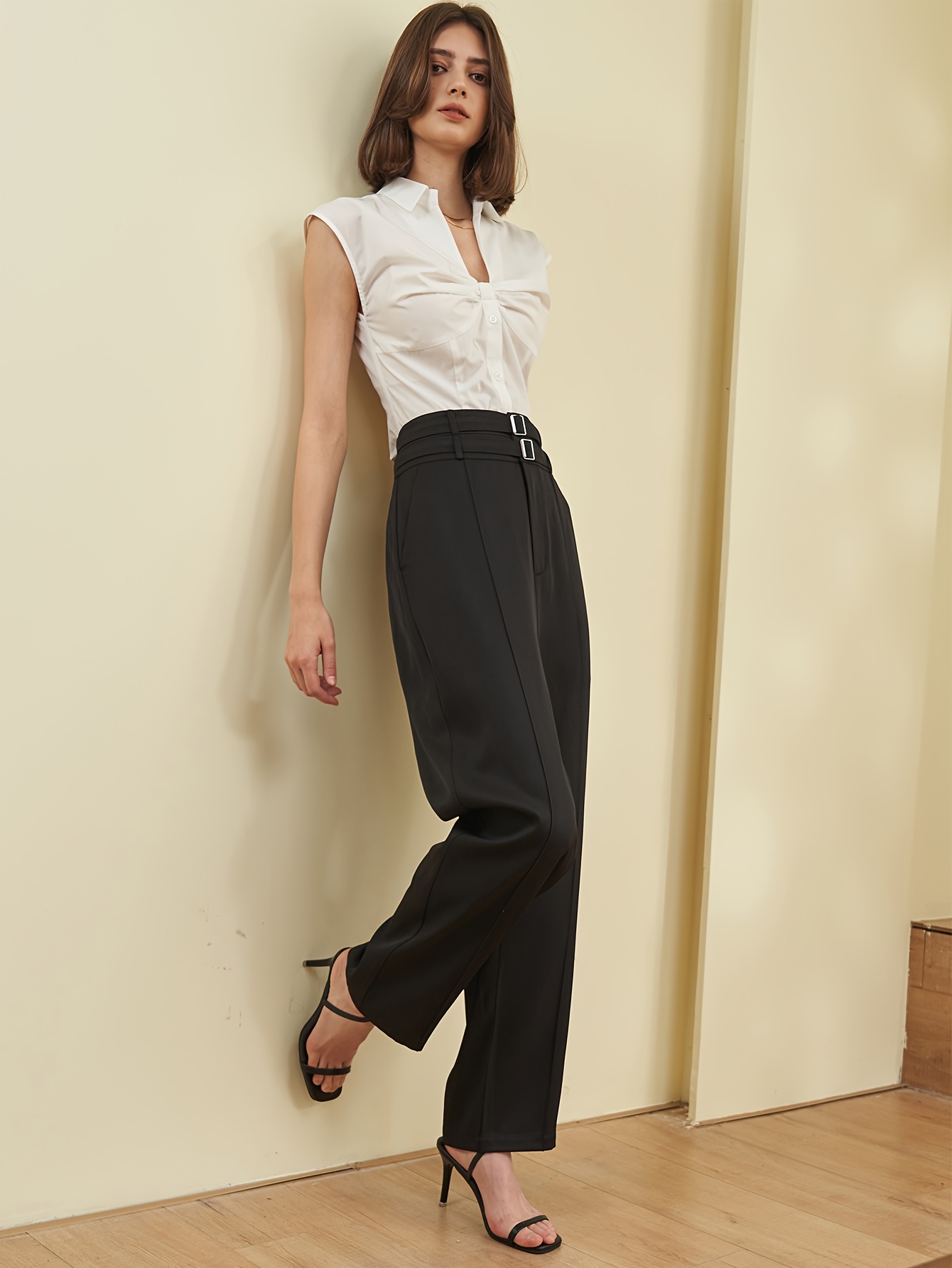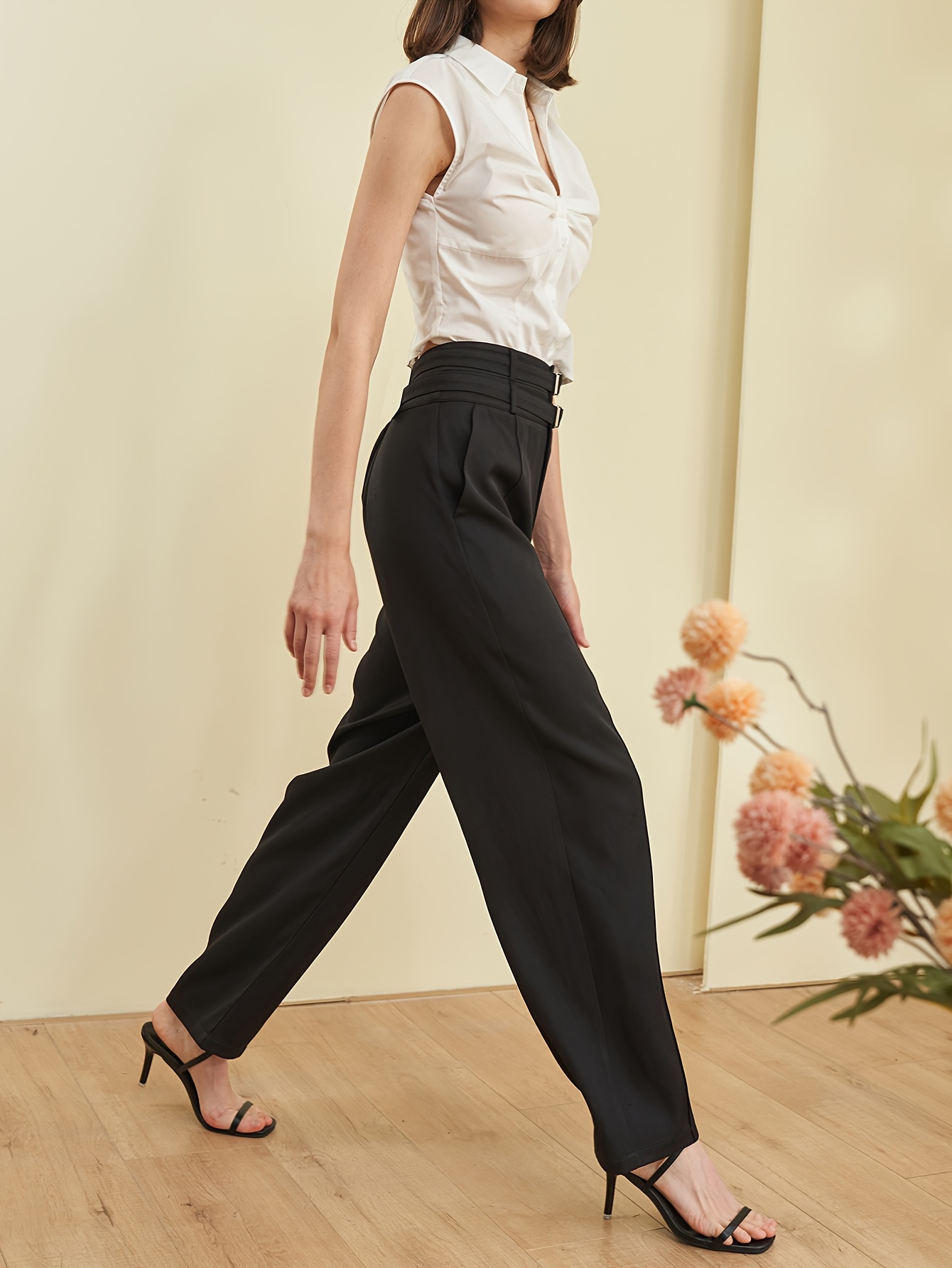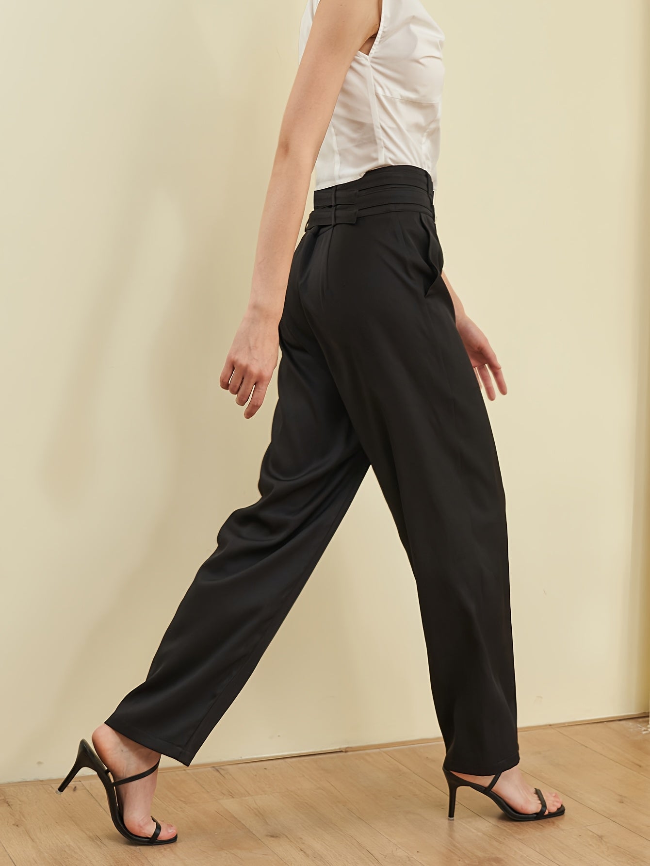 Pantalon Femme Taille Haute – Jambe Évasée, Noir Uni, Double Ceinture, Poches, Bureau et Décontracté, Printemps