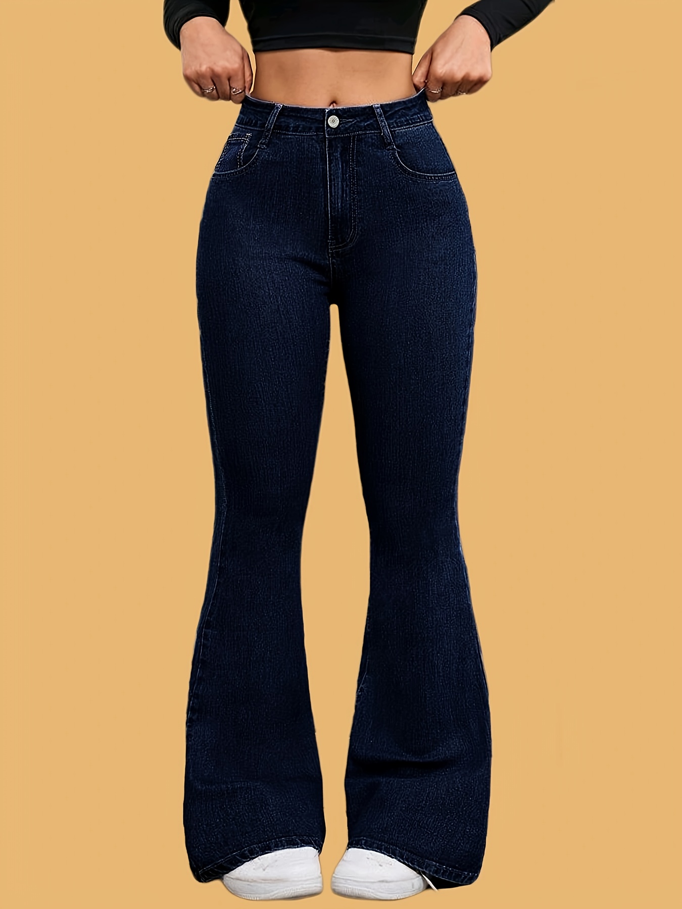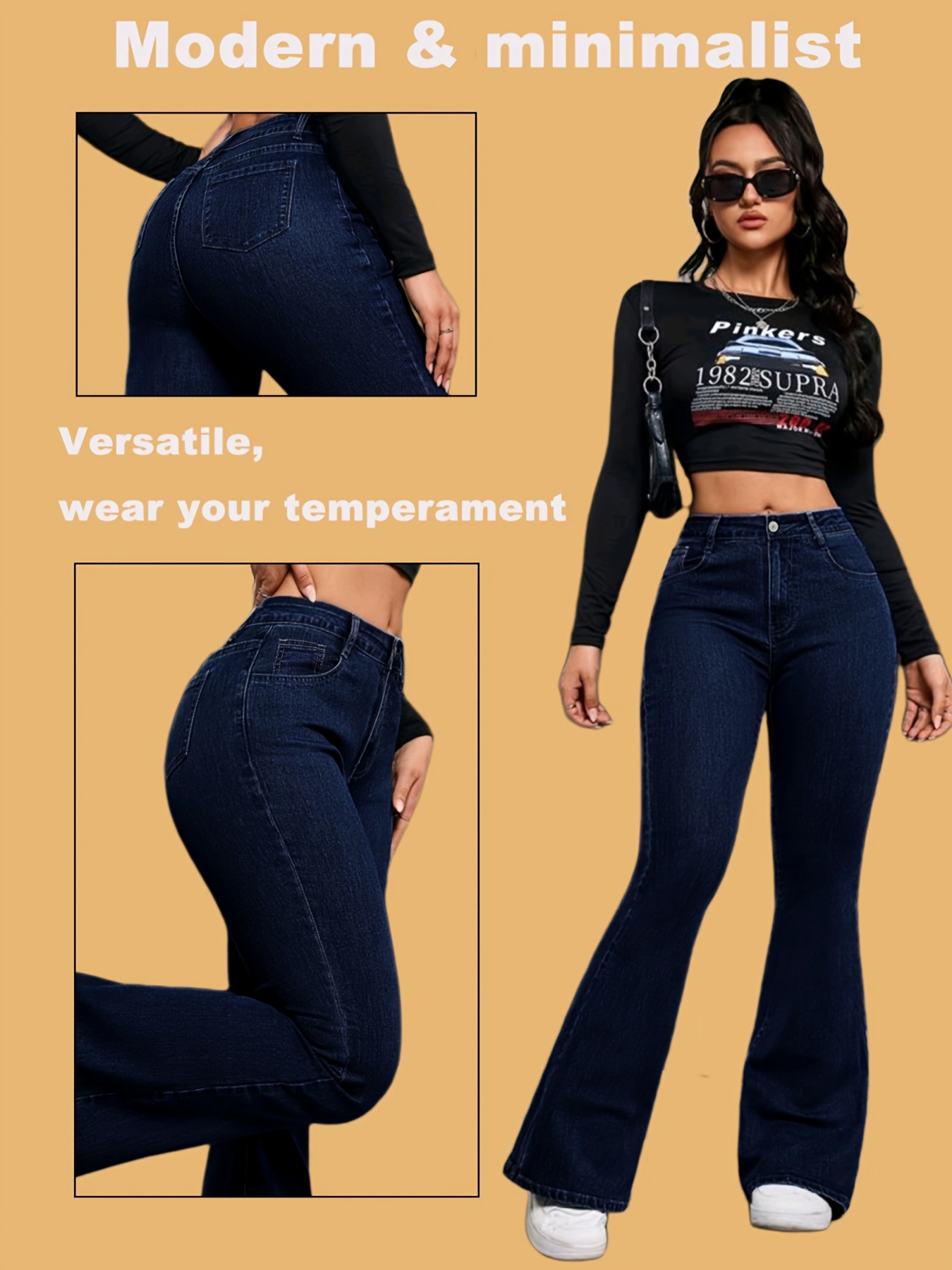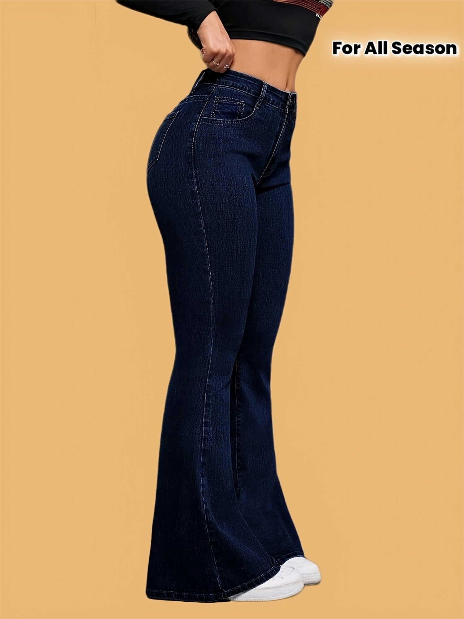 Jeans Femme Taille Haute Évasé Extensible Longueur Totale Boutons Élégant Toute Saison Confortable Polyvalent
