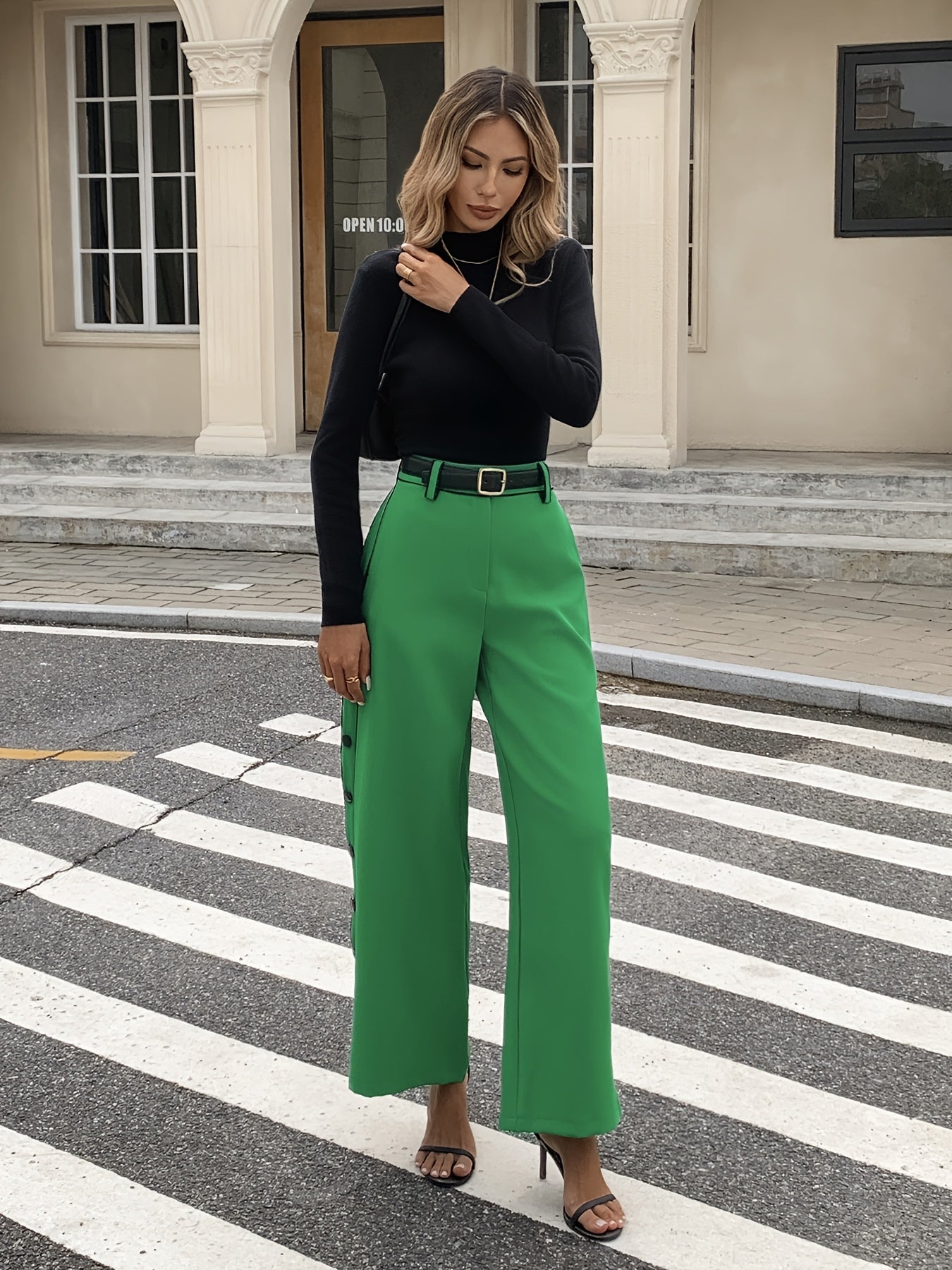 Pantalon Femme Taille Haute – Jambe Large, Bureau et Soirée, Sans Ceinture, Lavable en Machine, Décontracté et Formel, Détail Contrasté